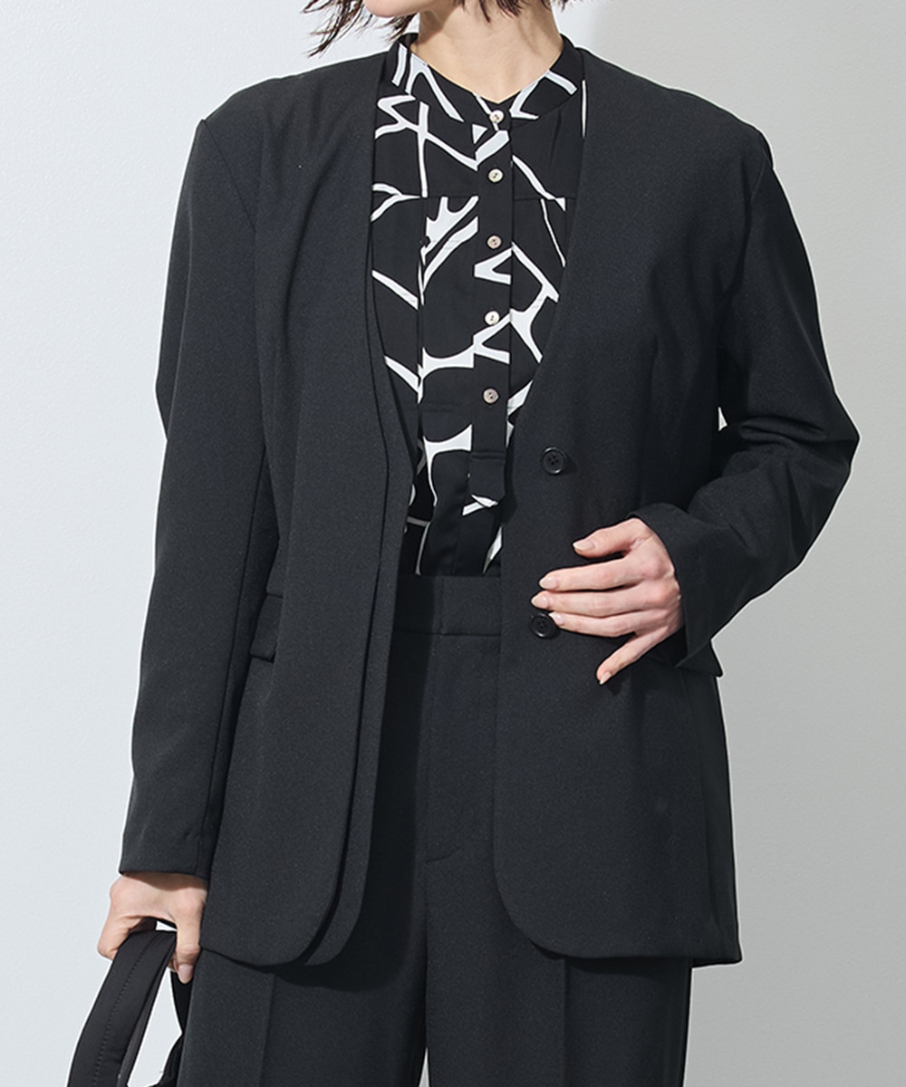 すっきりと体に馴染む美フォルムなノーカラー。女性らしいしなやかな曲線を際立たせ、袖を通すだけで背筋が伸びるような「きちんと感」を約束します。
