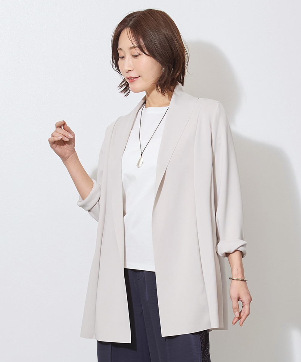 上質な光沢感がありつつも、実はカーディガン感覚で気軽に羽織れるしなやかさが自慢。シワを気にせず過ごせるため、長時間の着席や移動もストレスフリーに。