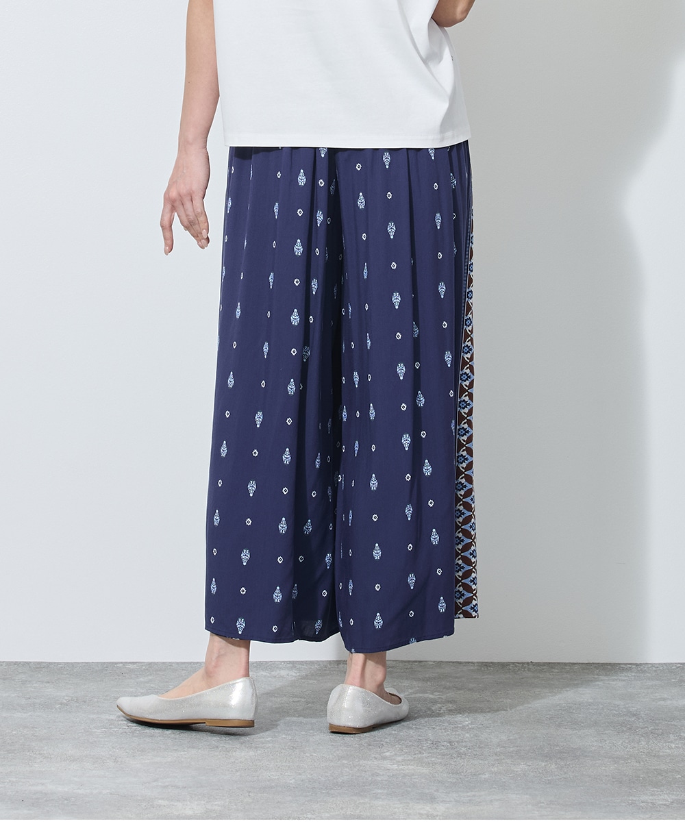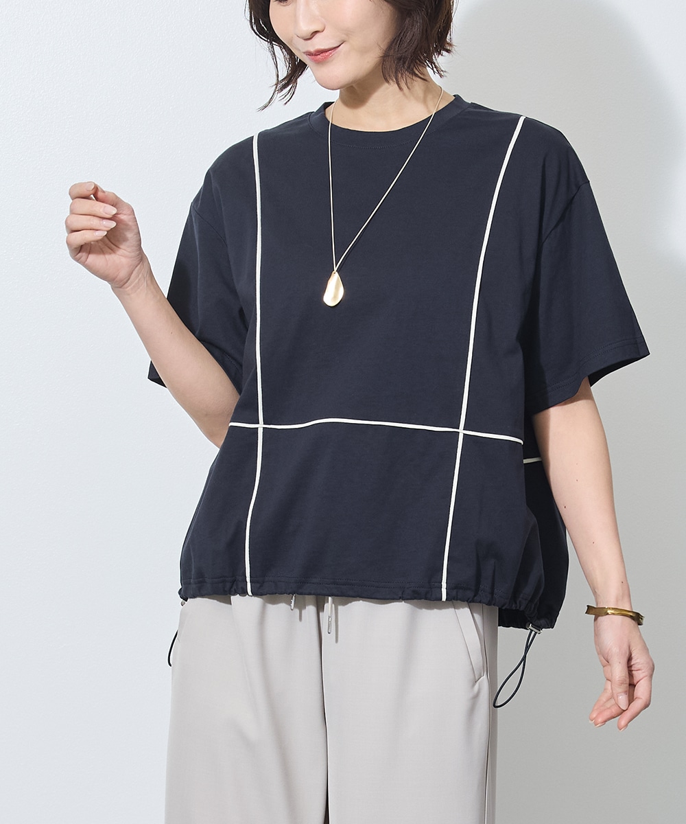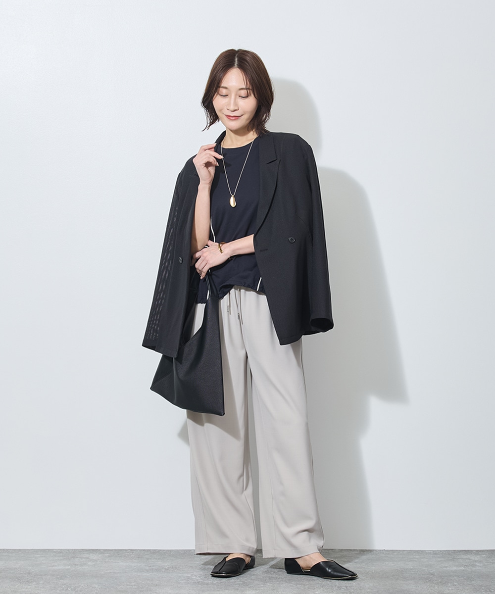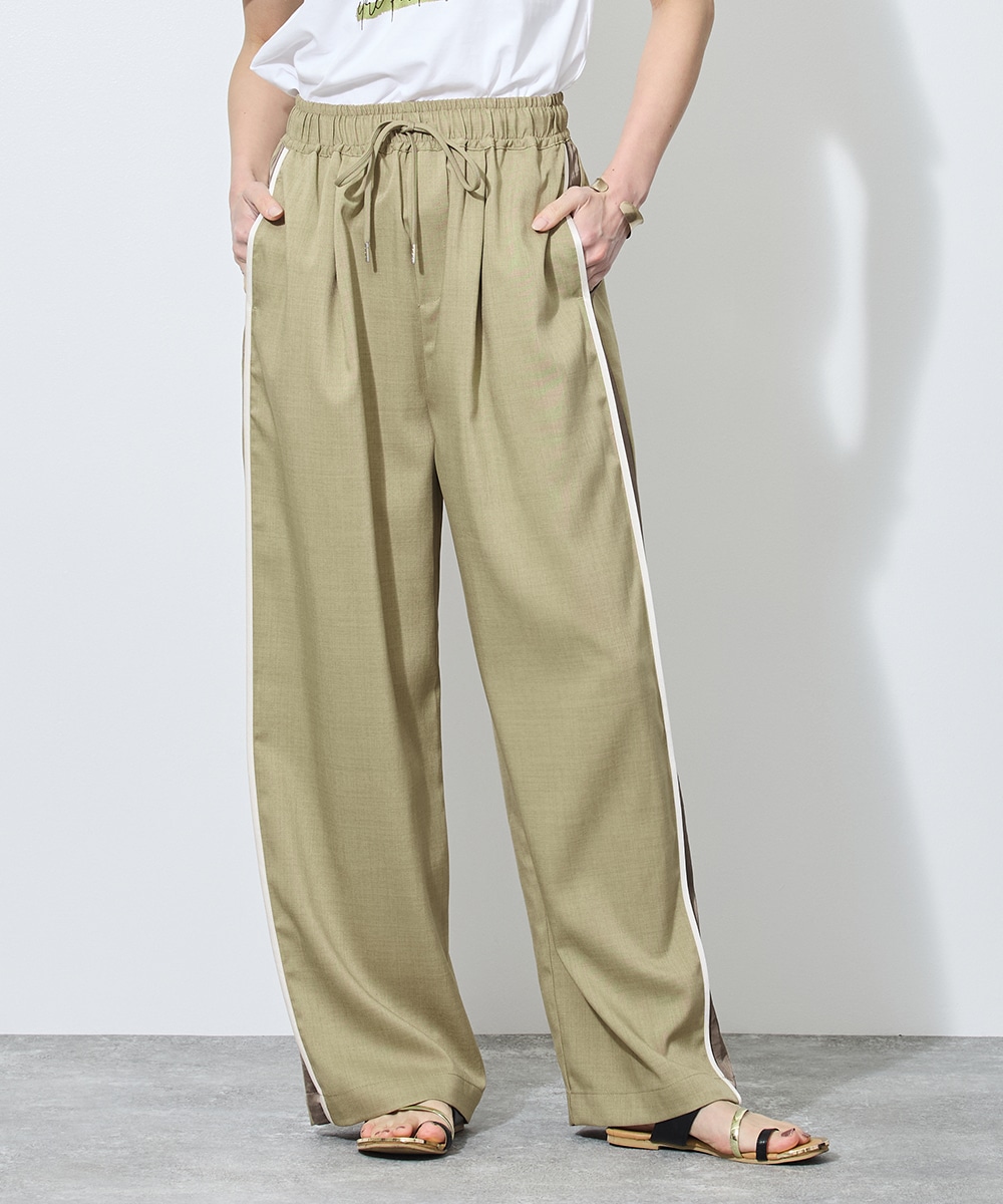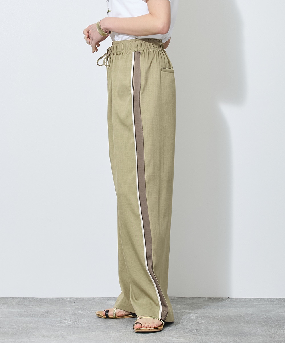 アウターを脱いだ瞬間、目を引くのは脇にあしらわれた配色パイピングのライン。この計算された一本の「縦線」が、ゆとりあるワイドシルエットに凛とした緊張感を与え、脚を驚くほどスッキリと長く見せてくれます。
