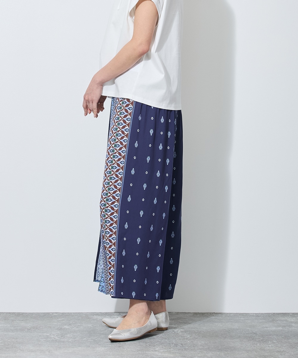 一見すると優雅なロングスカートのよう。実は、一枚の布を巻き付けるように仕立てた新感覚のパンツです。身体のラインを一切拾わないなめらかなフレアシルエットは、レーヨン素材特有の美しい落ち感によるもの。