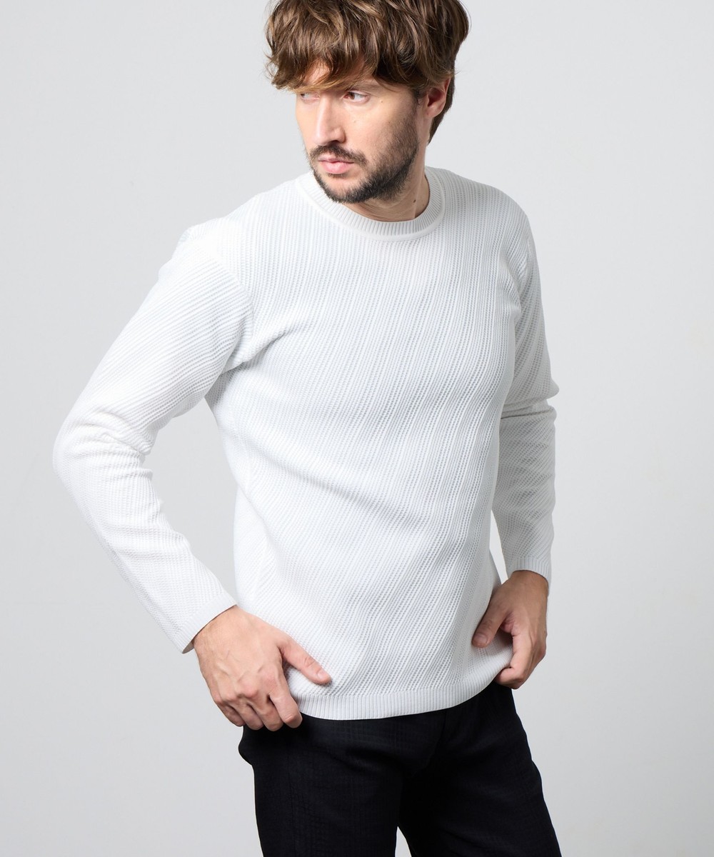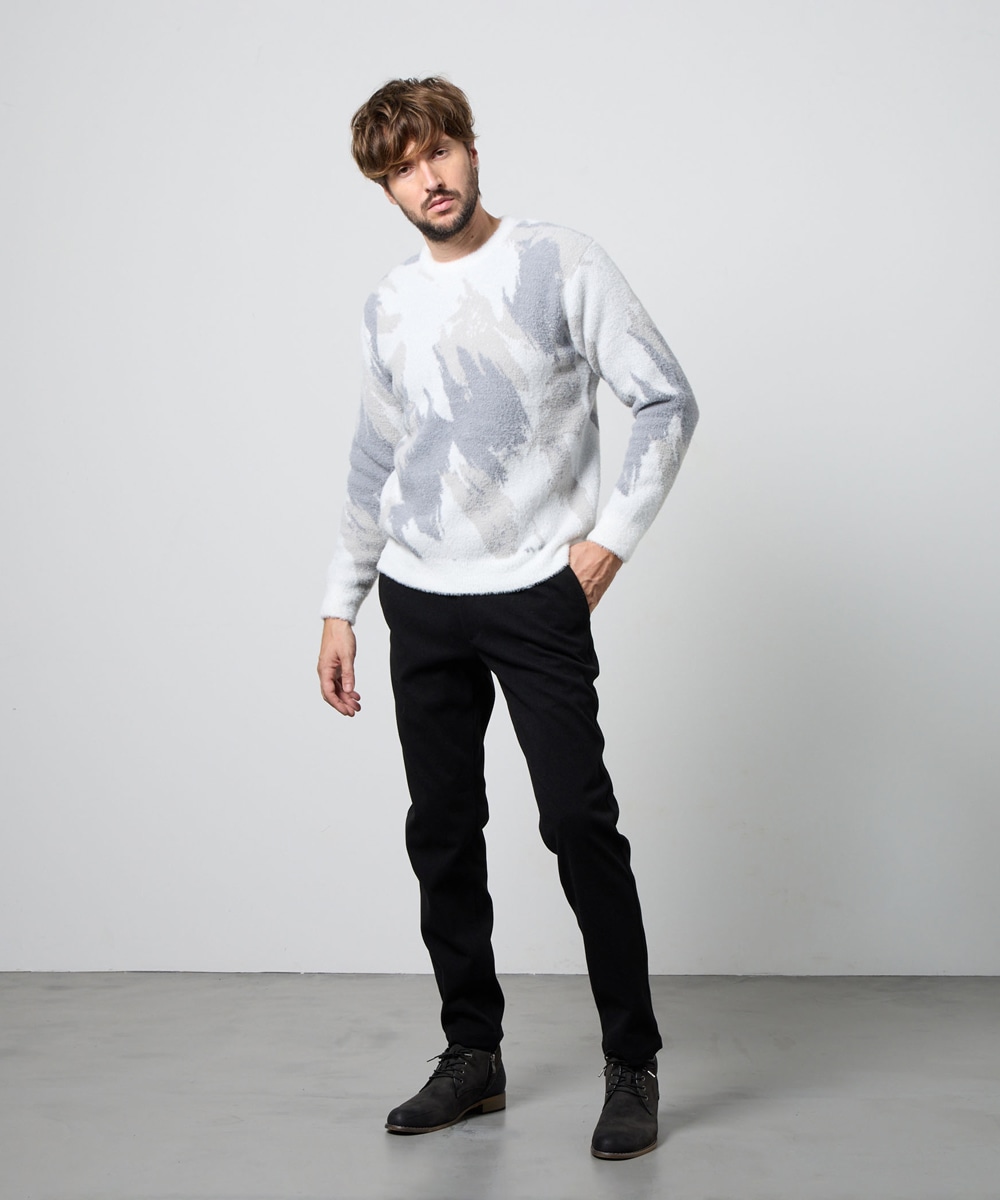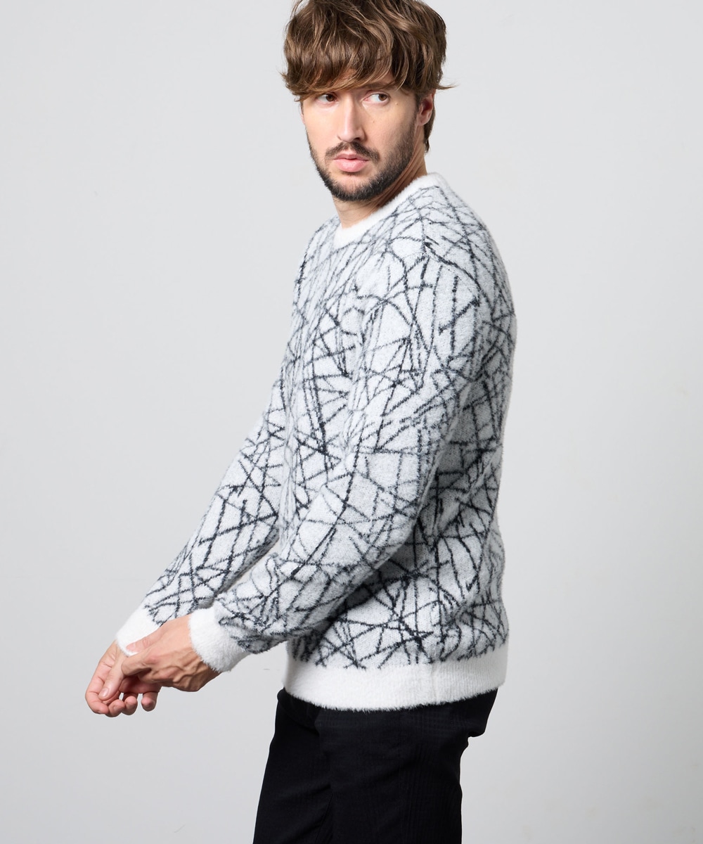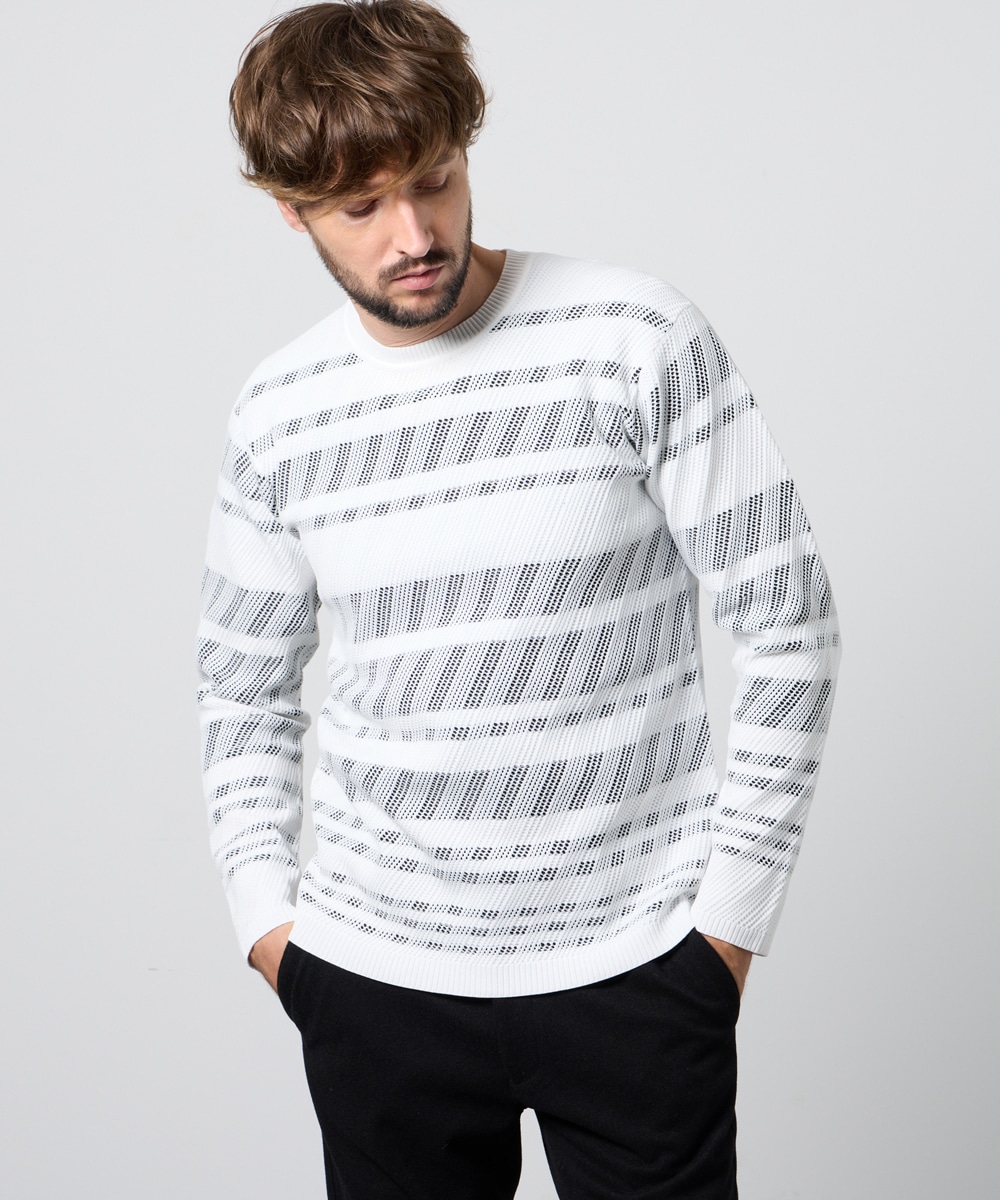 オフとブラックの2色を2柄で展開した全4色展開。91/92は3色の糸を使用したインパクト抜群のハケメ柄。93/94は2色の糸で太ラインと細ラインをかけあわせてメリハリを表現したライン柄。トレンド感のある総柄デザインは一枚着でもインナーに差してもコーディネートのアクセントになってくれること間違いなしです。