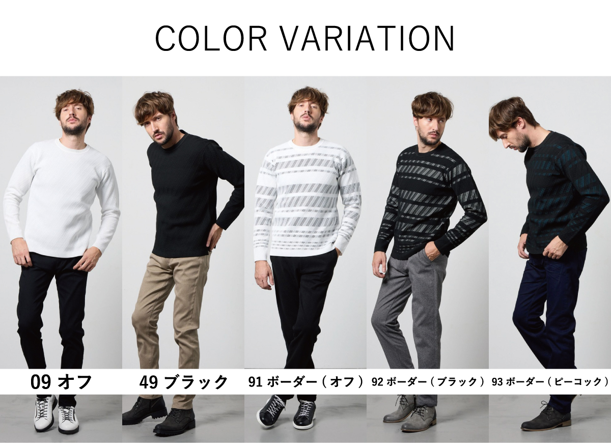09(オフ)と49(ブラック)は無地、91(オフ)、92(ブラック)、93(ピーコック)はオリジナルのランダムボーダー柄を採用した全5色展開。トレーナー感覚で秋から春まで3シーズンご着用いただける息の長いアイテムです。