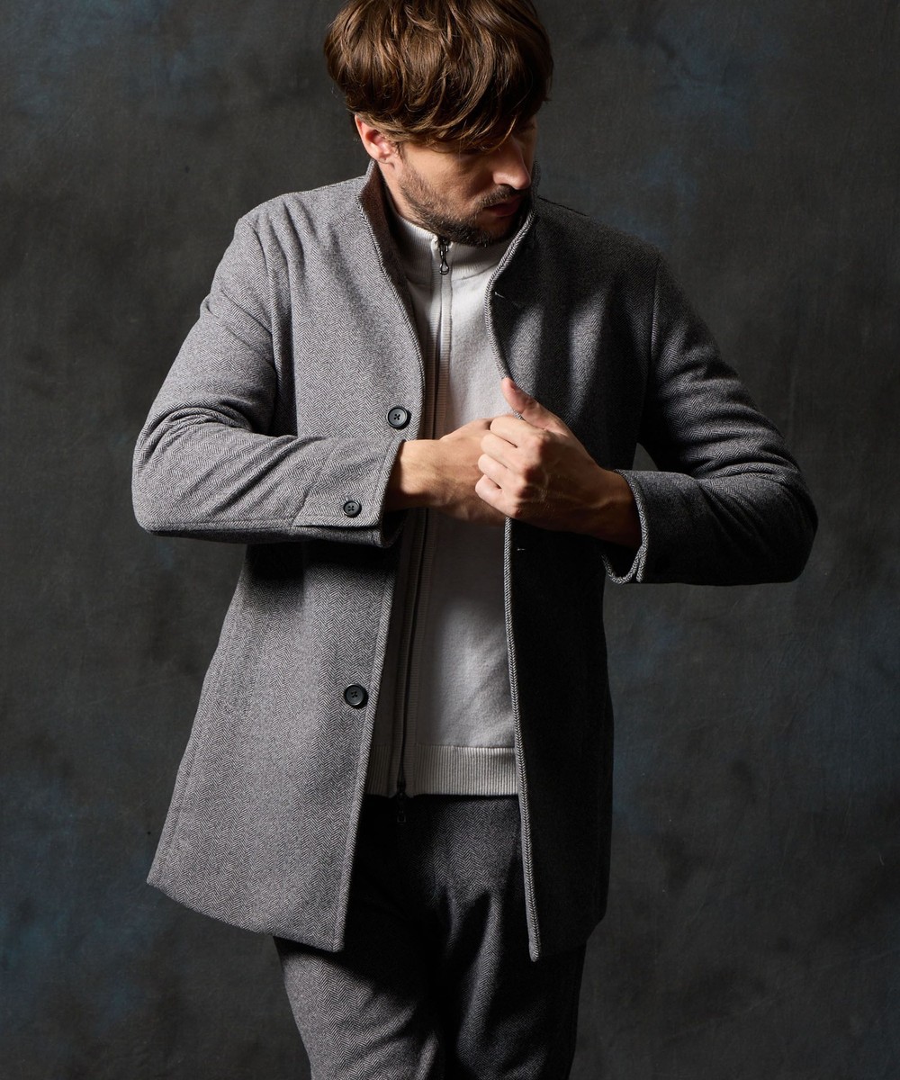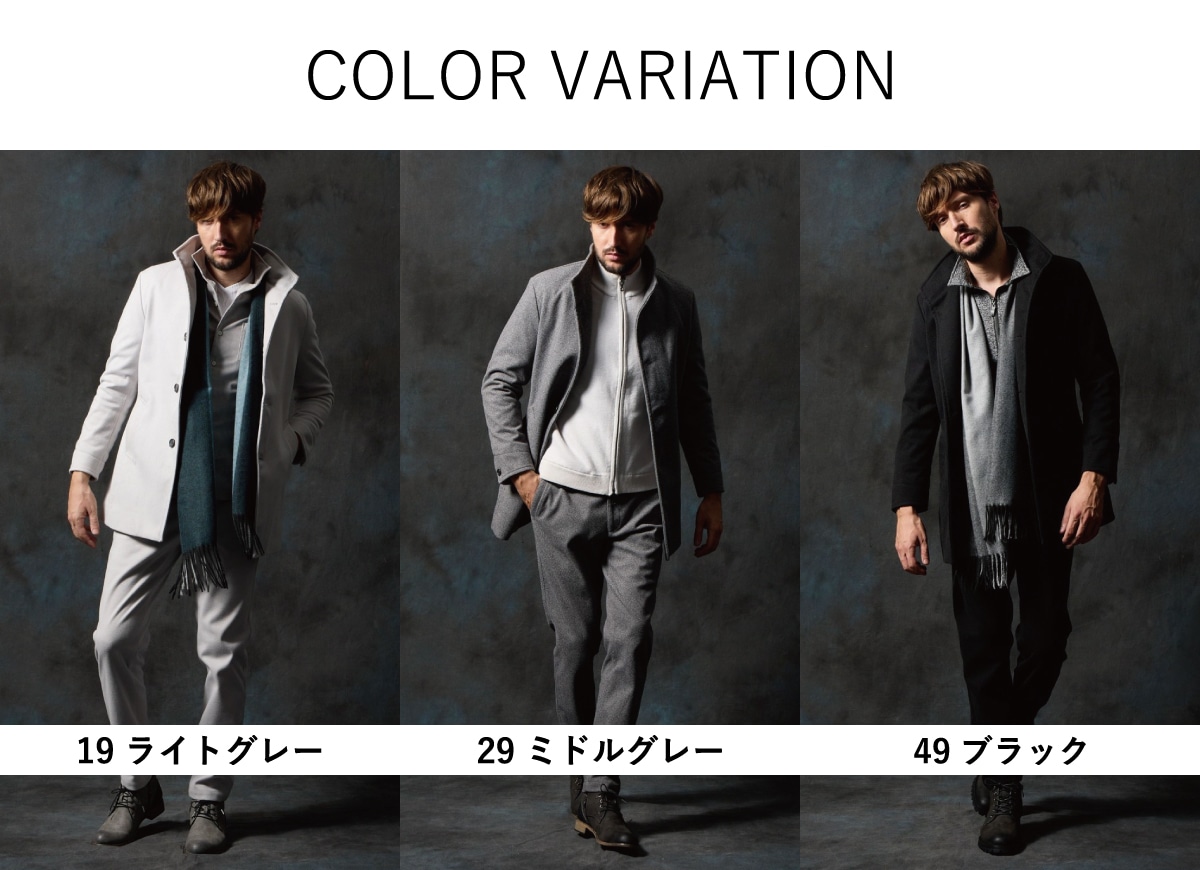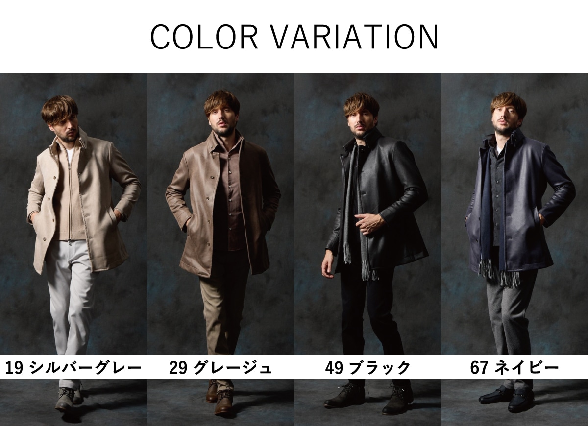 ビジネスシーンを含めオンオフ問わずに着回しやすいモノトーンカラーの全3色展開。長期間ご着用いただけるよう総裏仕様にしました。衿端にはワイヤーを入れておりスタンドでも折り返してもVゾーンを綺麗に見せてくれます。シンプルがゆえにパンツやインナーの着合わせを問わない万能コートです。