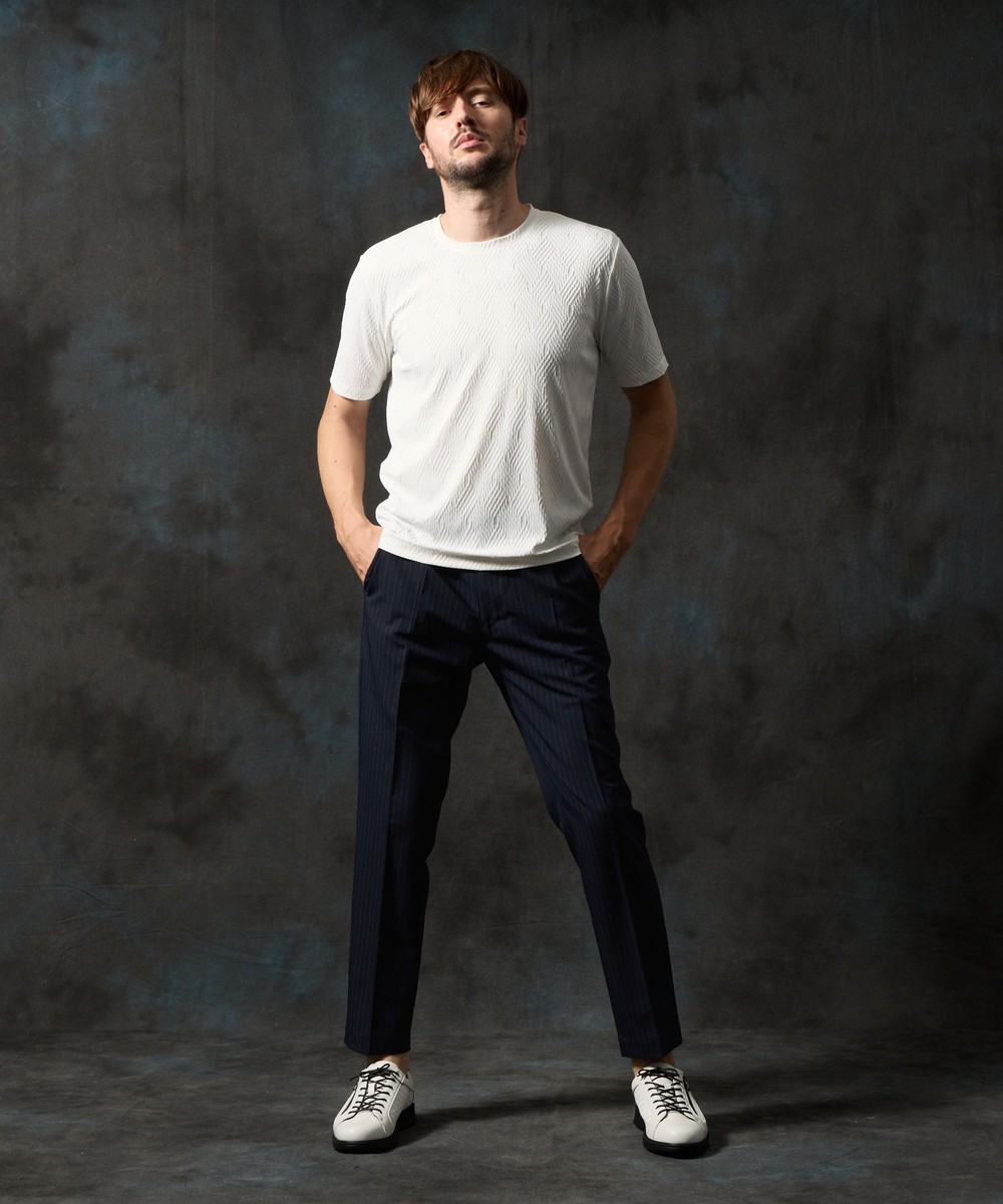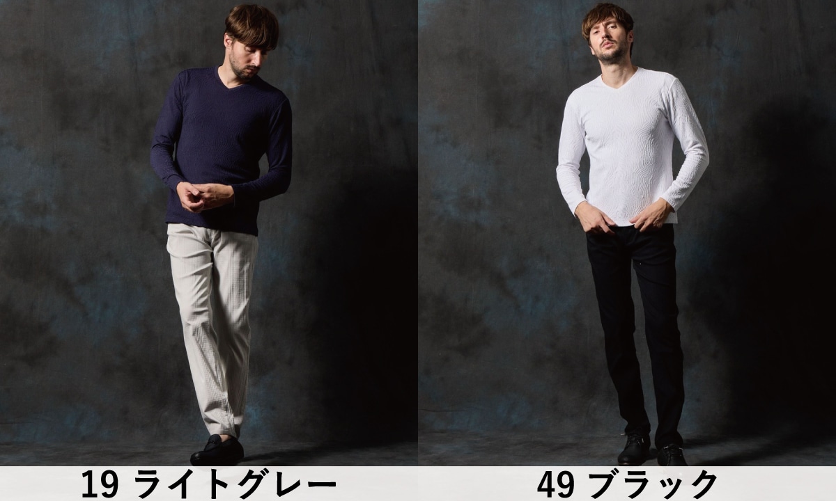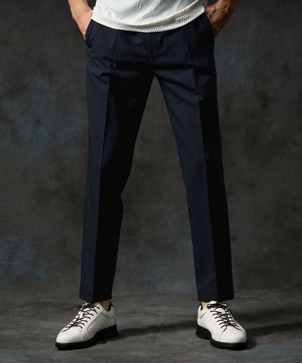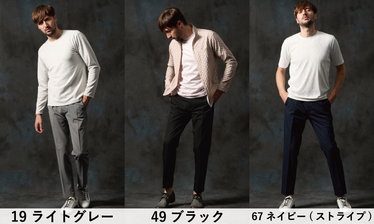 合わせやすいベーシックカラーの全3色展開。67ネイビーはストライプ柄のプリントを施して少しクラシカルなイメージでもご着用いただけます。ジャケットに合わせたビジカジスタイルのパンツとしても活躍してくれます。
