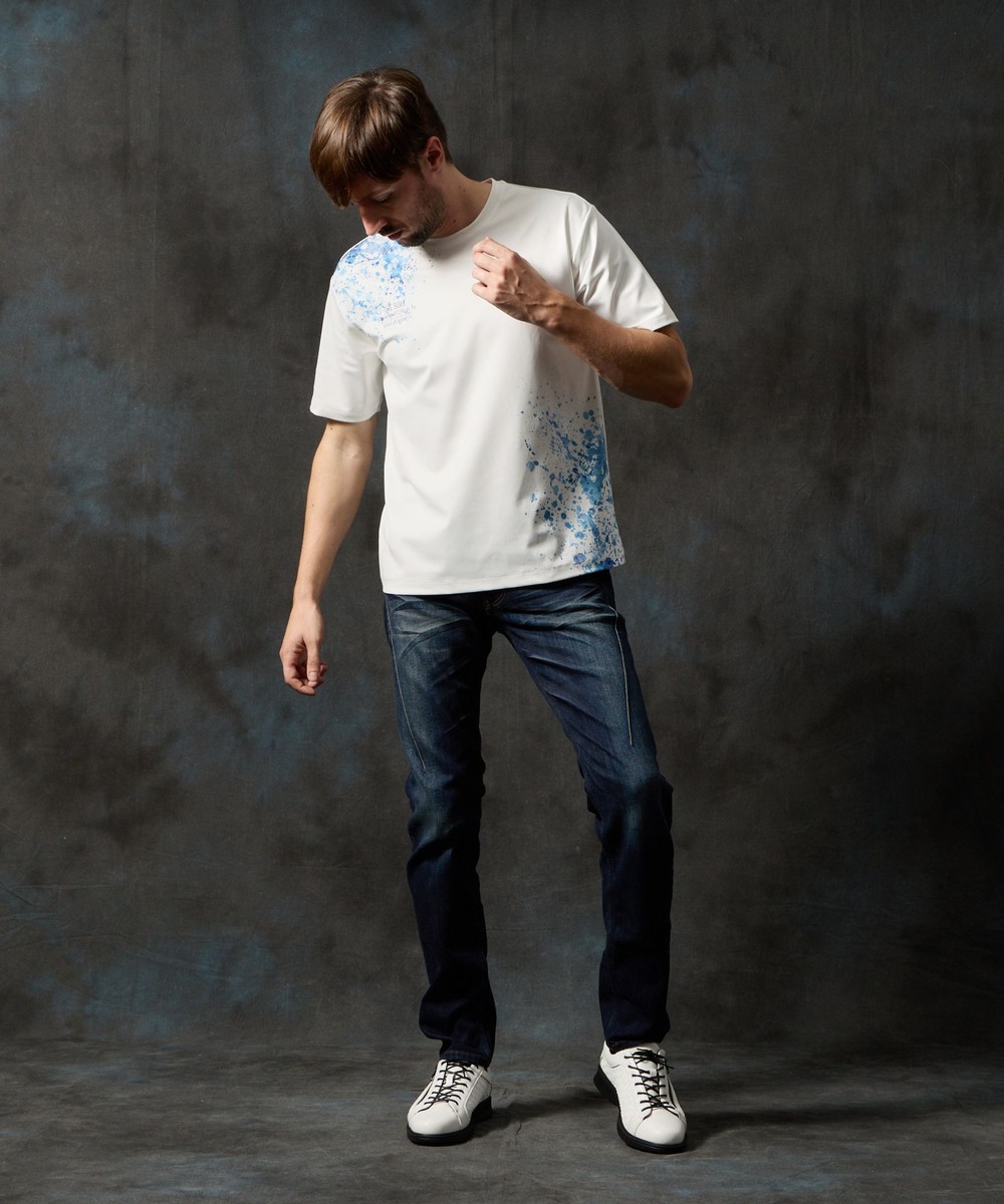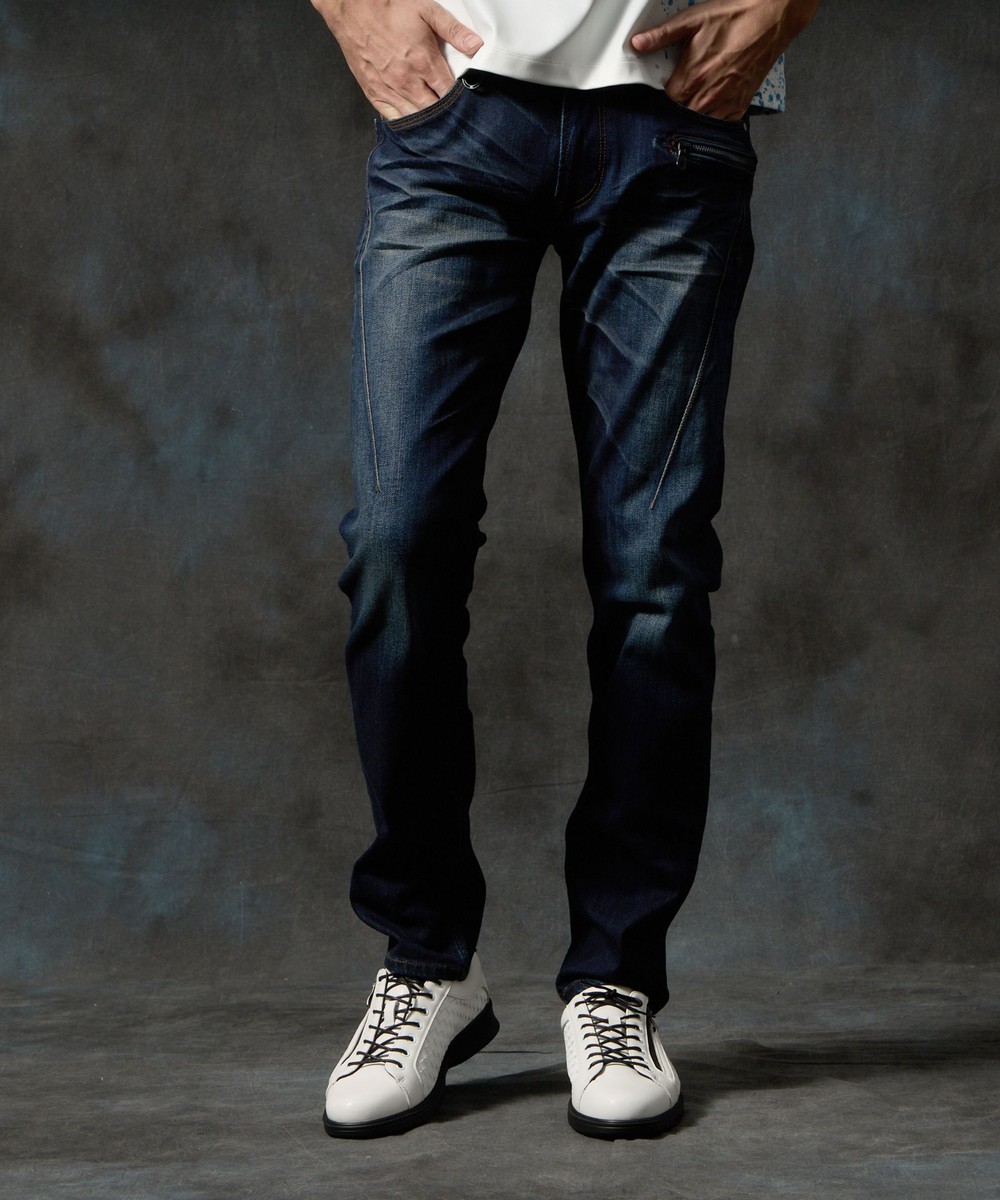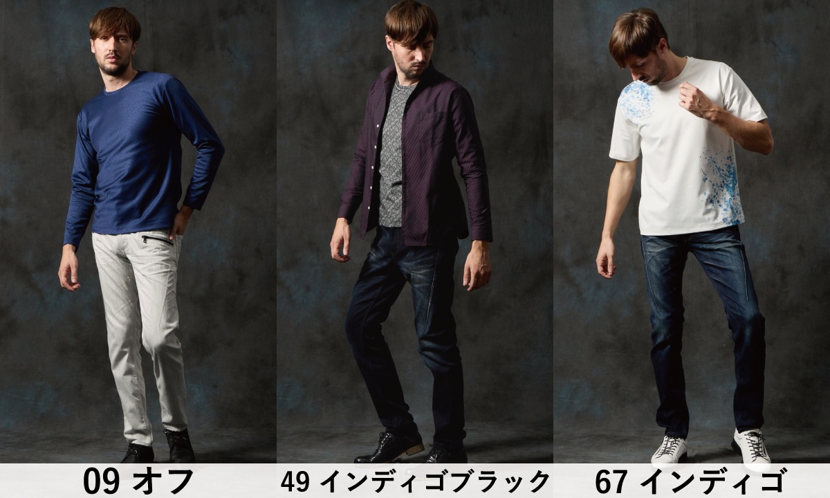 緯糸に黒色の糸を使用して奥行のある色目を表現した09オフと加工の異なるインディゴ系2色を含めた全3色展開。コーディネートに合わせやすいベーシックカラーでジャケットやブルゾン等、着合わせを問わずスタイリングが可能です。
