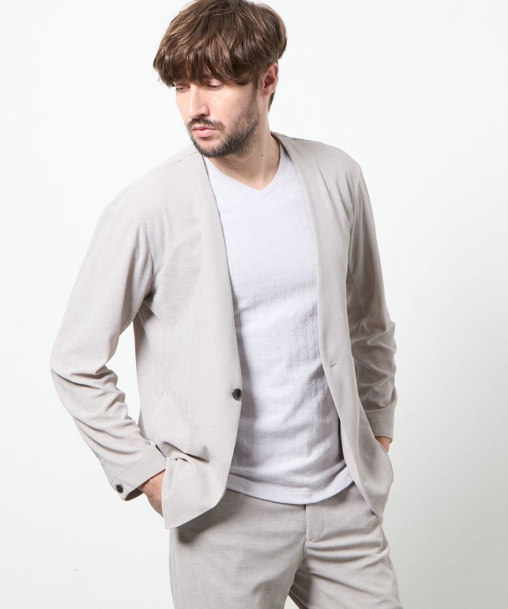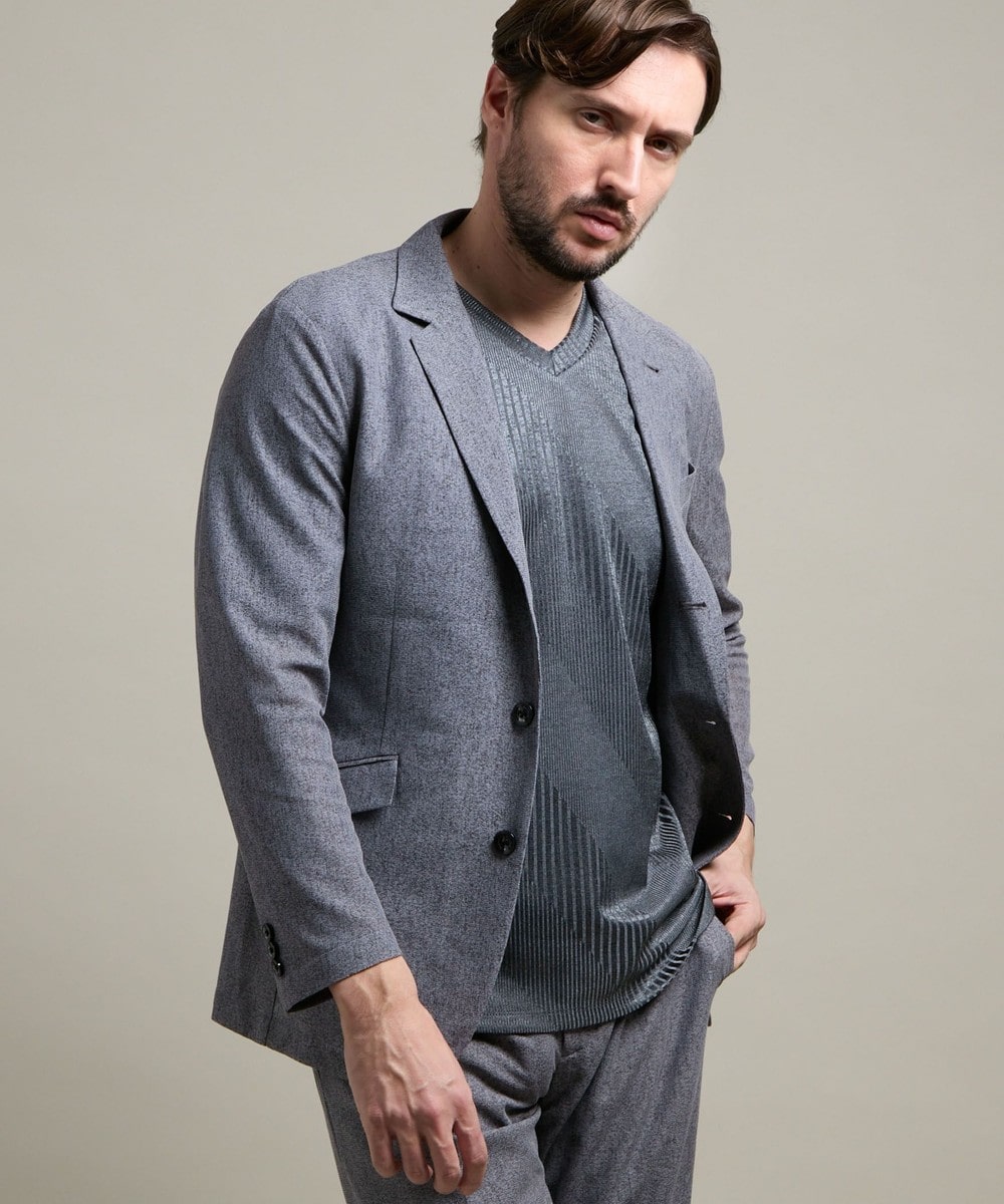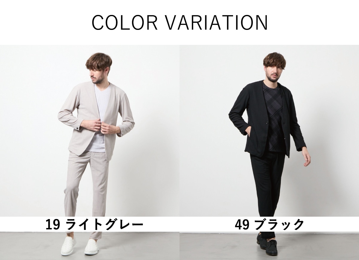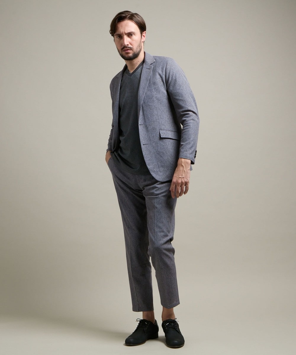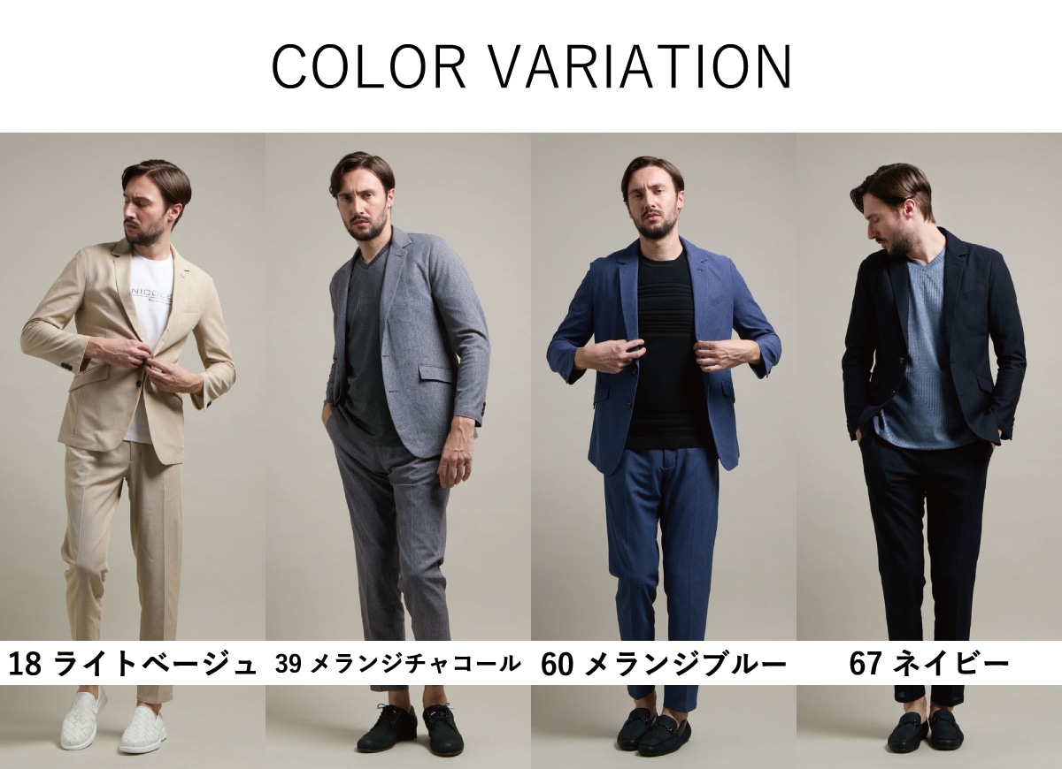 春らしいベージュや鮮やかなブルーもご用意した好みに応じてお選びいただきやすい全4色展開。メランジ調の色の出方が奥行きのある高級感を演出しています。インナーにはドレスシャツはもちろんカジュアルなTシャツ合わせ、足元も革靴からスニーカーまで幅広いスタイリングに対応ができます。1セット持っていると非常に重宝するセットアップです。
