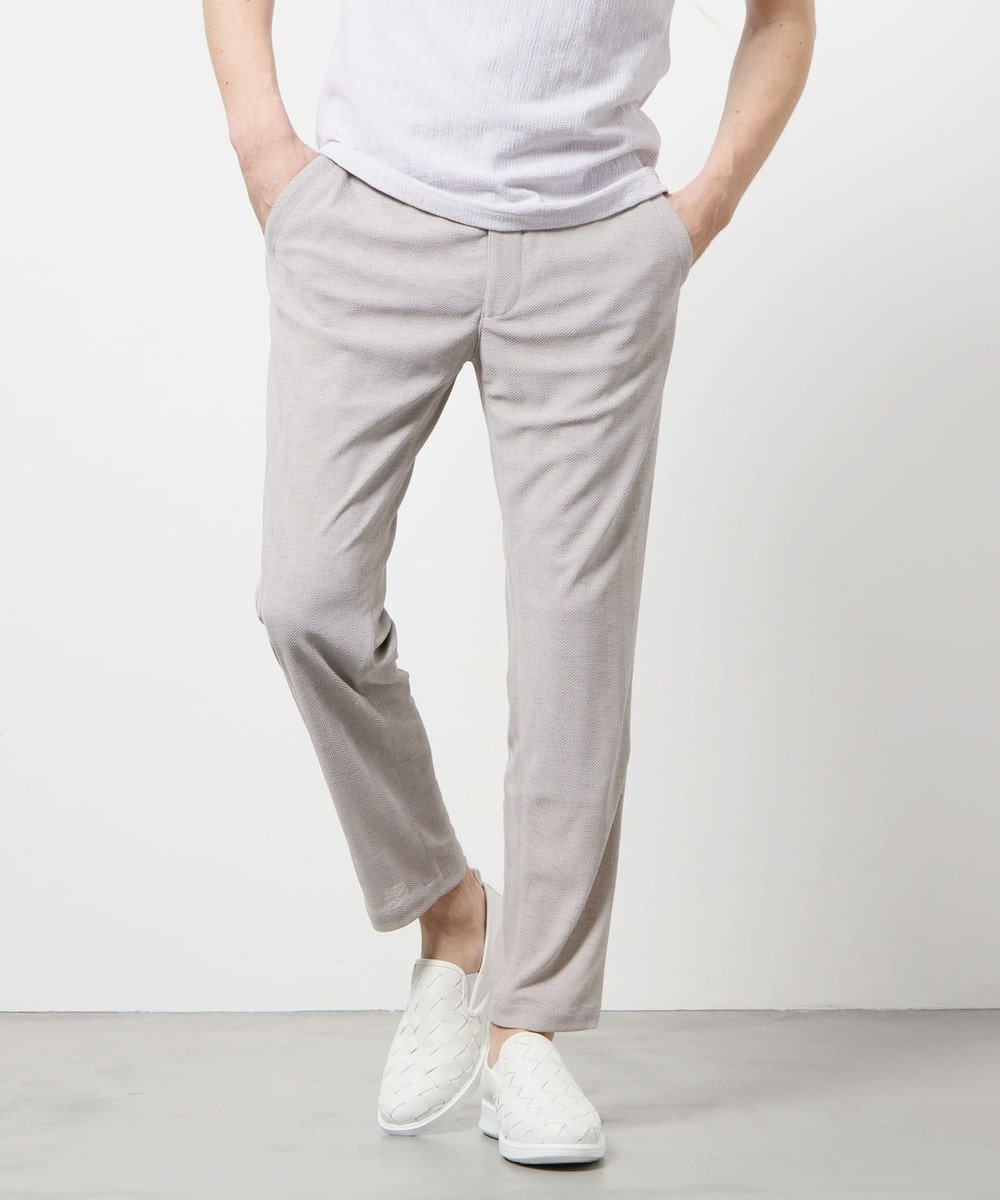 ベーシックカラーの全2色展開。19ライトグレーは春らしさの引き立つ淡めのグレーでヘリンボン柄の出方も鮮明です。同系色でまとめたワントーンコーディネートもオススメです。49ブラックは使い勝手を意識して一見無地見えするように仕上げています。同系色でのスタイリングはもちろん、淡色のインナーを差したパキッとしたコントラストのあるスタイリングもお楽しみいただけます。