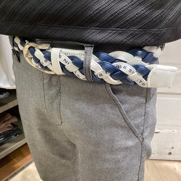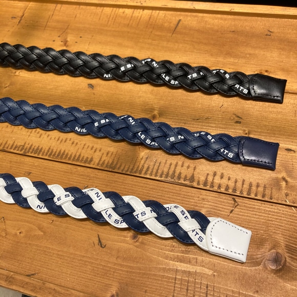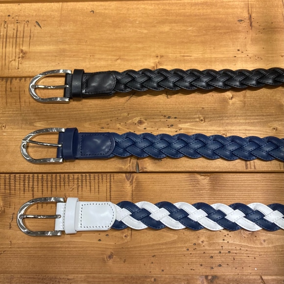 ツヤ感のある合成皮革をテープ使いして編み込んだメッシュベルト