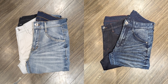 インディゴ染のデニム3色(ブルー・サックス・濃インディゴ)と