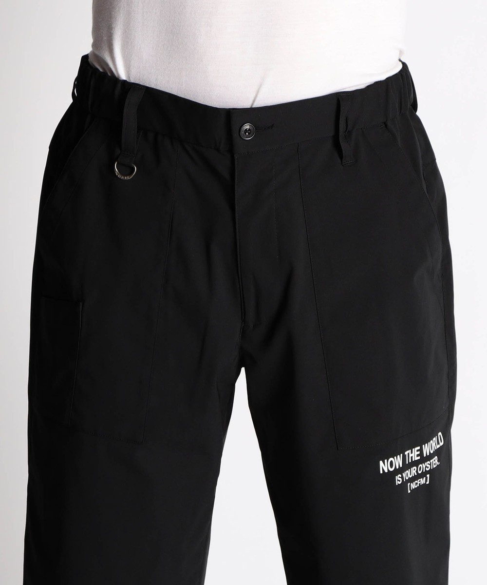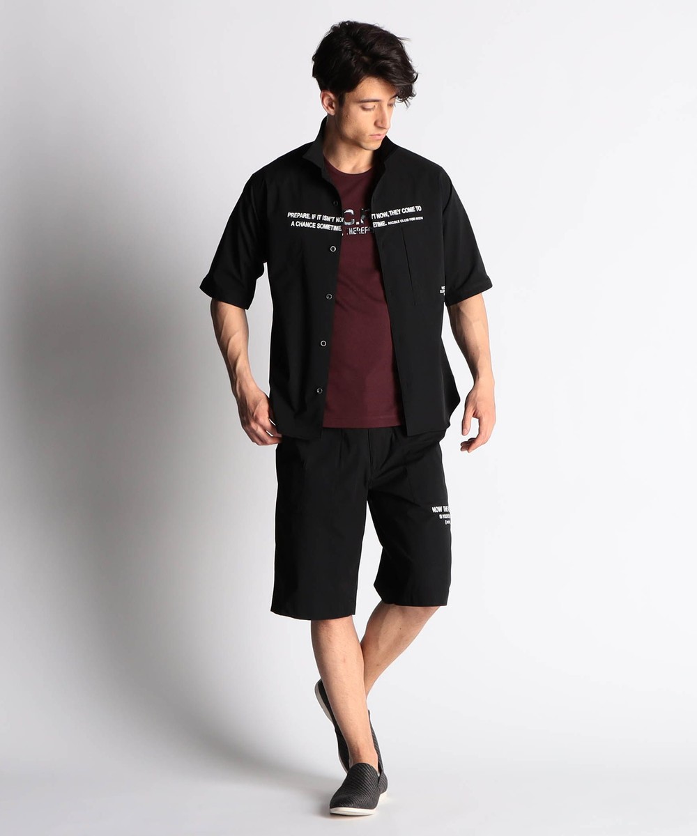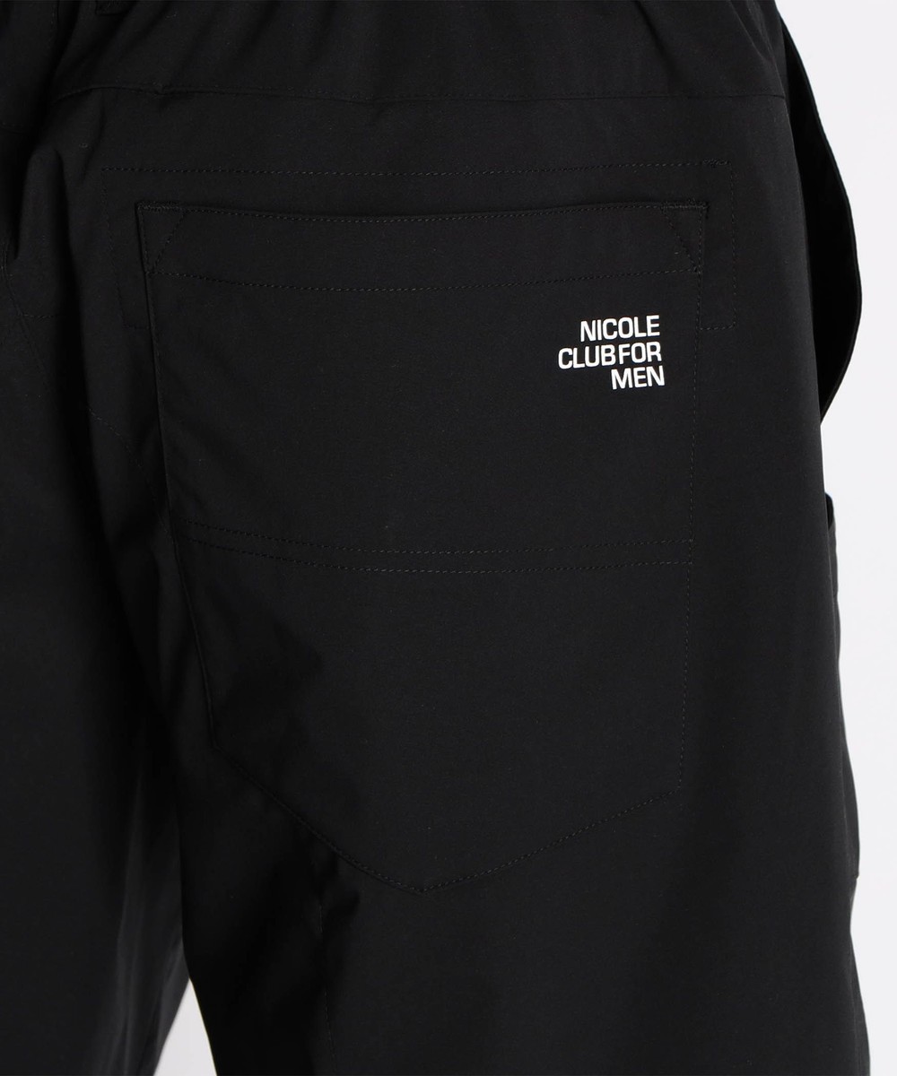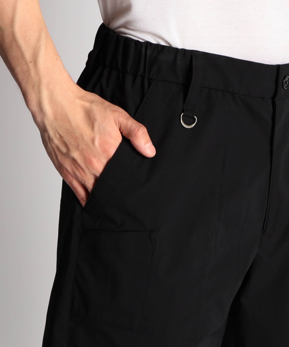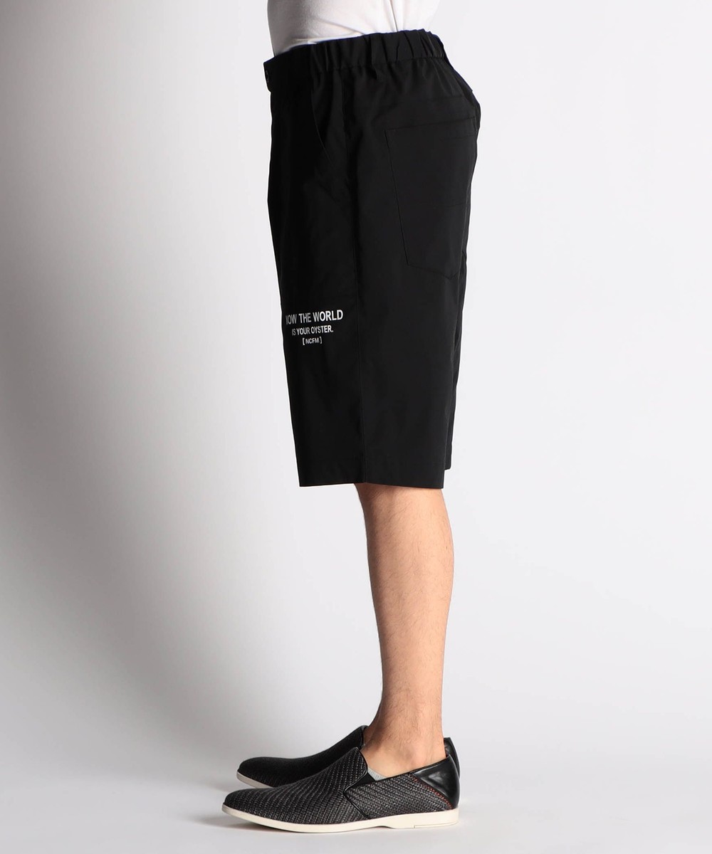 「ミノテック」と言う帝人フロンティア(株)が開発した素材のベイカー風ハーフパンツです。「ミノテック」は稲(イネ)が持つ撥水メカニズムを繊維で再現しています。生地表面の縦方向に水滴を流す構造にする事で、水滴を滑らせ、雨を避ける特性をもたせています。ウエストに平ゴムとスピンドルを通したイージーパンツ仕様でオーバーサイズ設定の太めシルエット。左前と右後にロゴプリントを施してアクセントにしています。サラッとした風合いとストレッチが効いて穿きやすいです。