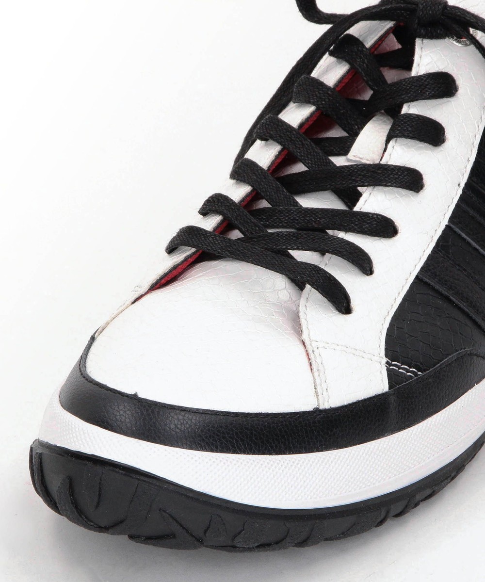 エキゾチックなパイソン調のシンセティックレザーがアッパーのメイン。シューレースパーツなど部分的に小シボの入ったソフトな牛革を使用しています。ライニングとインソールには赤のポリエステルメッシュ素材を採用していますが、色落ちの生地データはクリアしたものを使用しています。