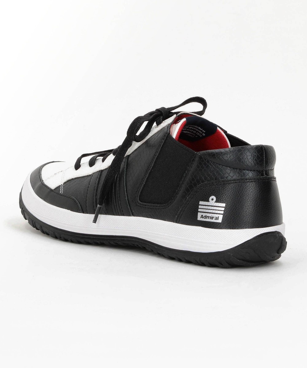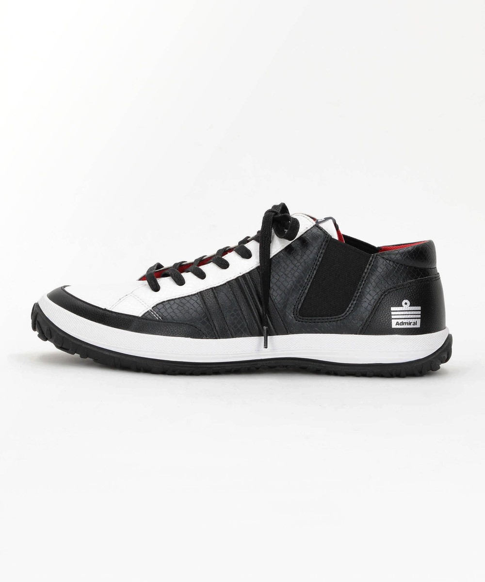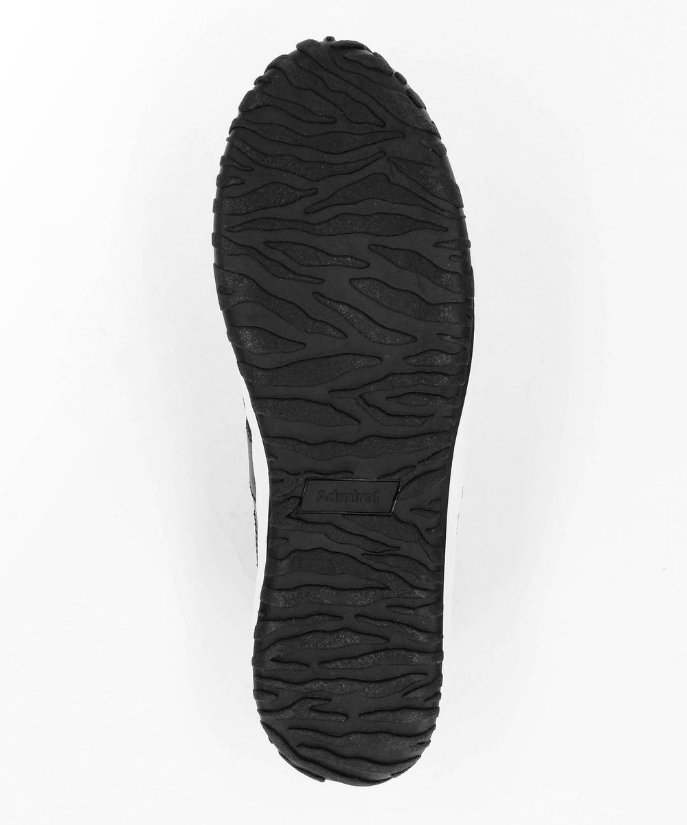 アドミラルの別注スニーカー。サイドゴアデザインのミッドカットタイプになります。特徴的な素材を使用、オリジナリティの高いスニーカーです。91その他2は、白と黒のモノトーン配色になります。シューレースはロウ引きをした光沢感のある平紐を採用。かかとの外側にはアドミラル、内側にはブランドロゴをシルバーで印字しています。インソールには通気性が高く、ヒール部分にジェルを入れたクッション性の高い物を採用。履き口のクッションやポリエステルメッシュのライニング仕様にする事で足入れとフィット感を良くしています。少しトゥスプリングの効いたシャープなラスト(木型)はスラックスなどの綺麗めパンツにも合わせやすいです。