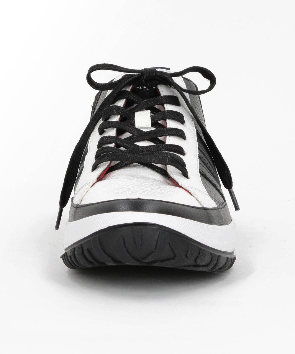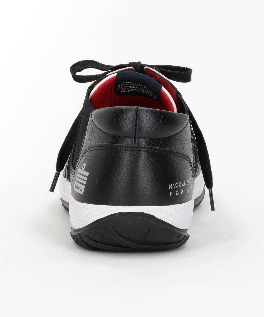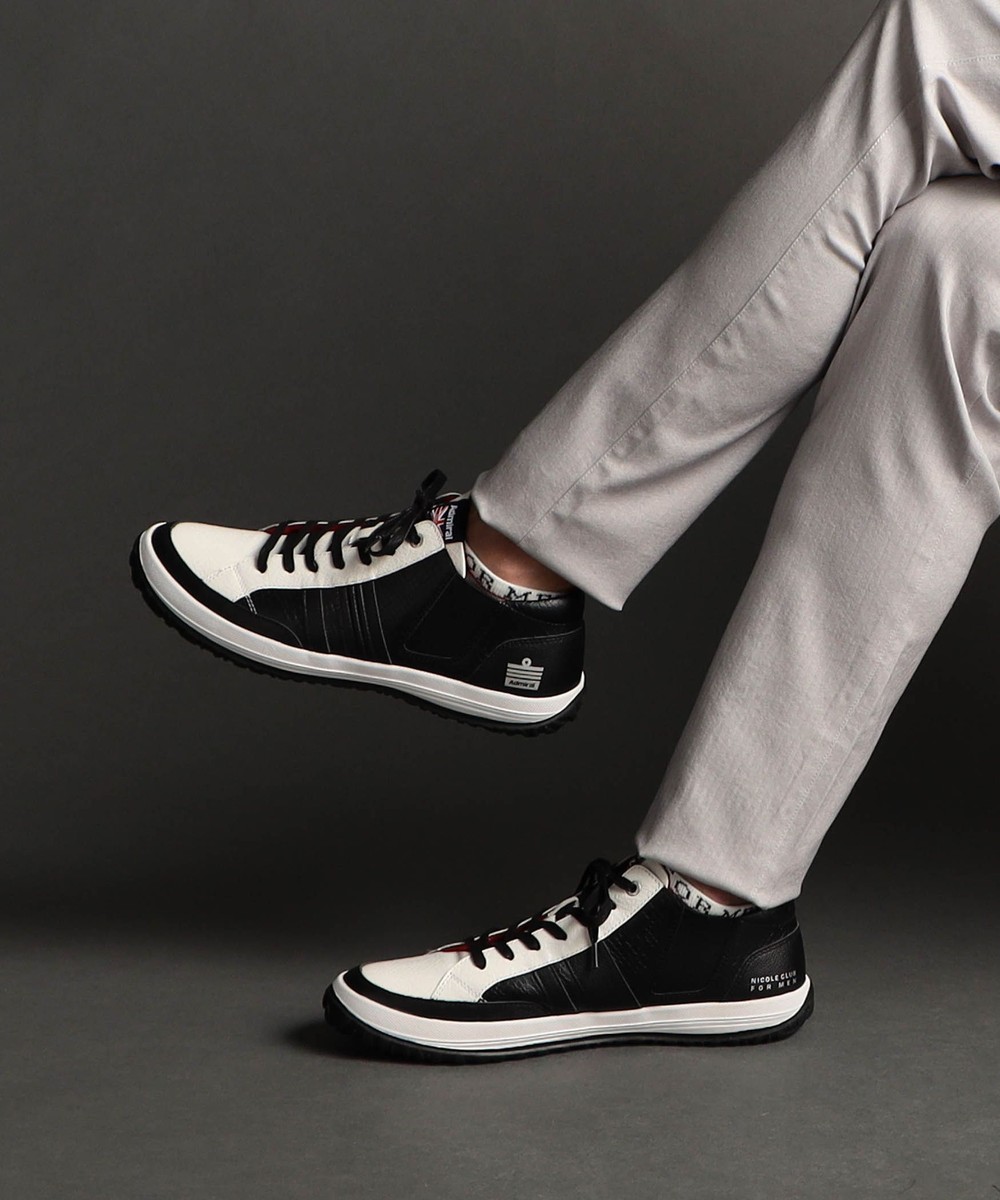 アドミラルの別注スニーカー。サイドゴアデザインのミッドカットタイプになります。特徴的な素材を使用、オリジナリティの高いスニーカーです。91その他2は、白と黒のモノトーン配色になります。シューレースはロウ引きをした光沢感のある平紐を採用。かかとの外側にはアドミラル、内側にはブランドロゴをシルバーで印字しています。インソールには通気性が高く、ヒール部分にジェルを入れたクッション性の高い物を採用。履き口のクッションやポリエステルメッシュのライニング仕様にする事で足入れとフィット感を良くしています。少しトゥスプリングの効いたシャープなラスト(木型)はスラックスなどの綺麗めパンツにも合わせやすいです。