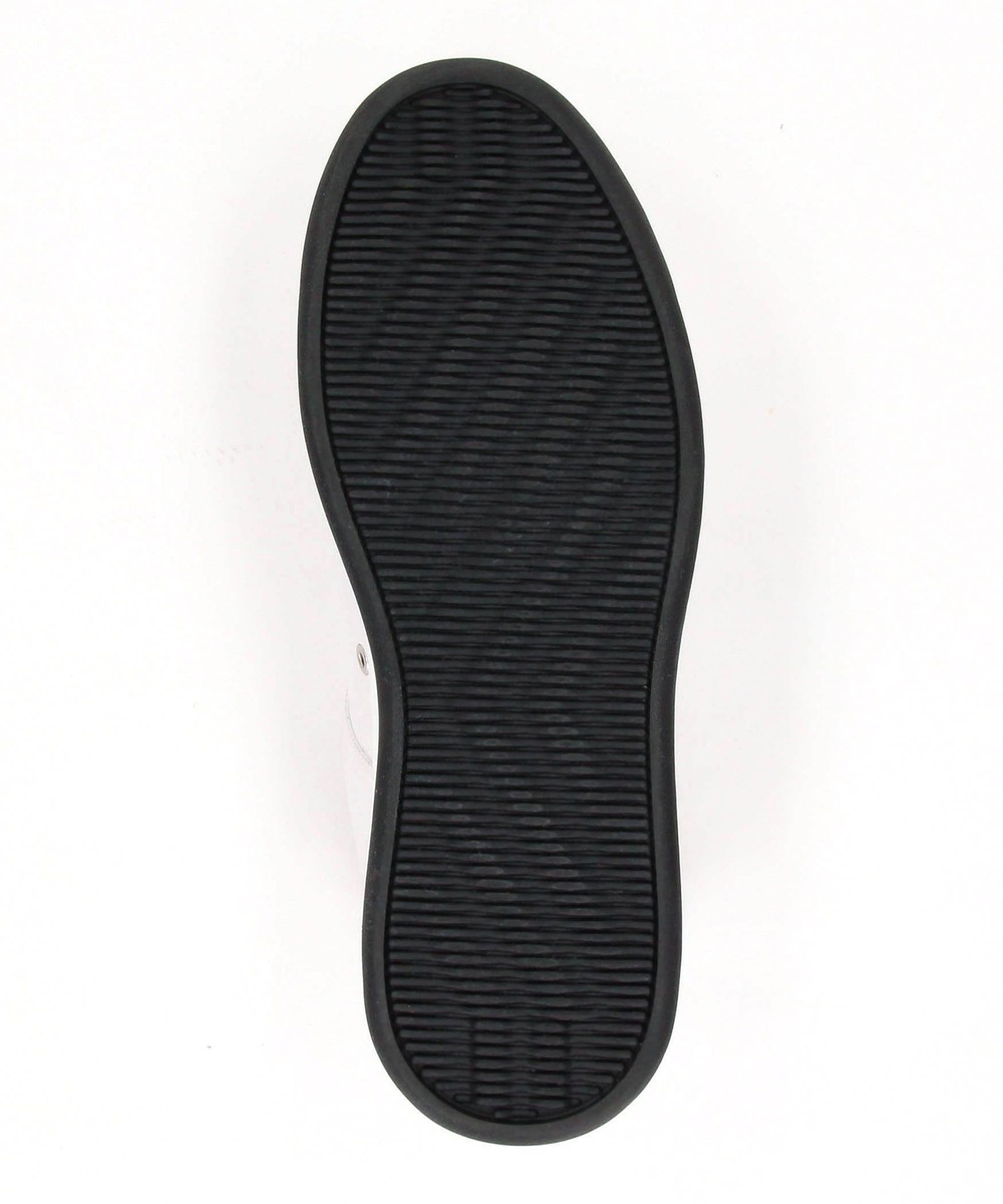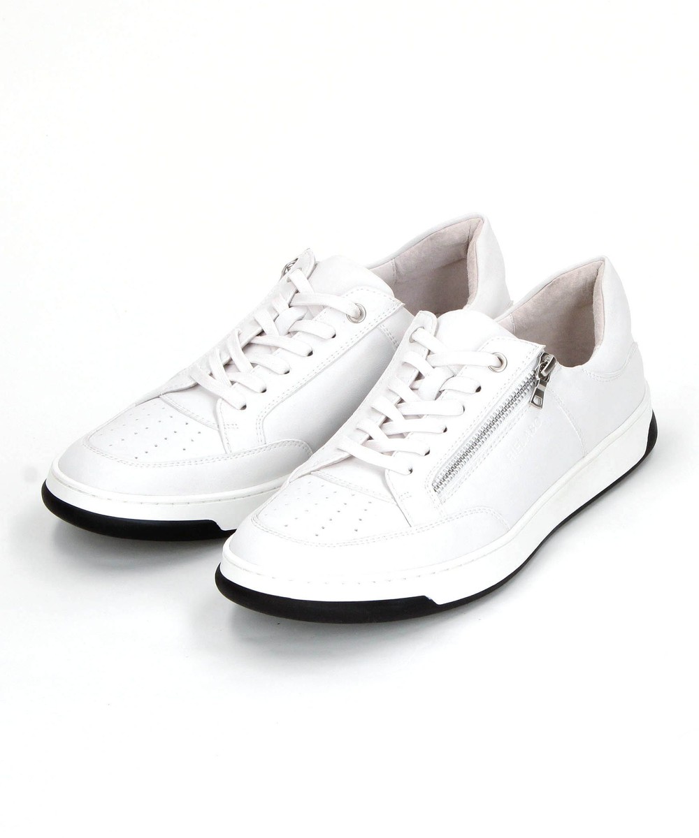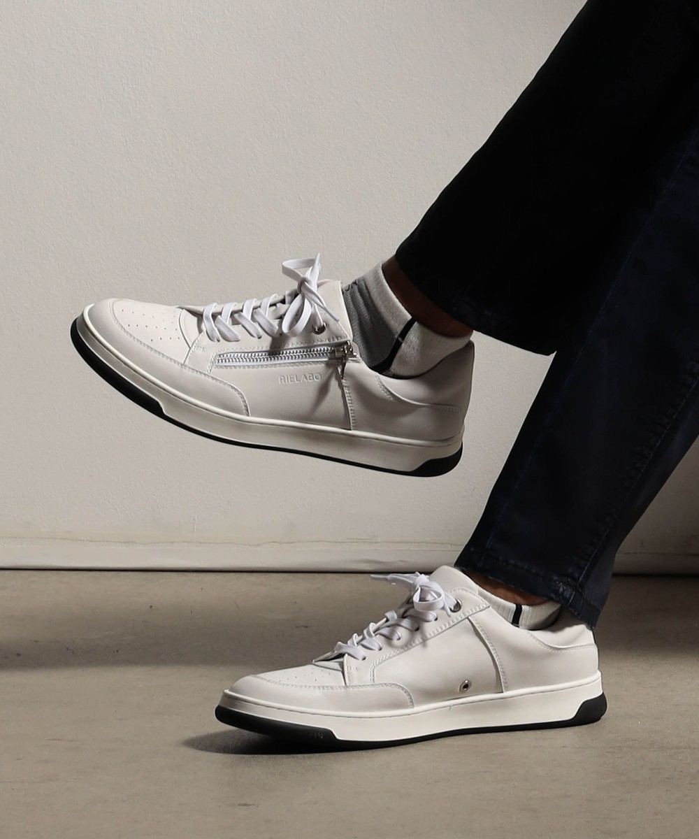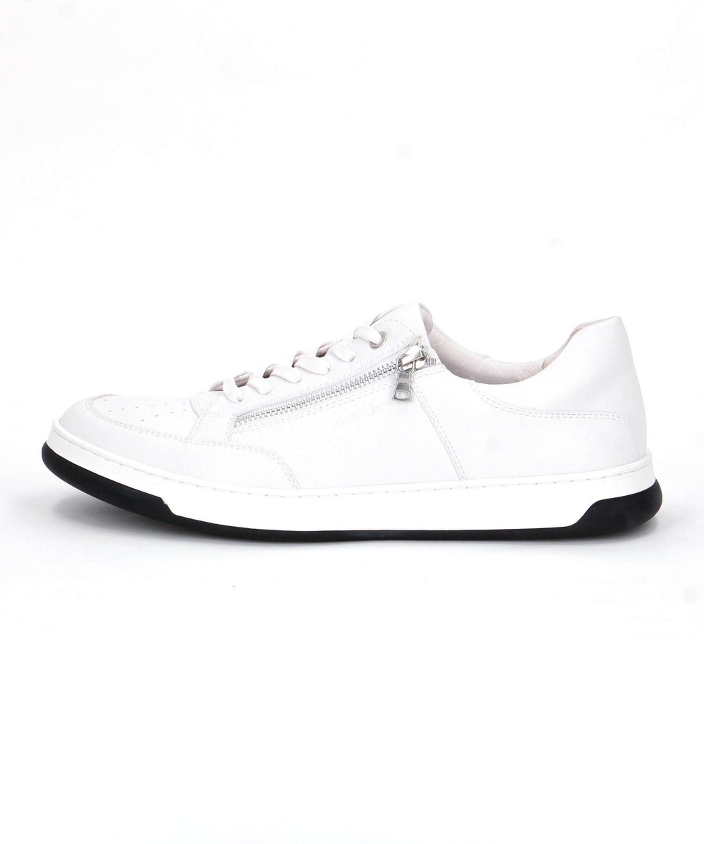 オリジナルデザインのコートスニーカー。少し細長く、トゥスプリングの利いた木型(ラスト)と、コートタイプのスッキリとした2トーンのモールドソールを採用し、トレンド性を高めた大人モードなシューズに仕上げています。サイドファスナー仕様で履きやすく、シュータンと履き口にはクッション材を入れて、インソールにカップソールを採用する事で包み込む様なフィット感を高めています。ロウ引きの細いシューレースや素押しのロゴ、パンチングラインなどさりげないデザインにもこだわっています。