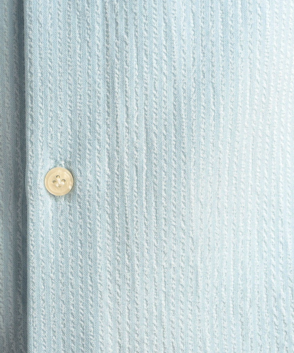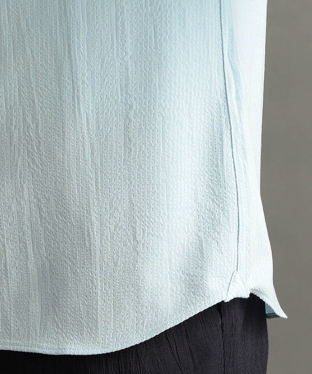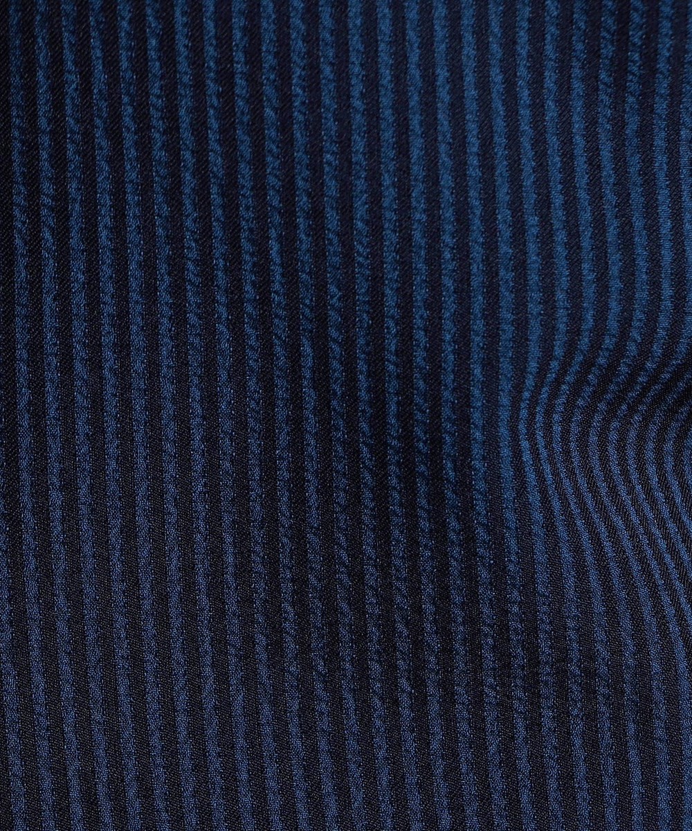 ランダムに組織変化させたポリエステルサッカー。カチオンとレギュラーの染め分けで、ストライプ柄を同系色で表現した特殊素材を採用。