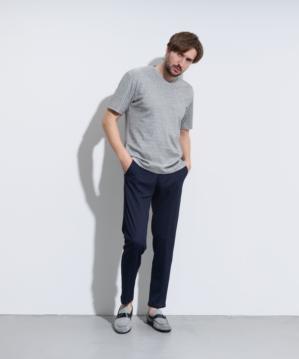 特定の生地屋でしか使用していない、特殊なメランジ調の光沢糸を使用する事による奥行のある深い色目と、チラチラと光る上品な光沢が特長。