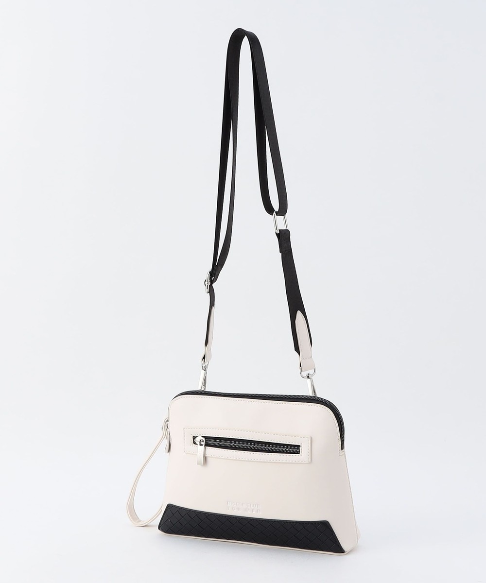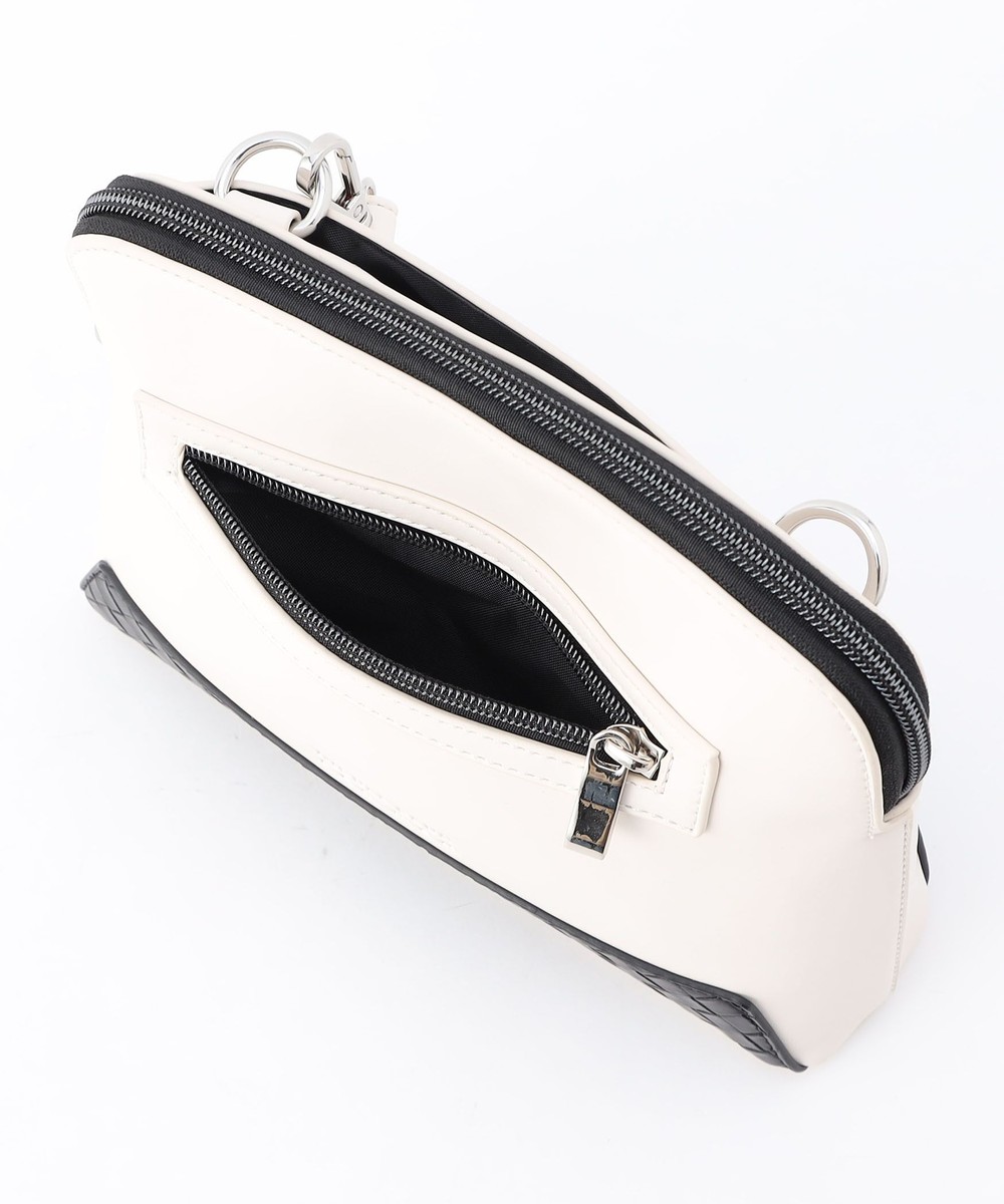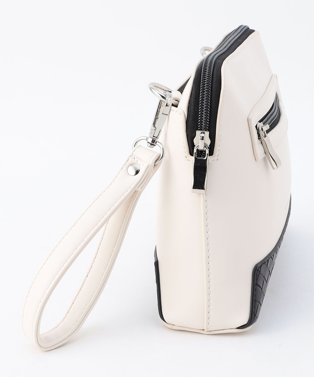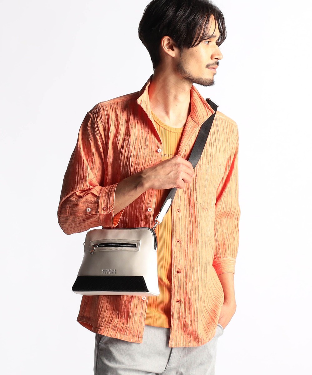 型押し合皮の切り替えがスタイリッシュな印象のショルダーバッグ。手首を通して持ち運べるハンドストラップも付属し、クラッチバッグとしても使用できる2WAY仕様です。フロント底部に刻印したブランドロゴをアクセントに、モードな装いを演出するトレンド感溢れる逸品です。
