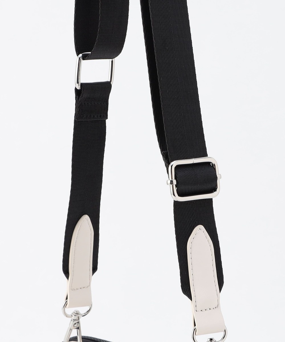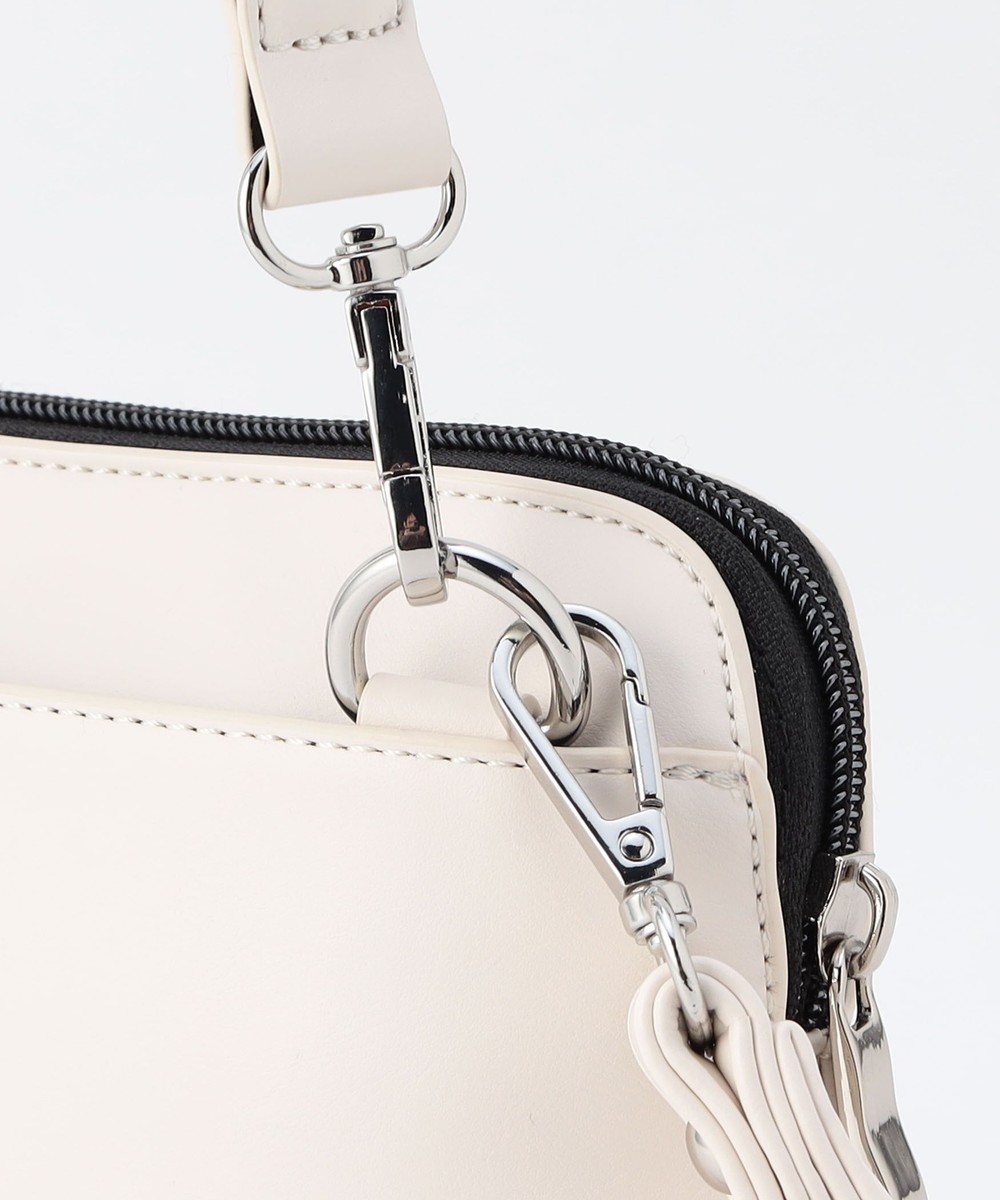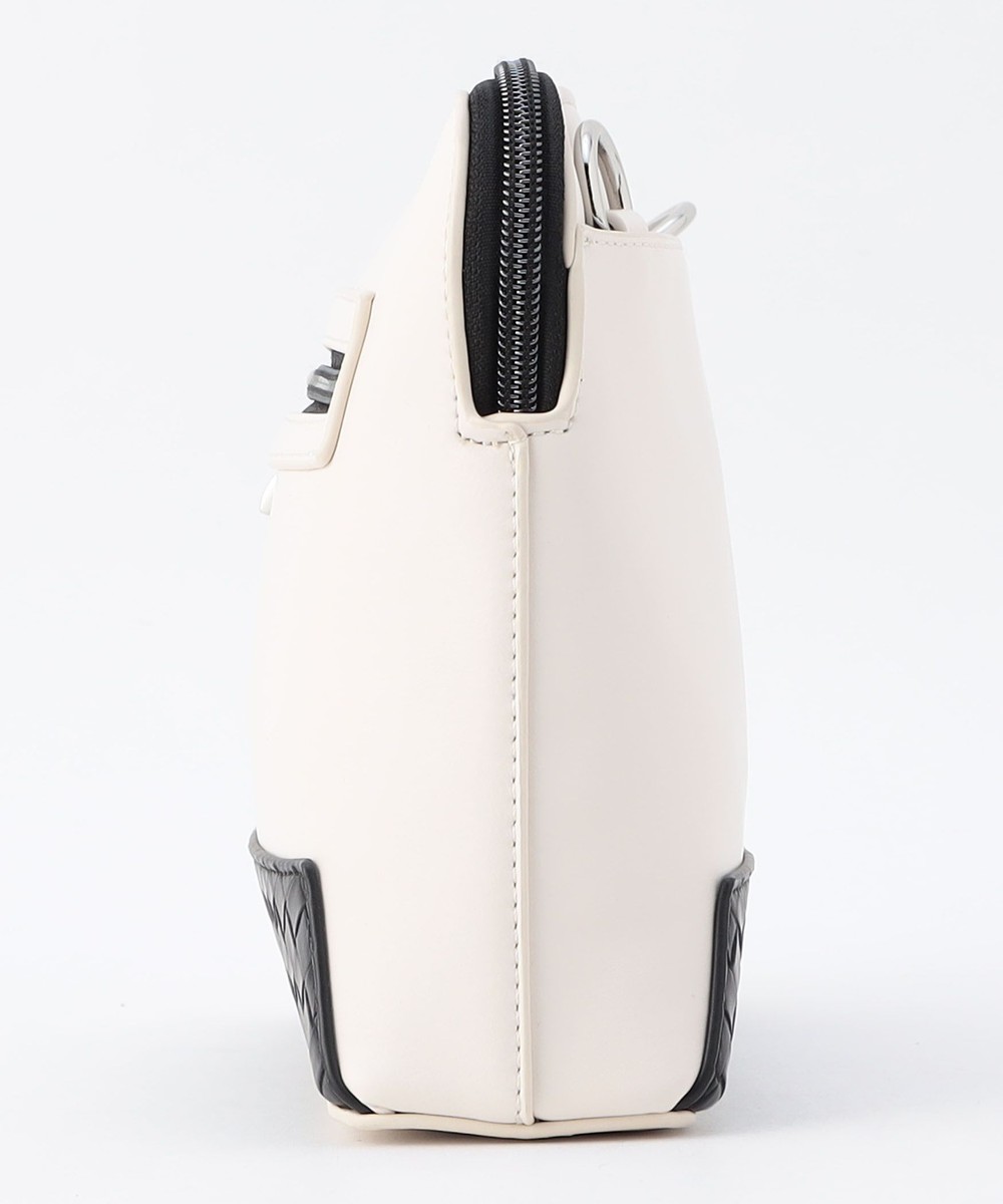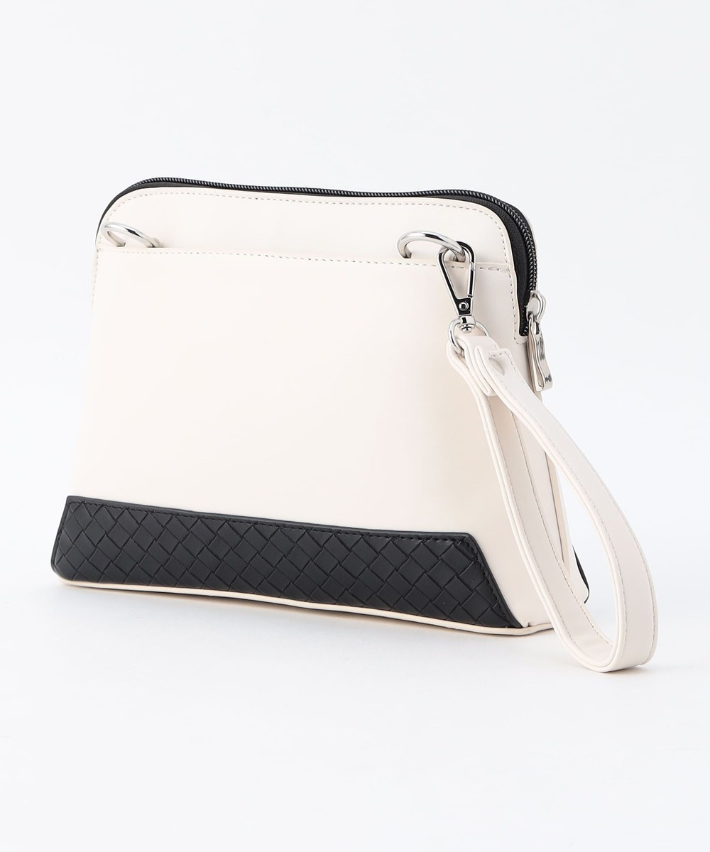 型押し合皮の切り替えがスタイリッシュな印象のショルダーバッグ。手首を通して持ち運べるハンドストラップも付属し、クラッチバッグとしても使用できる2WAY仕様です。フロント底部に刻印したブランドロゴをアクセントに、モードな装いを演出するトレンド感溢れる逸品です。