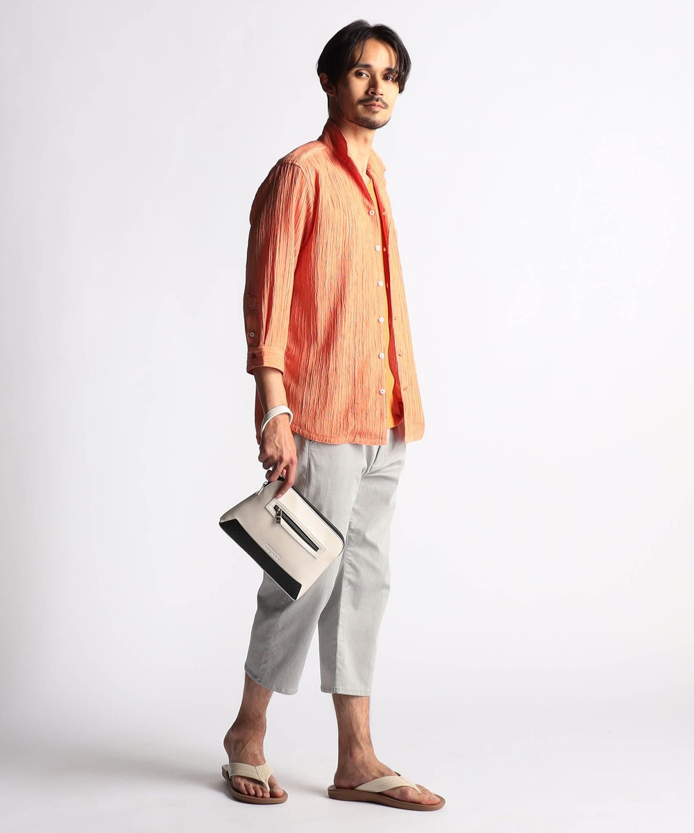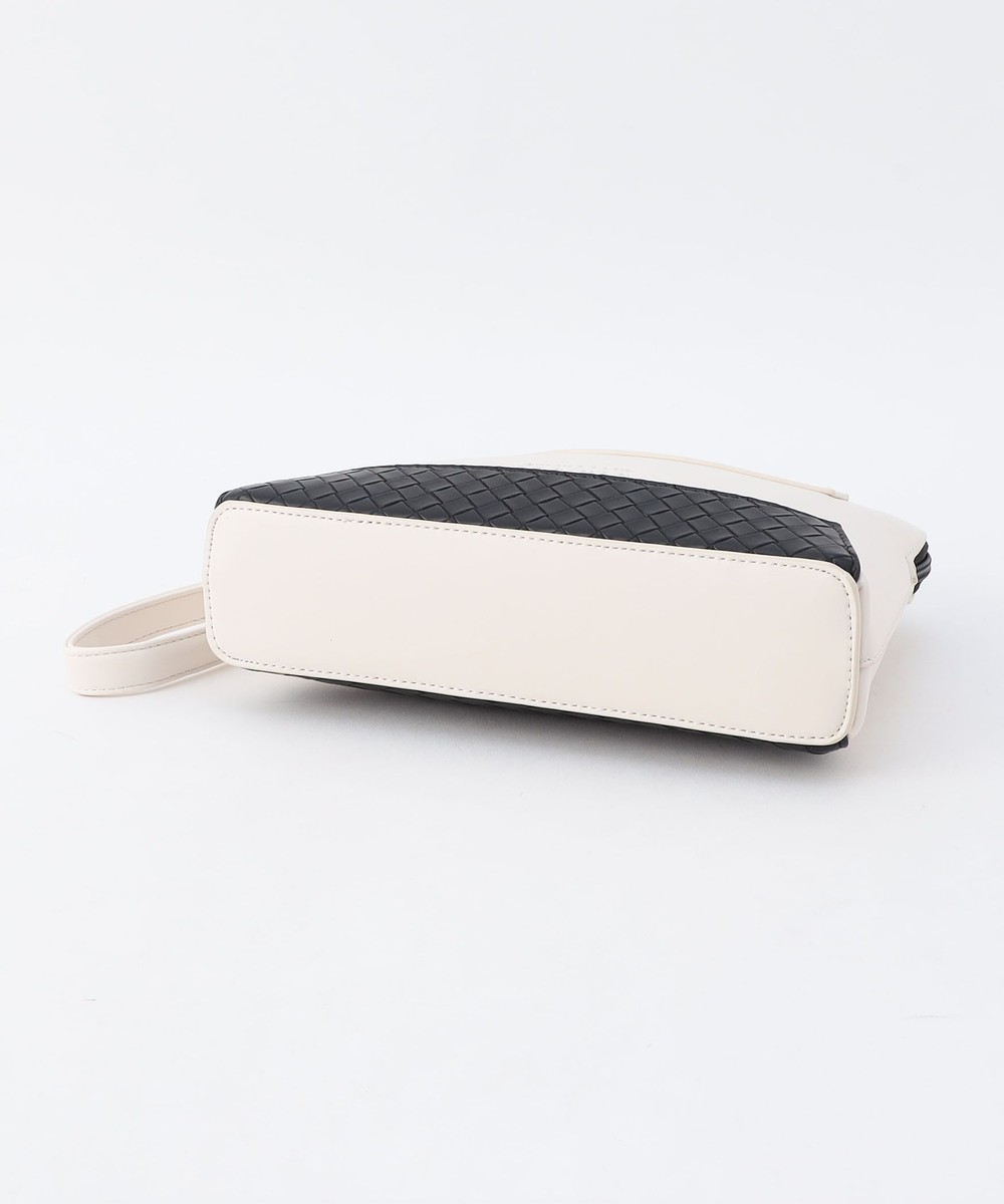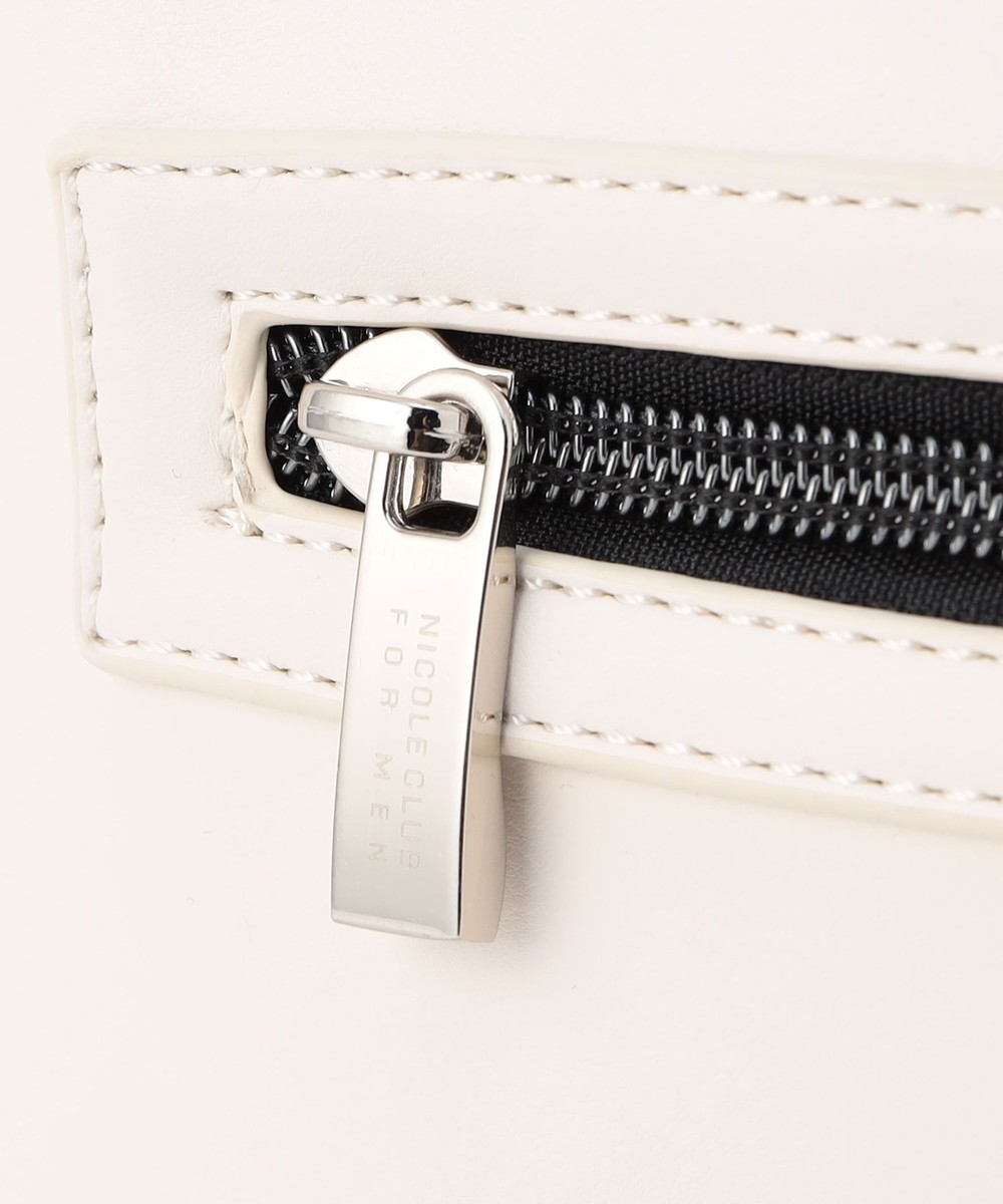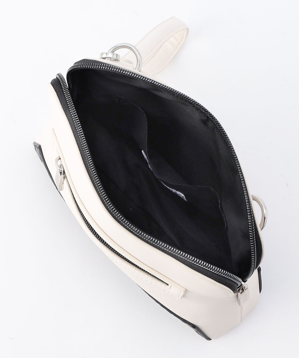 型押し合皮の切り替えがスタイリッシュな印象のショルダーバッグ。手首を通して持ち運べるハンドストラップも付属し、クラッチバッグとしても使用できる2WAY仕様です。フロント底部に刻印したブランドロゴをアクセントに、モードな装いを演出するトレンド感溢れる逸品です。