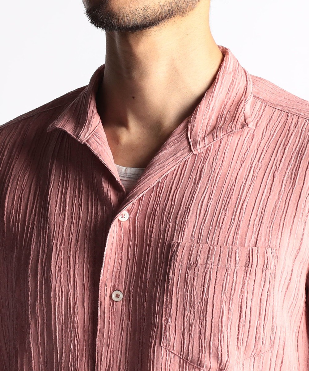 ヨコ糸にポリウレタンの伸びる糸を入れてランダムなプリーツ加工をした生地に、顔料系のカラーコーティングを施した素材です。レーヨン混になりますので、しなやかなタッチ感とストレッチ性があり、カラーコーティングした事で少し風合いを硬く仕上げ、プリーツの山谷で色の差が出る面白い素材です。今季は08ピンクが新色です。