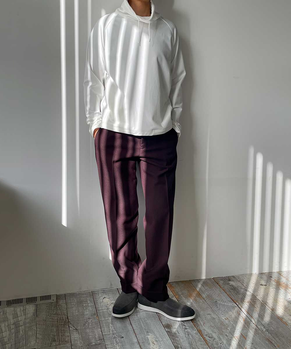 衿のボリューム感と、袖口のサムホール仕様で機能性をアップさせたリラックススタイルを提案。