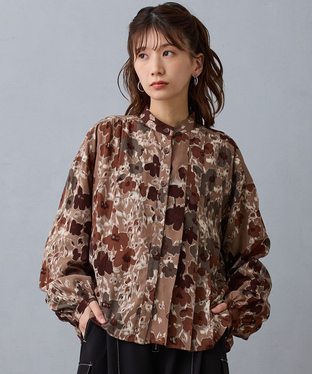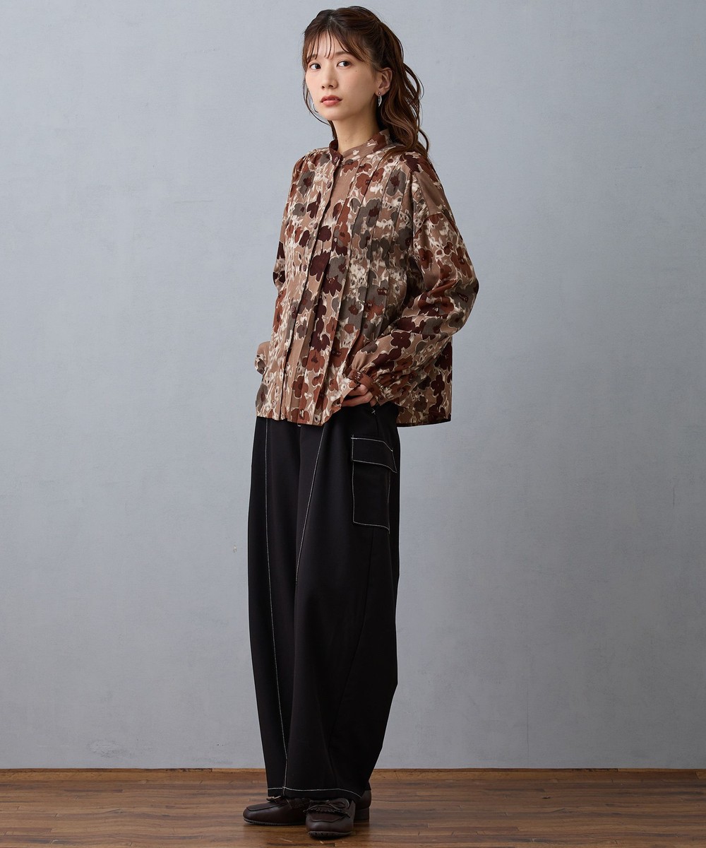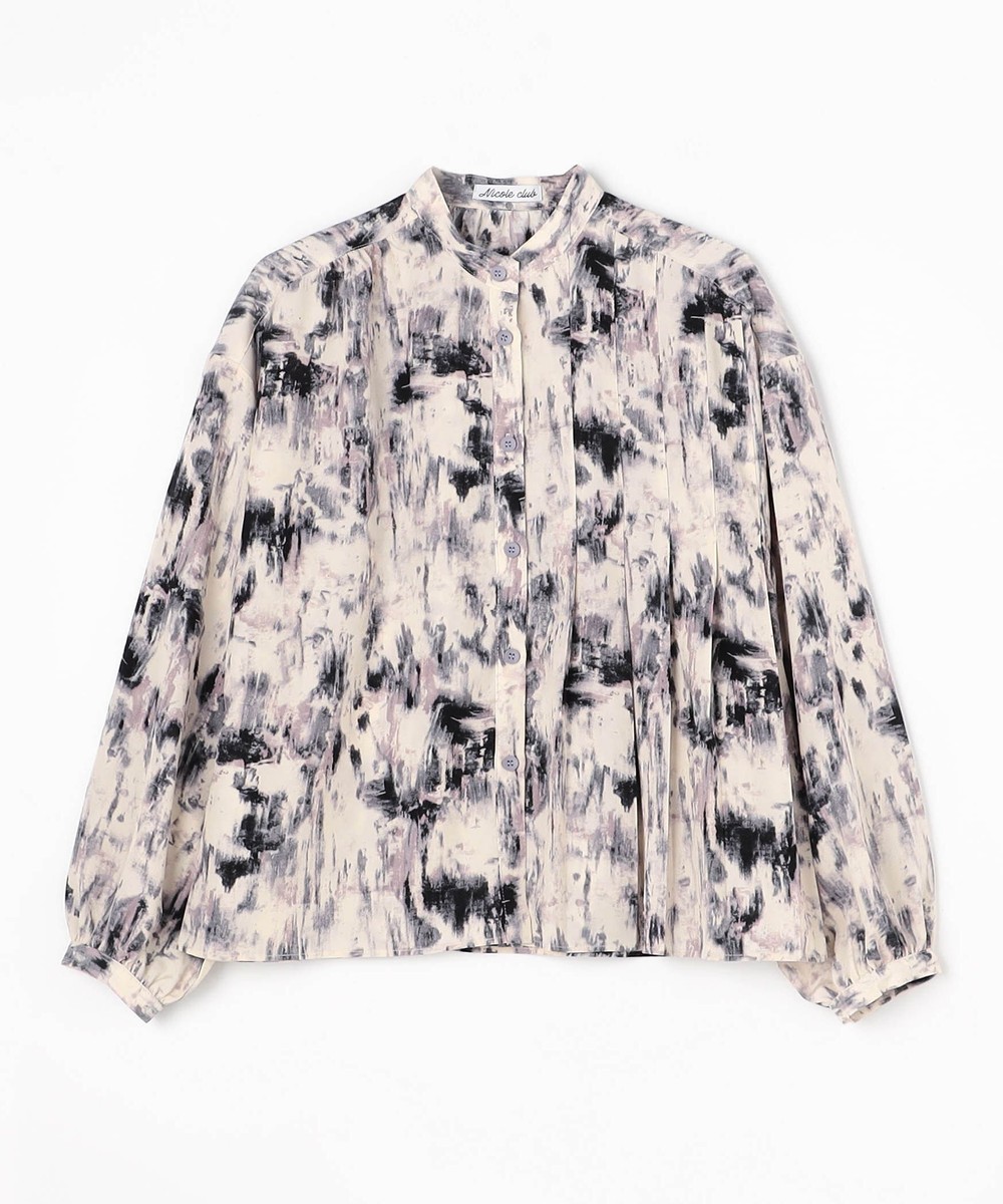 アシンメトリーなプリーツデザインの柄ブラウスが新登場。