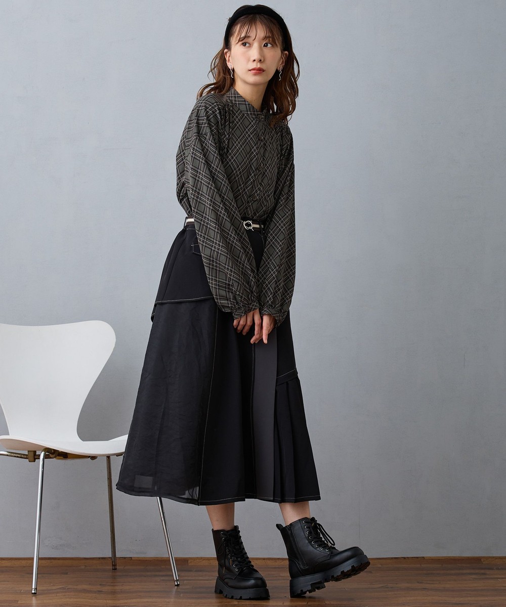 半身は裾までプリーツ加工をほどこしており揺れるプリーツがブラウスの存在感を強調してくれます。