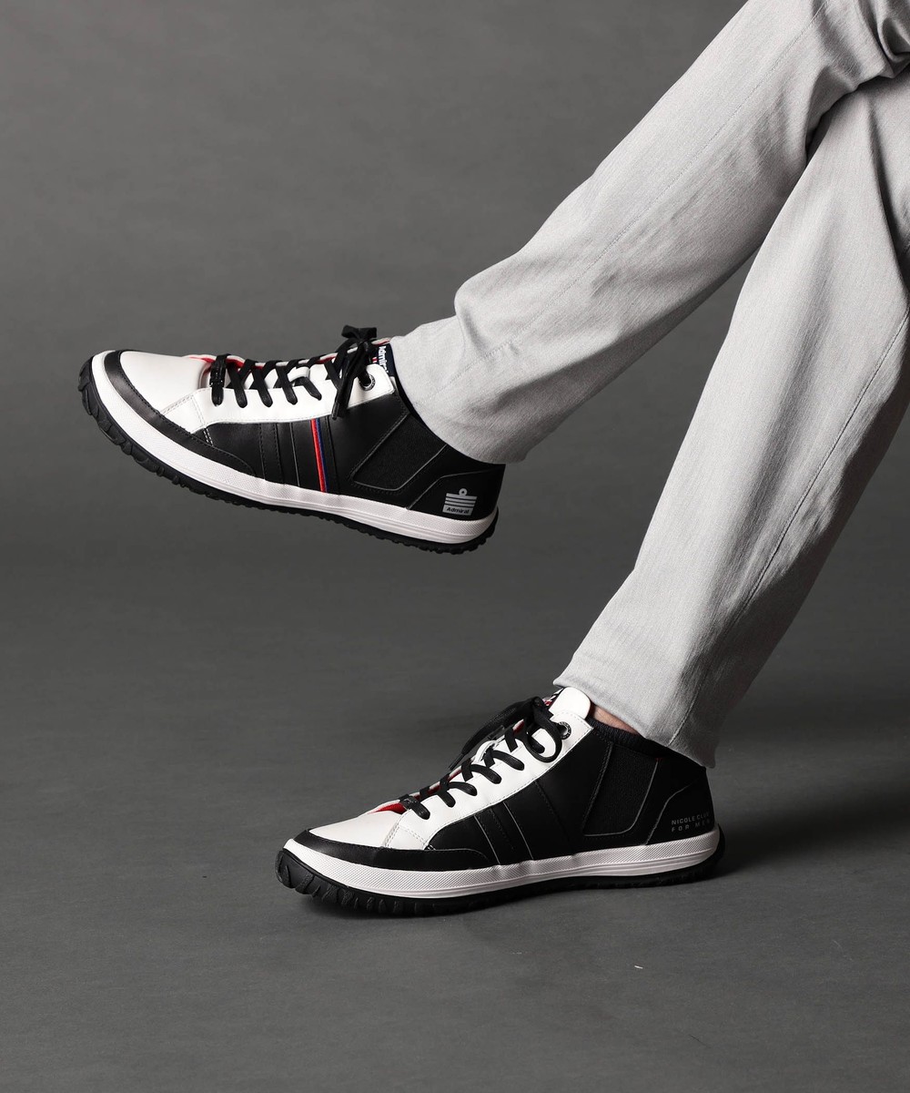 アドミラルの別注スニーカー第5弾。第2弾のサイドゴアデザインのミッドカットタイプをベースにリアルレザーで作った完全別注になります。シューレースにはロウ引きをした光沢感のある平紐、かかとの外側にはアドミラル、内側にはブランドロゴをシルバーで印字、インソールには通気性が高く、ヒール部分にジェルを入れたクッション性の高い物を採用しています。履き口のクッションを厚くし、ポリエステルメッシュのライニング仕様にする事で足入れとフィット感を良くしています。少しトゥスプリングの効いたシャープなラスト(木型)はスラックスなどの綺麗めパンツにも合わせやすいです。コラボオリジナルのネームと金属ハトメ、今季はオリジナルデュブレを採用しています。