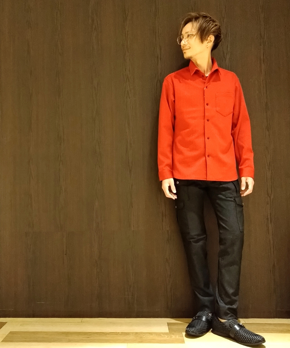 NEWデザイン、スタンドボタンダウンカラ-の長袖シャツ。スタンドカラーをそのまま折り返して釦止めした新しい衿デザインです。ヨーク裏、カフス裏など無地配色の素材を使いアクセントにしています。生地のジャカード配色とリンクした釦も、ちょっとしたアクセント。ジオメトリック調のレトロ感のあるストレッチ素材は布帛系シャツとは一線を画します。インパクトのある大胆なジャカード柄ですが、程良く効いたストレッチ性とサラッとしたタッチはとても着やすく、オリジナリティの高いシャツです。
