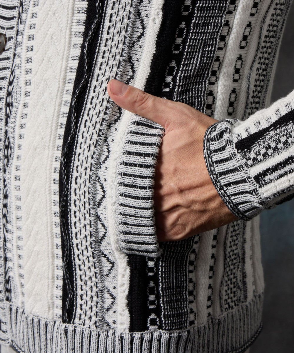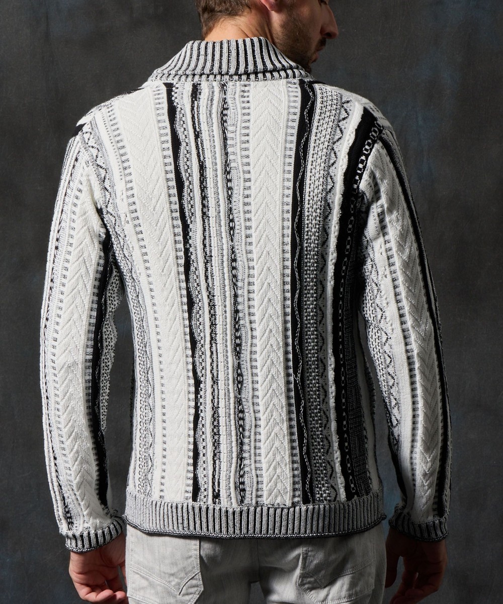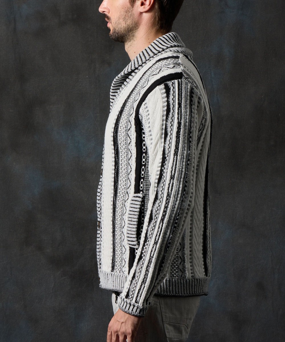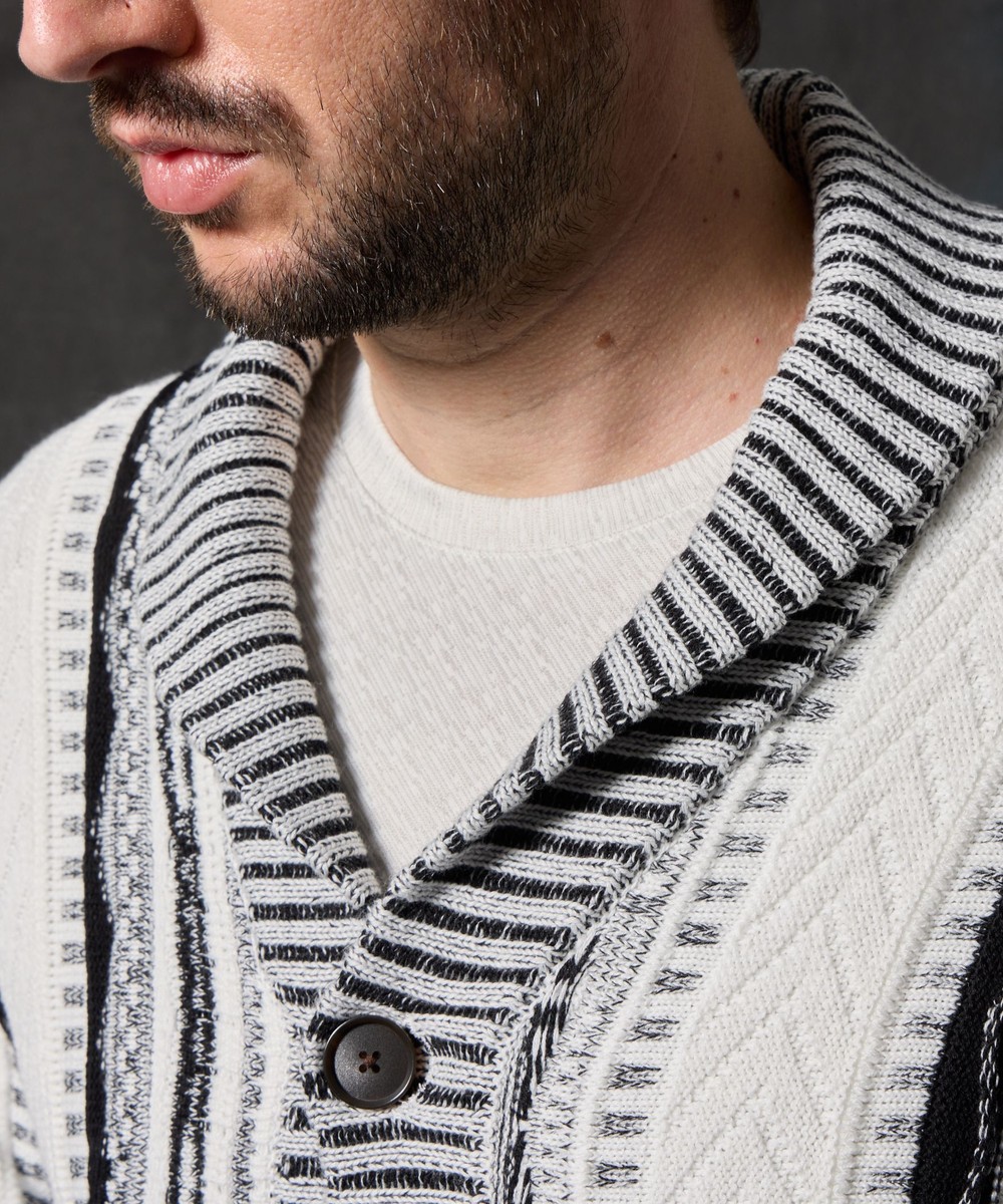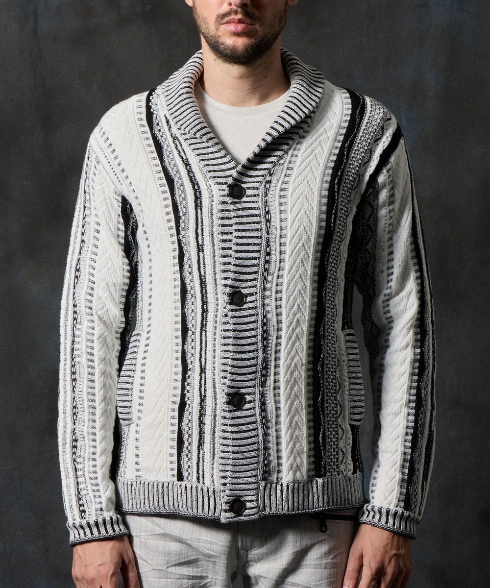 様々な編み方をして凹凸感のある表面感を出したショールカラーのニットカーディガン。