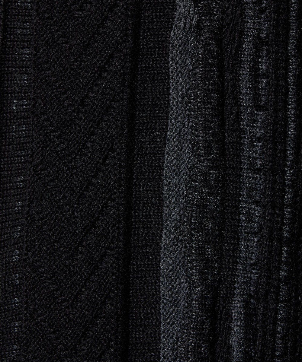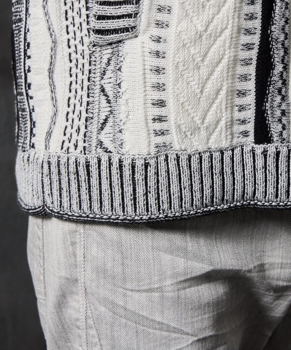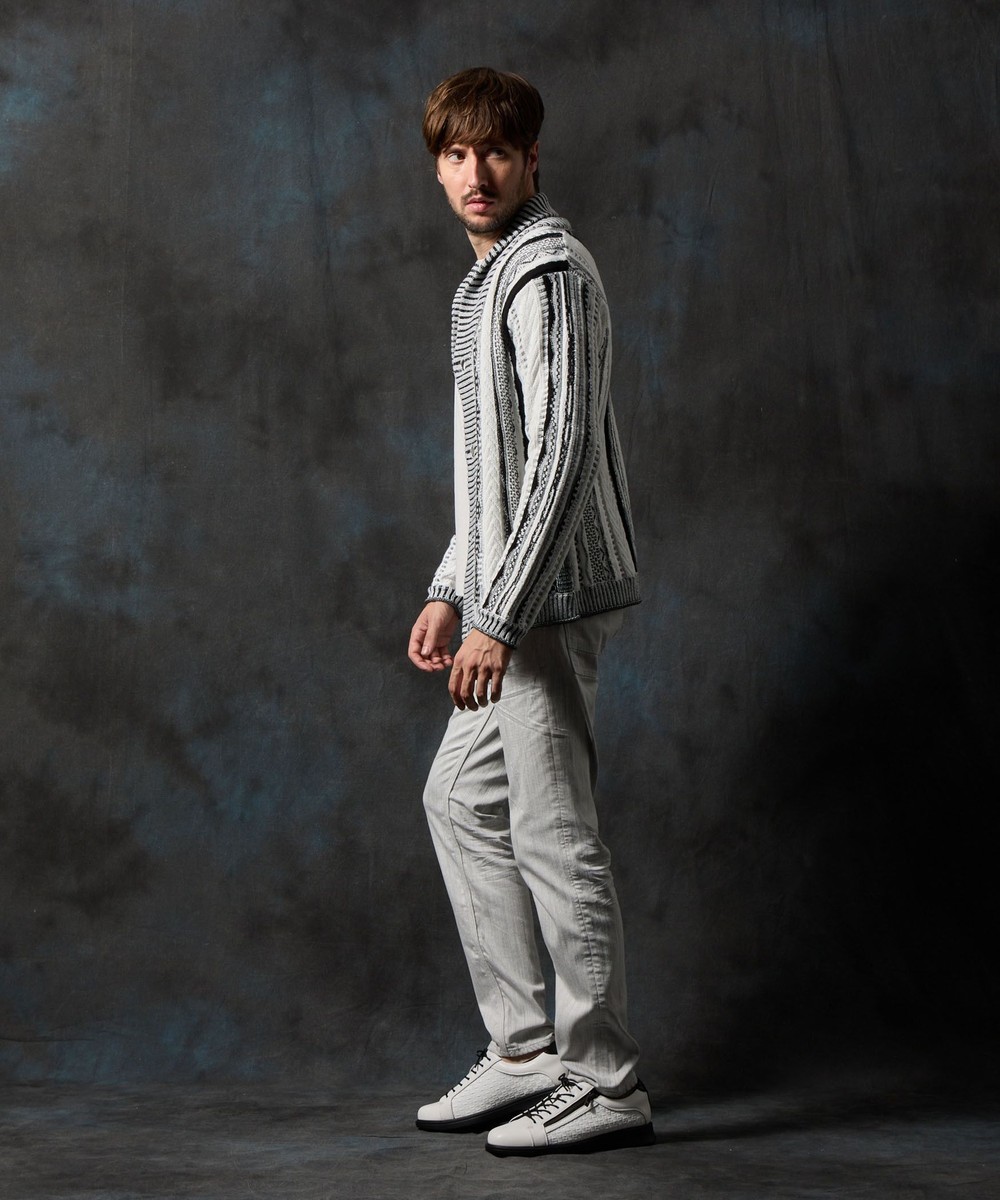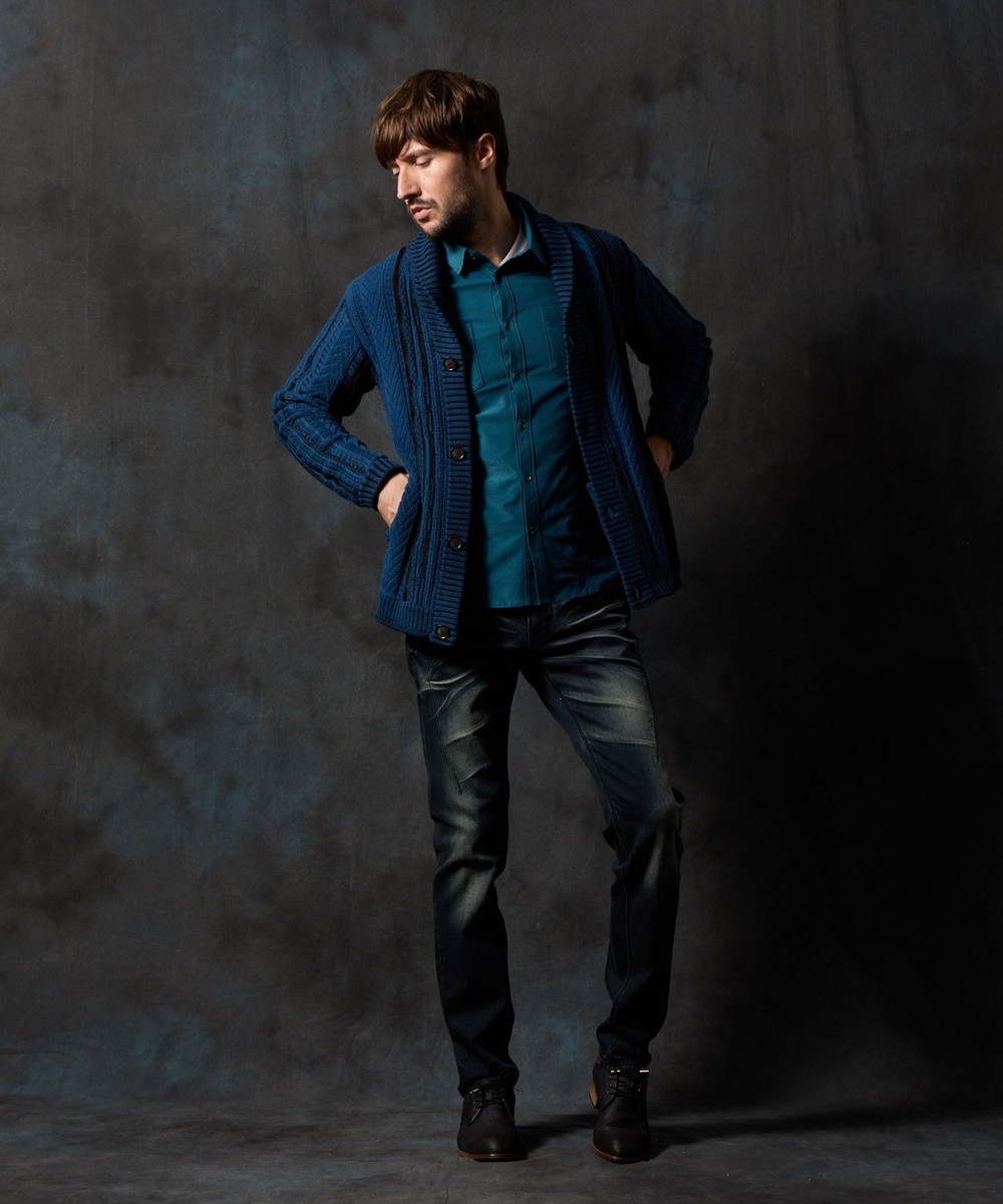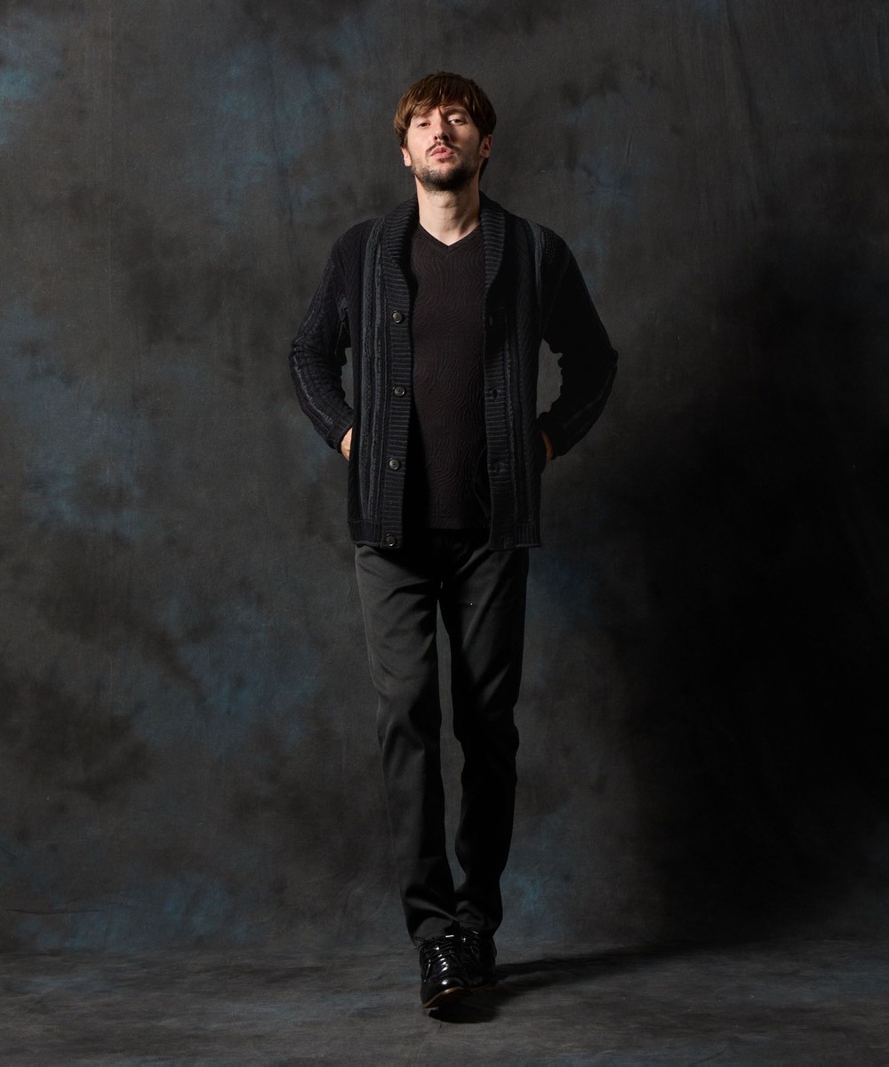 様々な編み方をして凹凸感のある表面感を出したショールカラーのニットカーディガン。