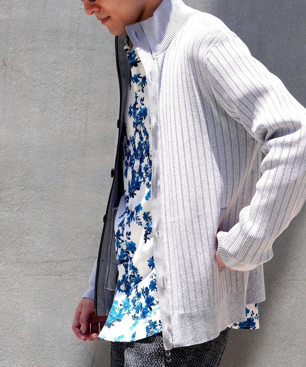 ハイゲ-ジ14GGで編み立てたプレ-ティングリブジャカードのスタンドフルジップアップブルゾンになります。