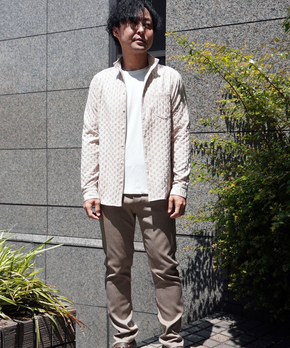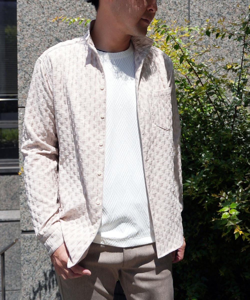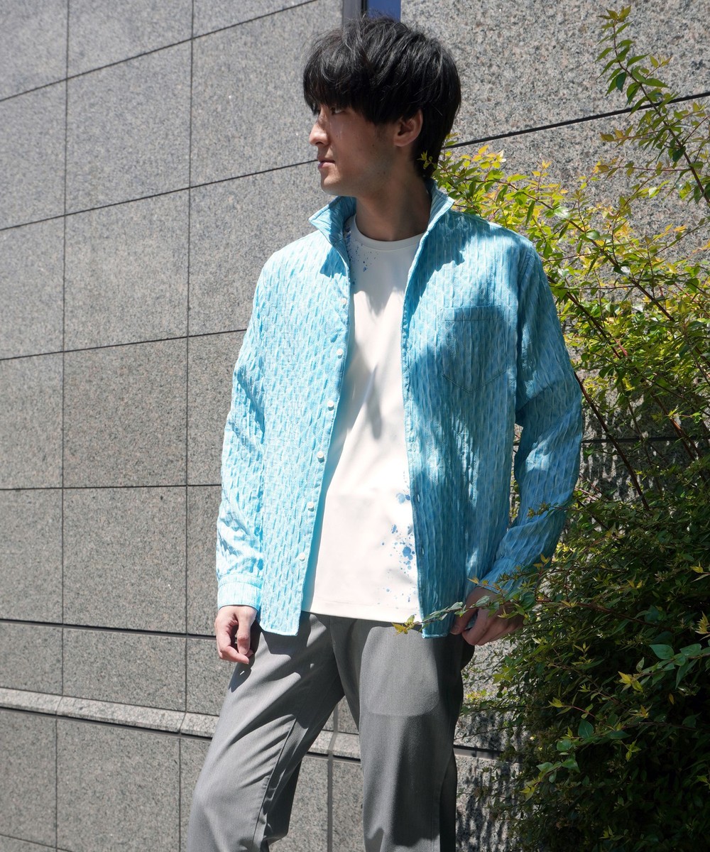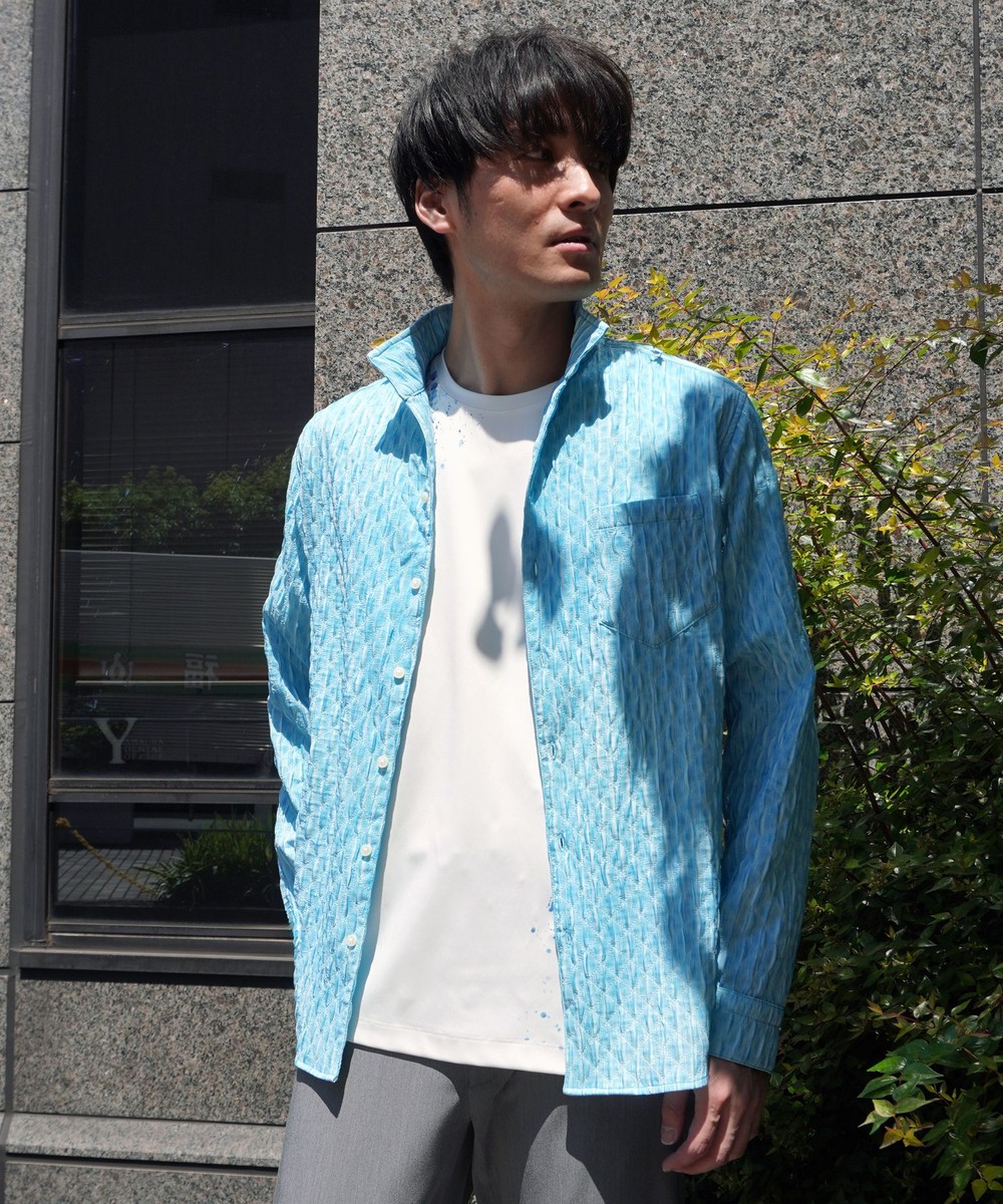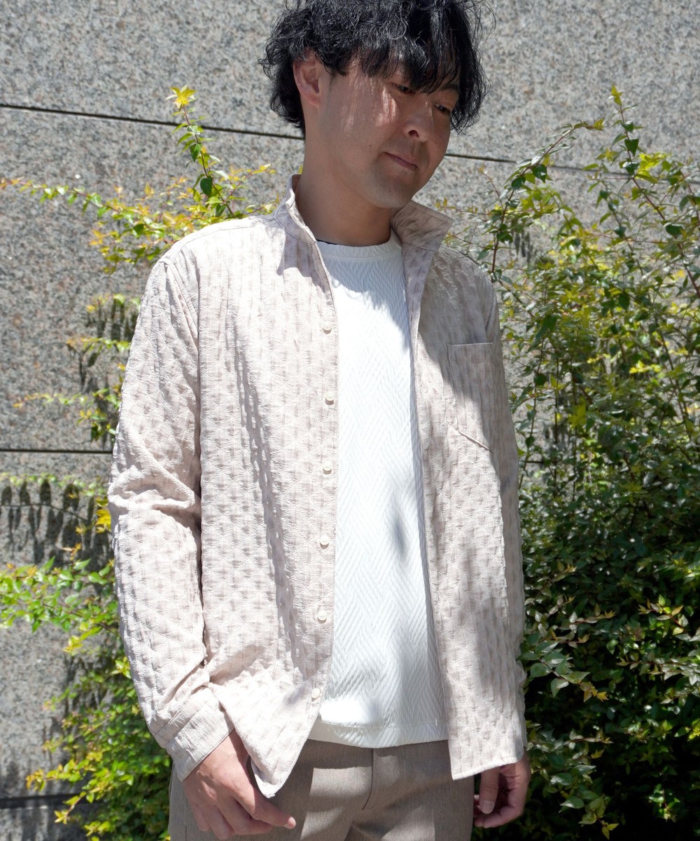 衿端にワイヤ-を仕込んだスタンドカラ-シャツ。