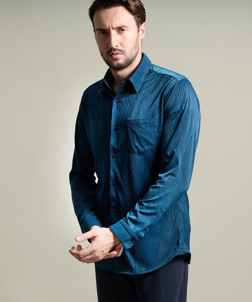 衿先にワイヤ-を仕込んだレギュラーカラ-シャツ。