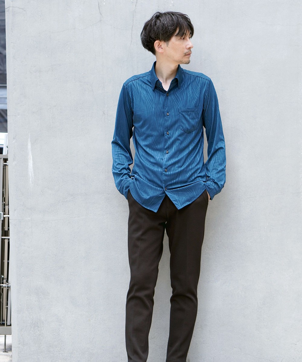 合繊特有の上品な光沢とカットソー素材ならではの、よく伸びるストレスフリーな着心地が特徴です。