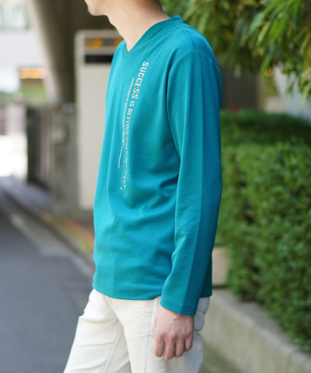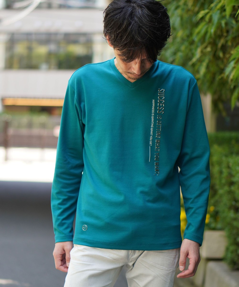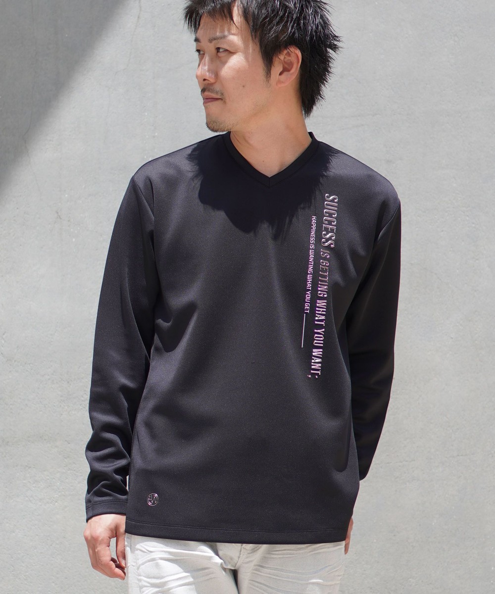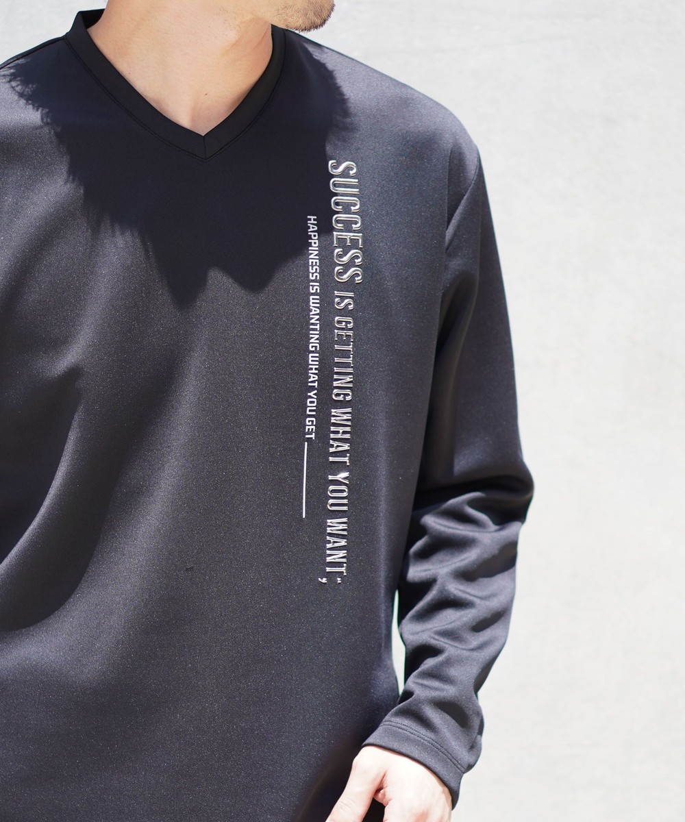 シャープな印象をあたえるメタルジェルプリントが特徴の浅Vネック長袖プルオーバーになります。