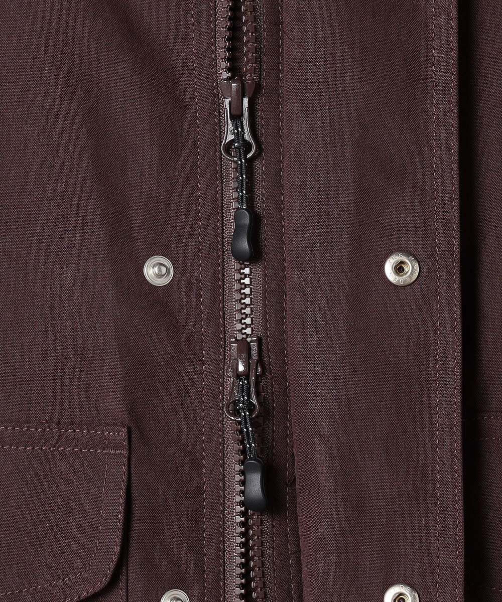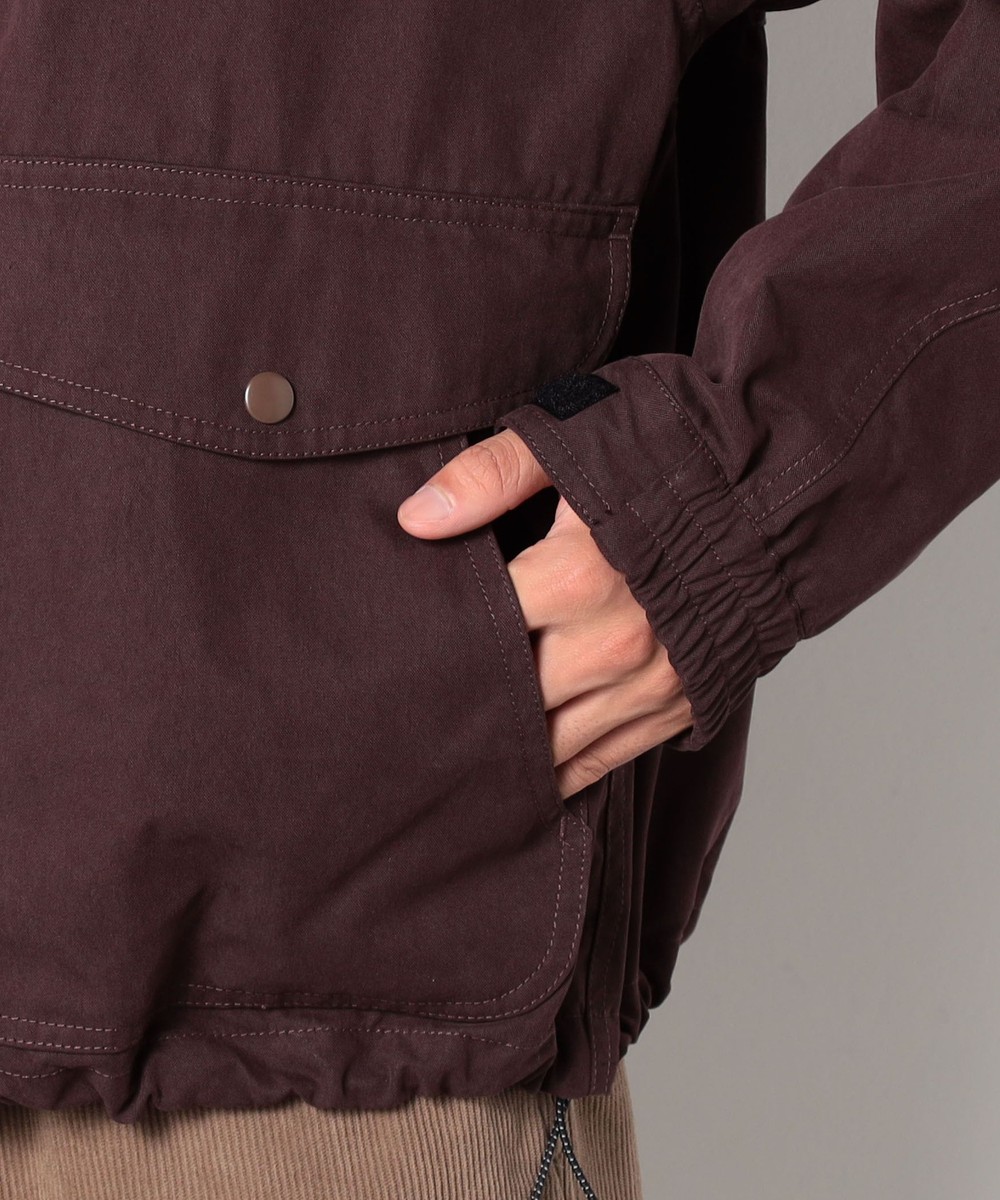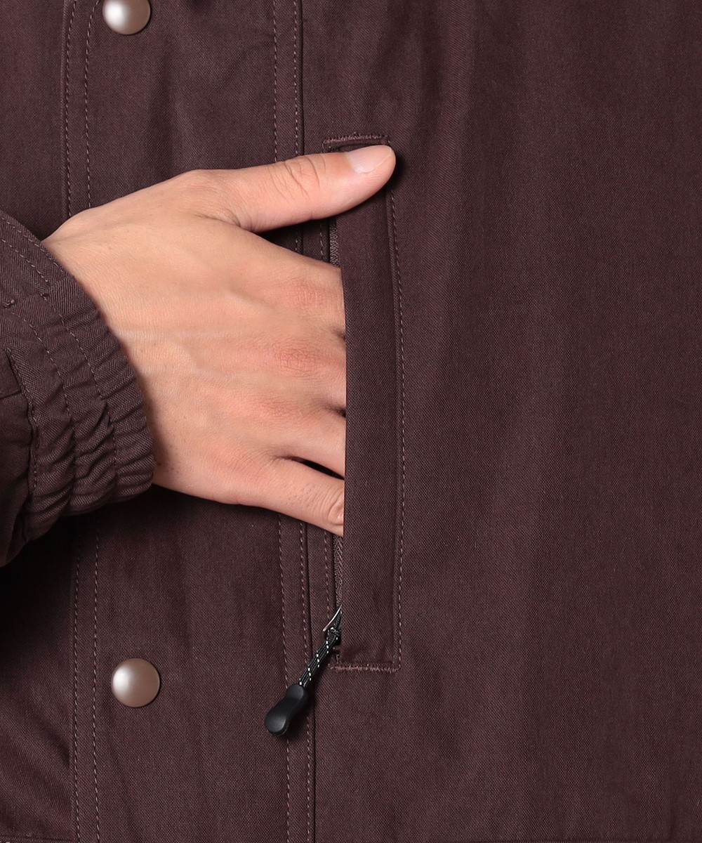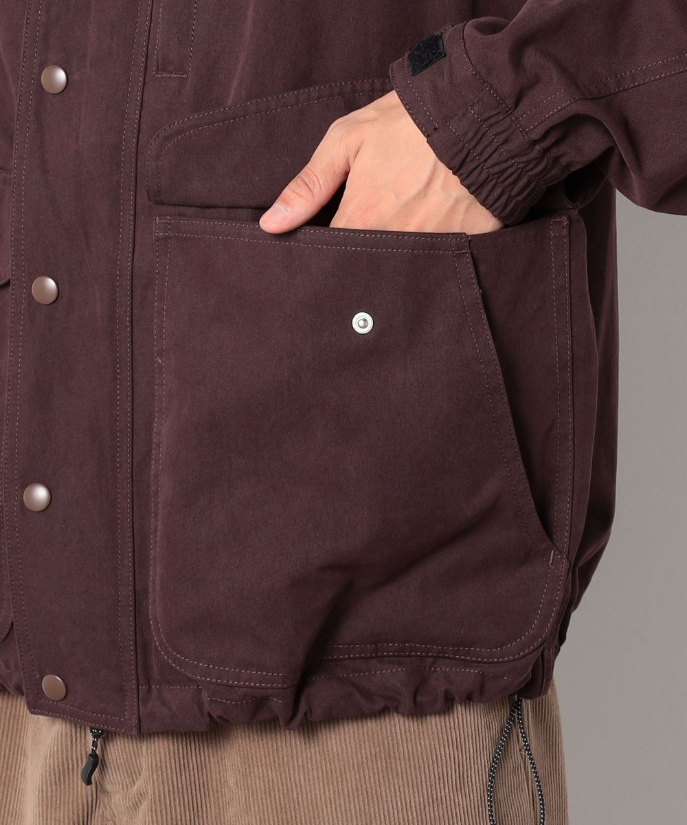 やや高めに設定されたスタンドカラーの裏側にはコーデュロイ素材を使用し、肌触りの良さと配色によるアクセントをプラス。裾にはドローコードを配し、シルエットを自由に調整可能。ポケットは合計5か所と機能性にも優れています。フロントはファスナーとボタンのダブル仕様で、防寒性とデザイン性の両立を実現。袖口もサイズ調整できるつくりになっています。