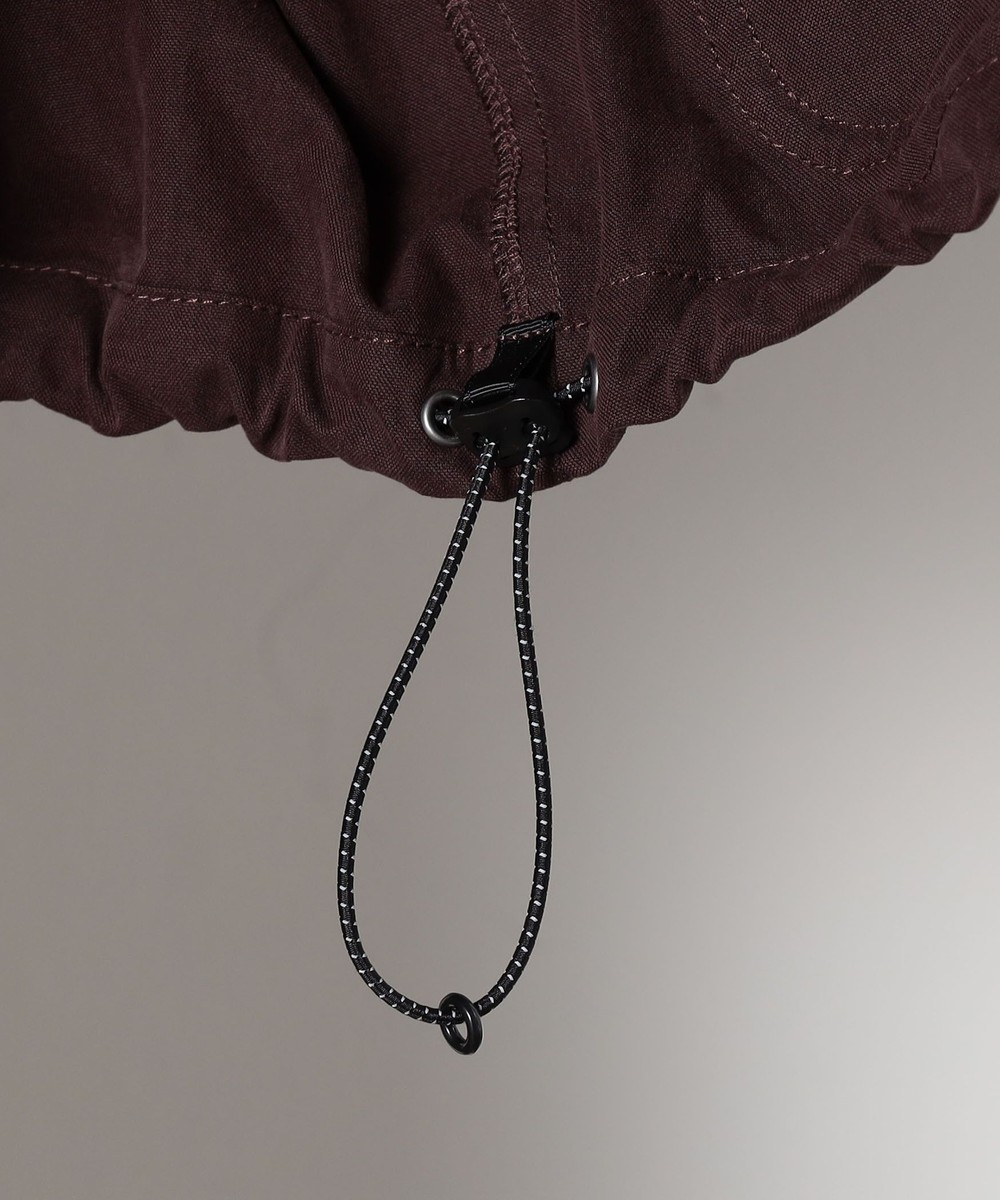 全体的にゆとりを持たせたリラックスシルエットで、アームホールも広めに設計。インナーにスウェットやニットを重ねても窮屈にならず、ストレスフリーな着心地です。裾のコードを絞れば、シルエットにメリハリをつけたスタイリングも楽しめます。