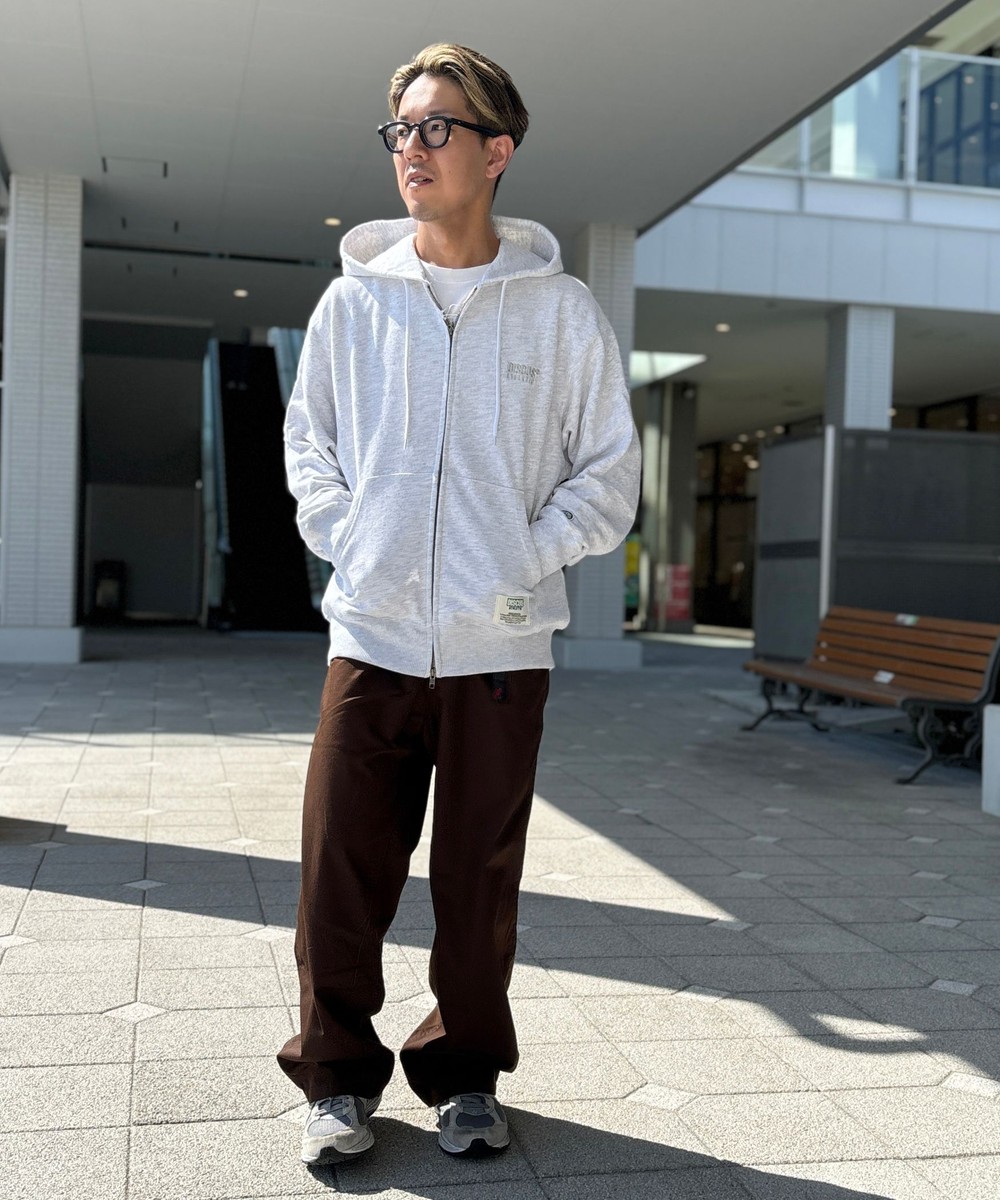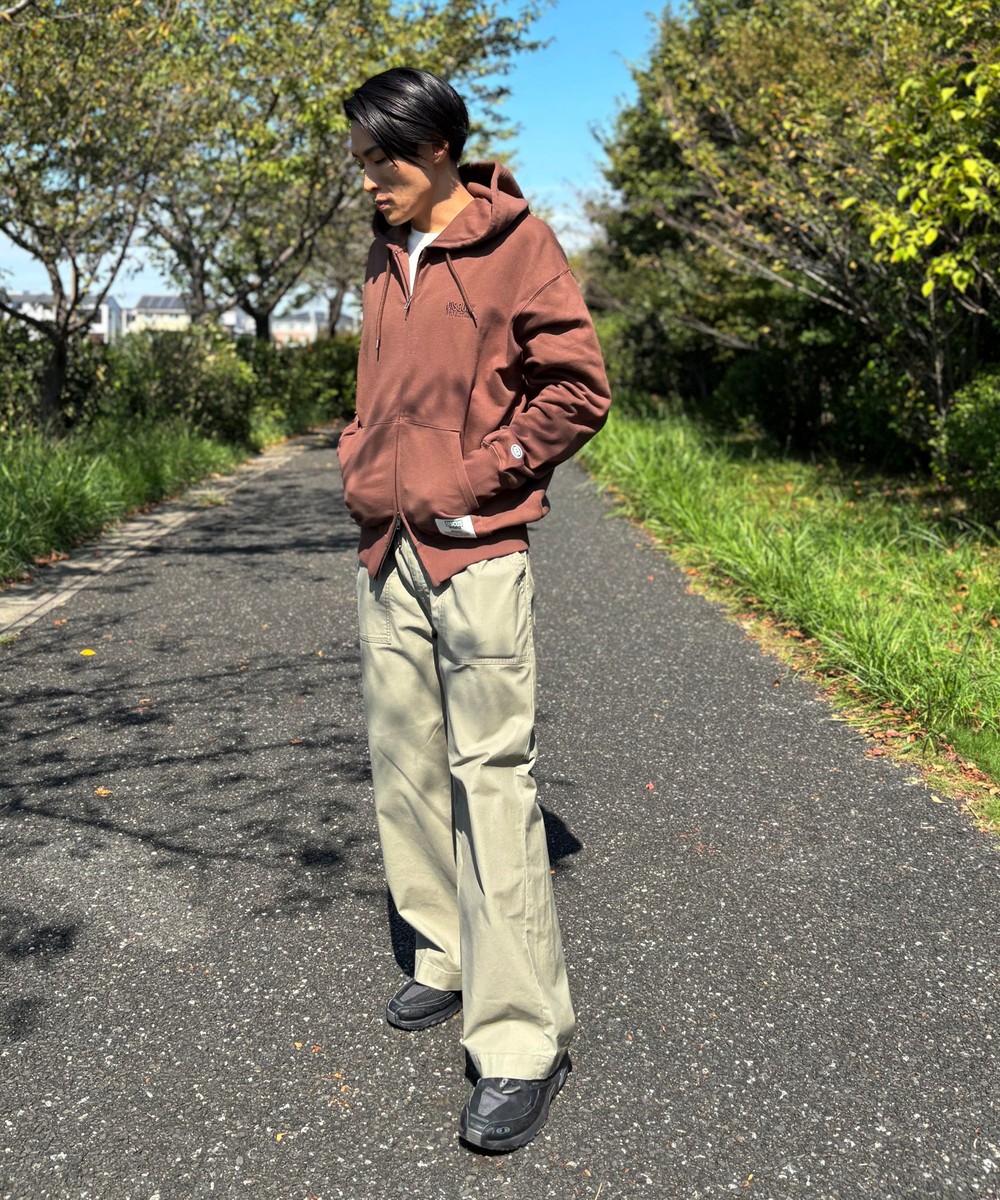 胸には同色刺繍、フードにはラバーワッペンを付けてアクセントにしています。