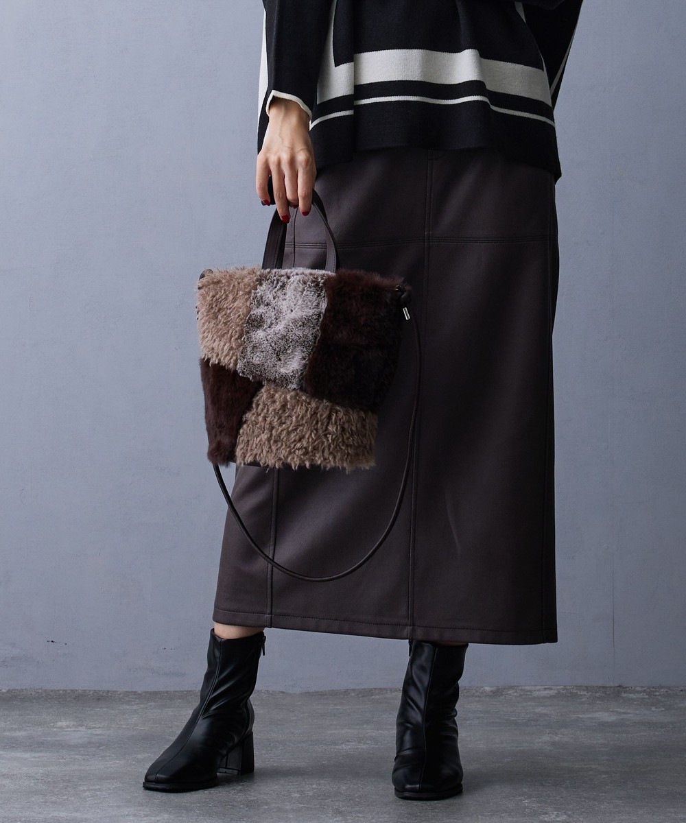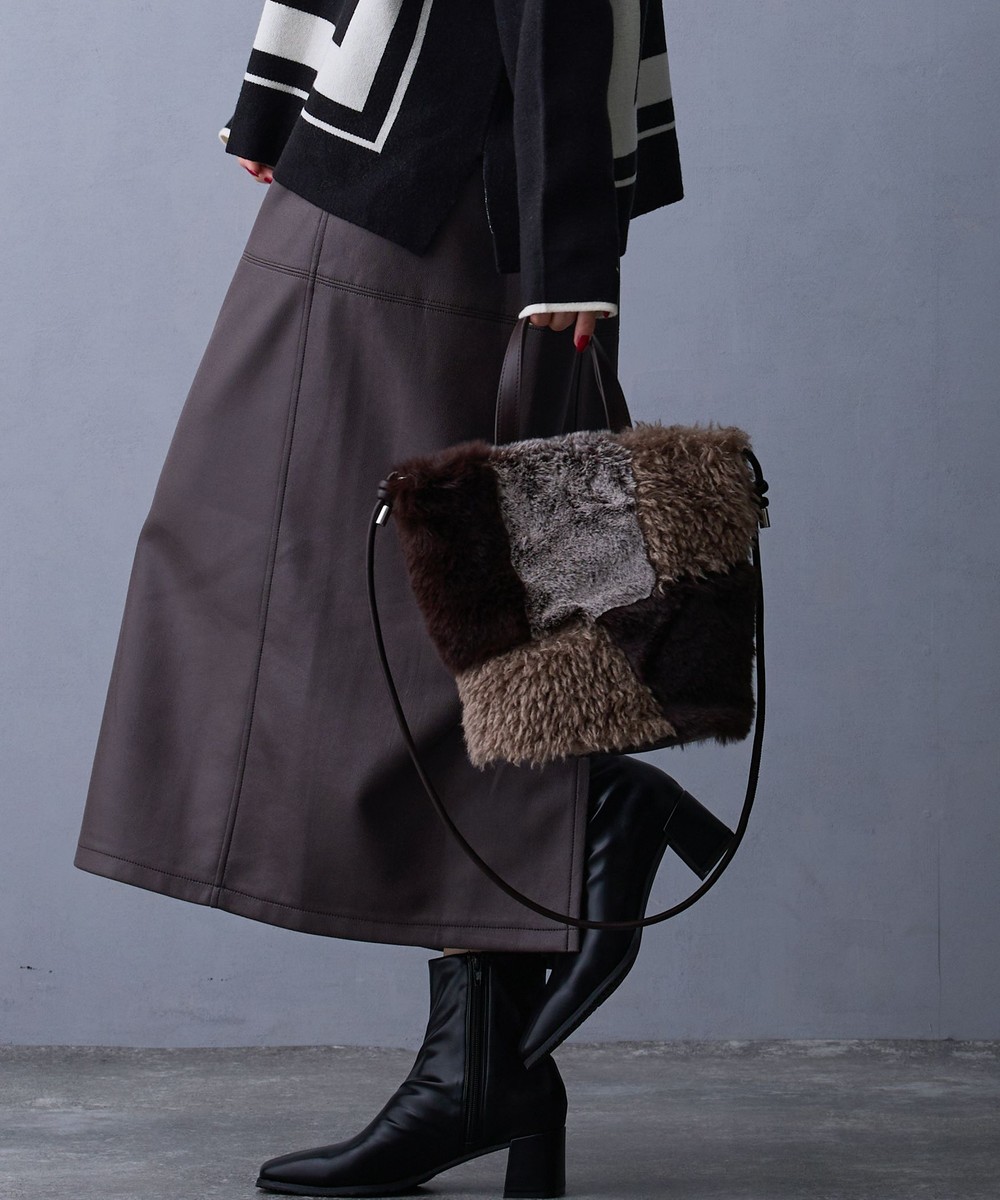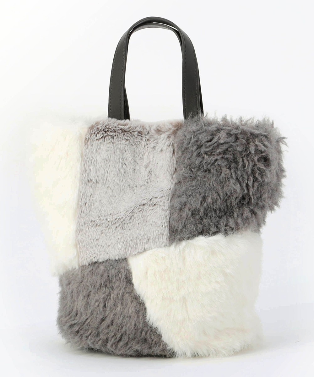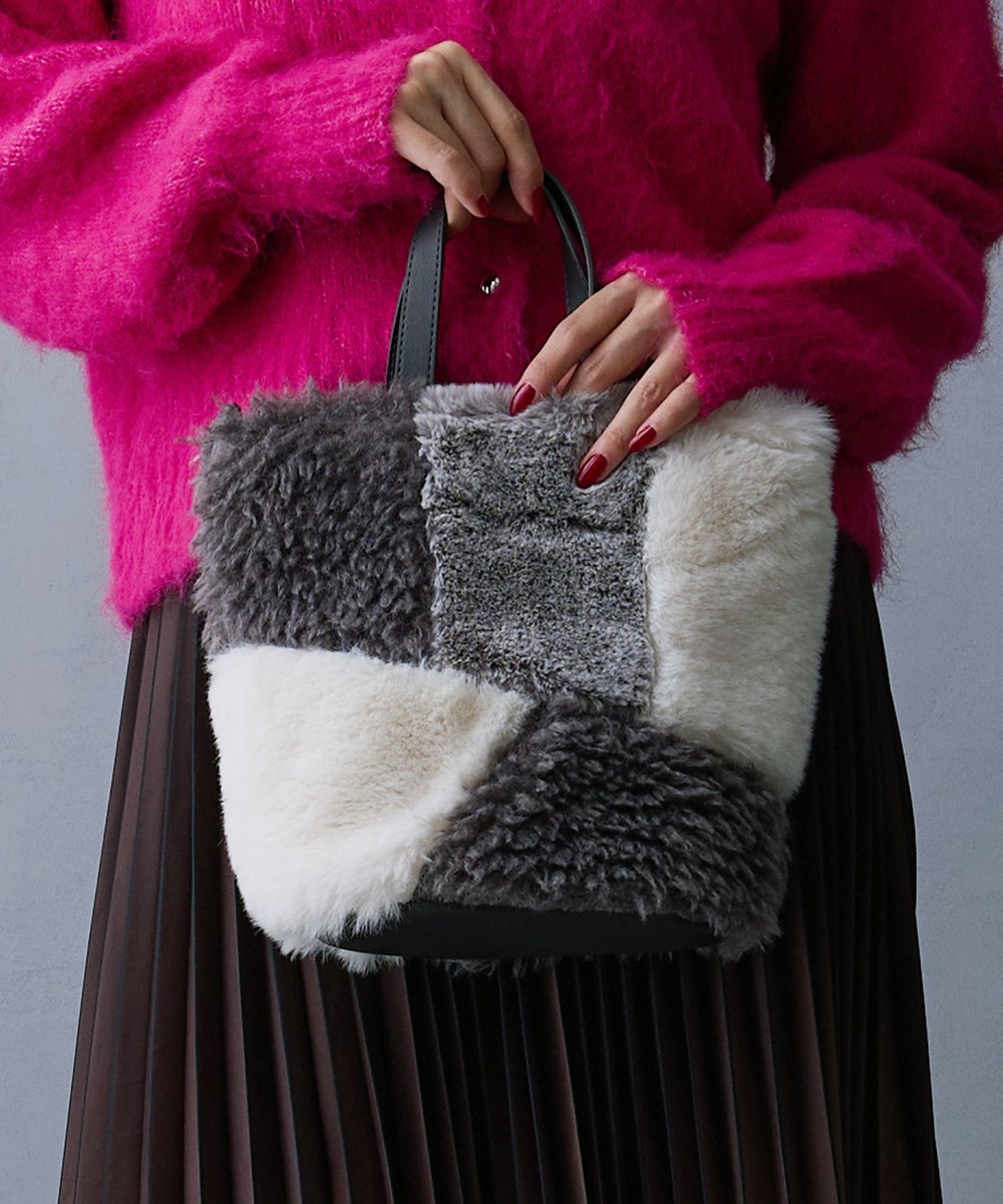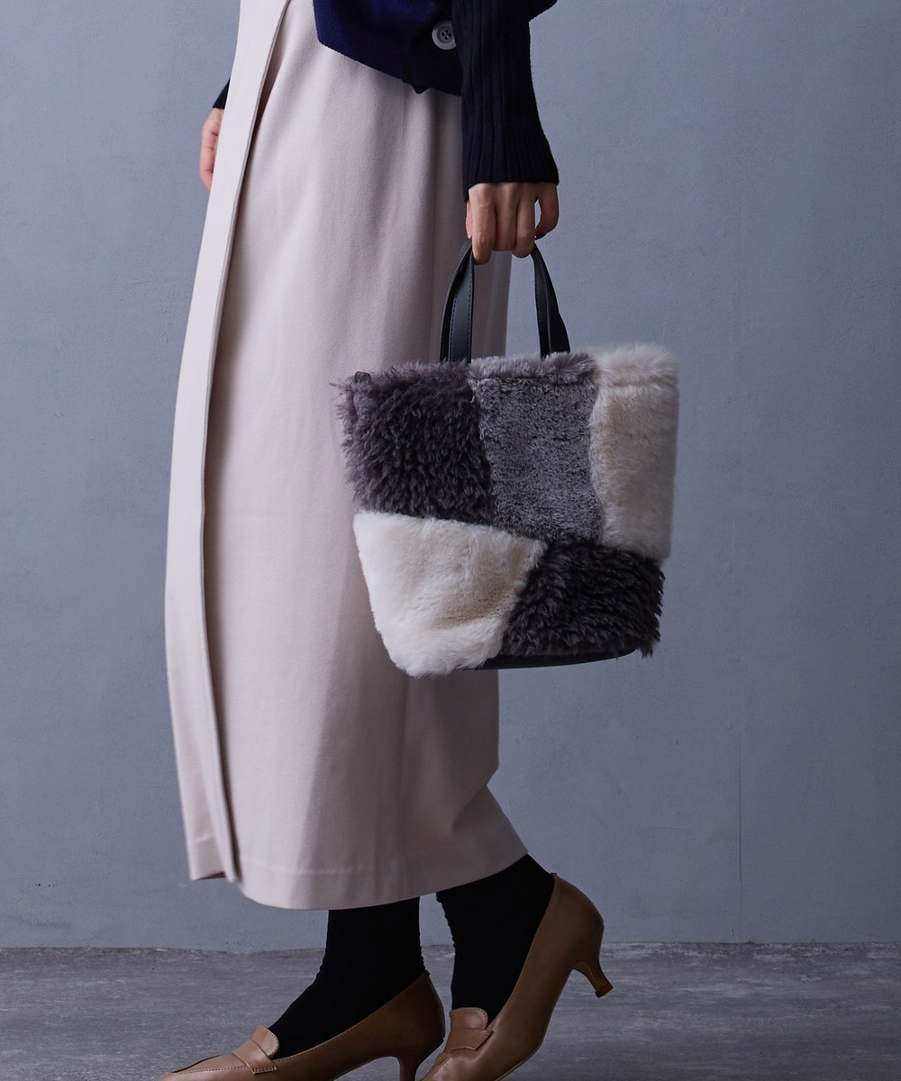 素材の違うフェイファーをパネル状にしたデザインバッグ。