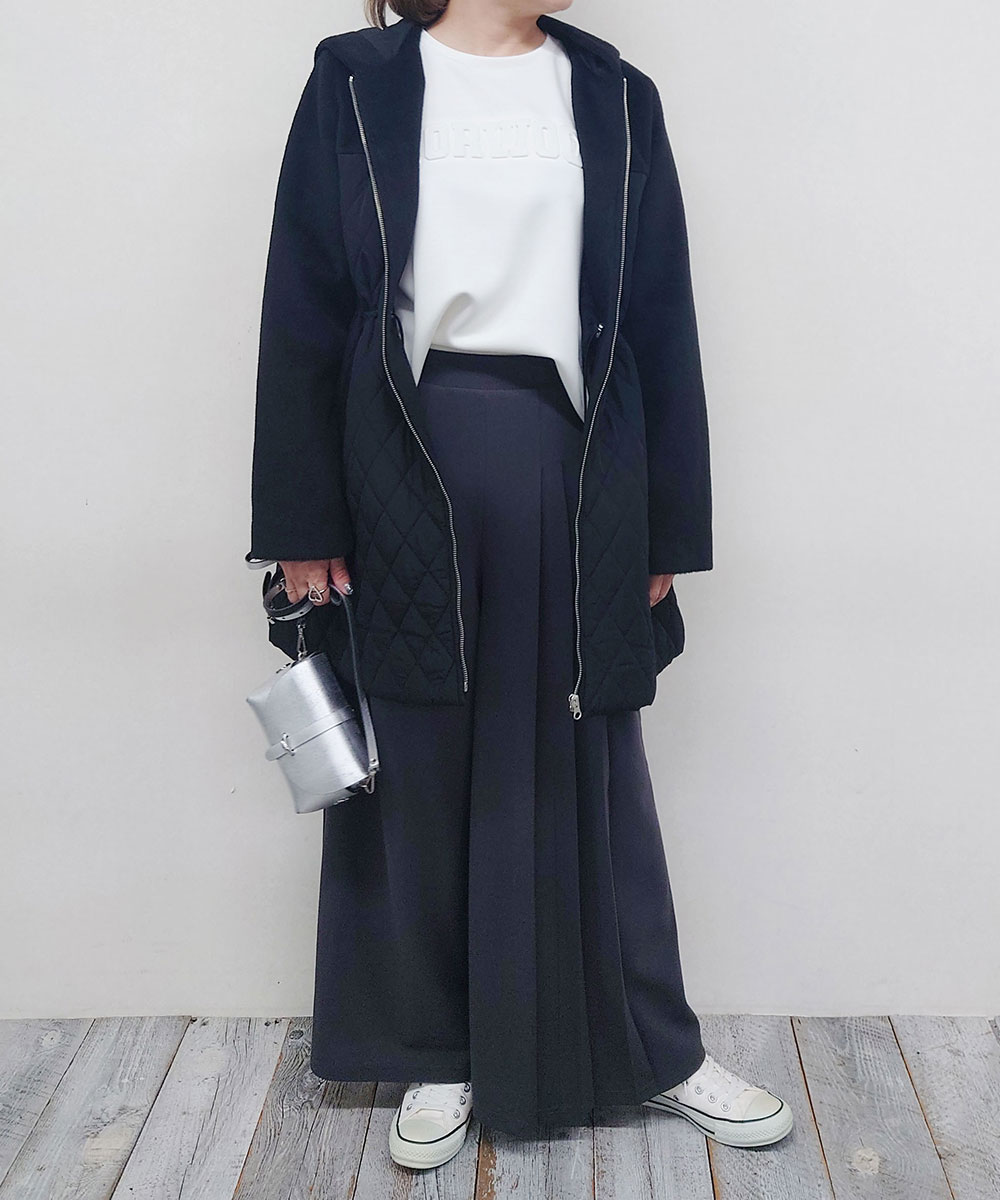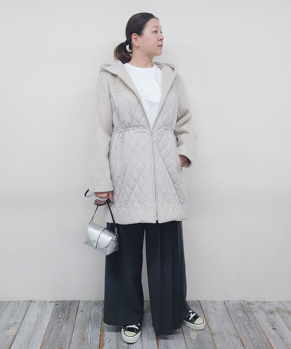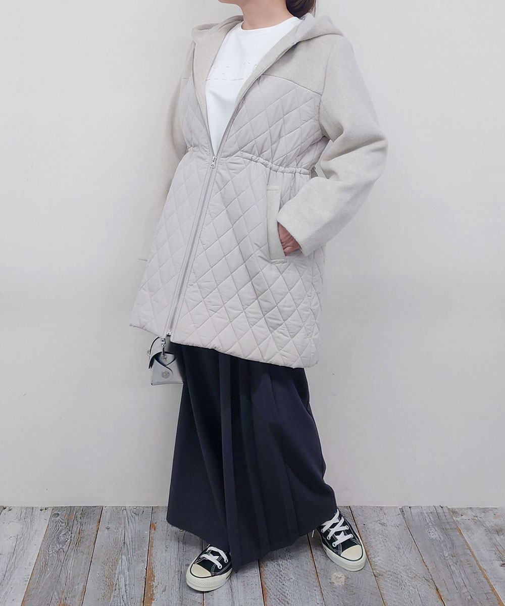 ふっくらとした柔らかい風合いが特徴のモッサ風の素材とカジュアルなキルト素材を切替えた、ZIPフードコートです。