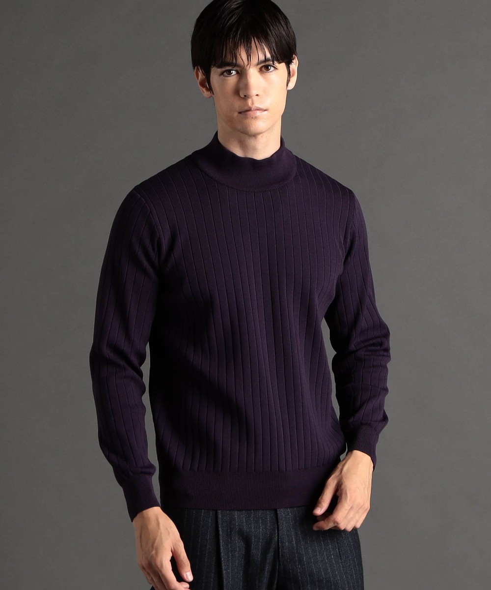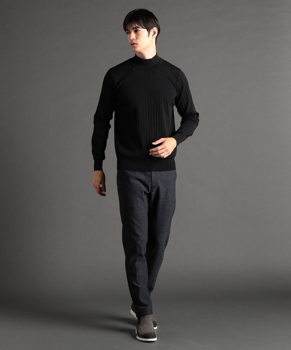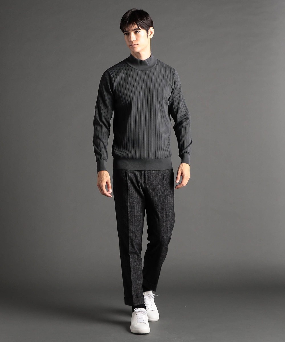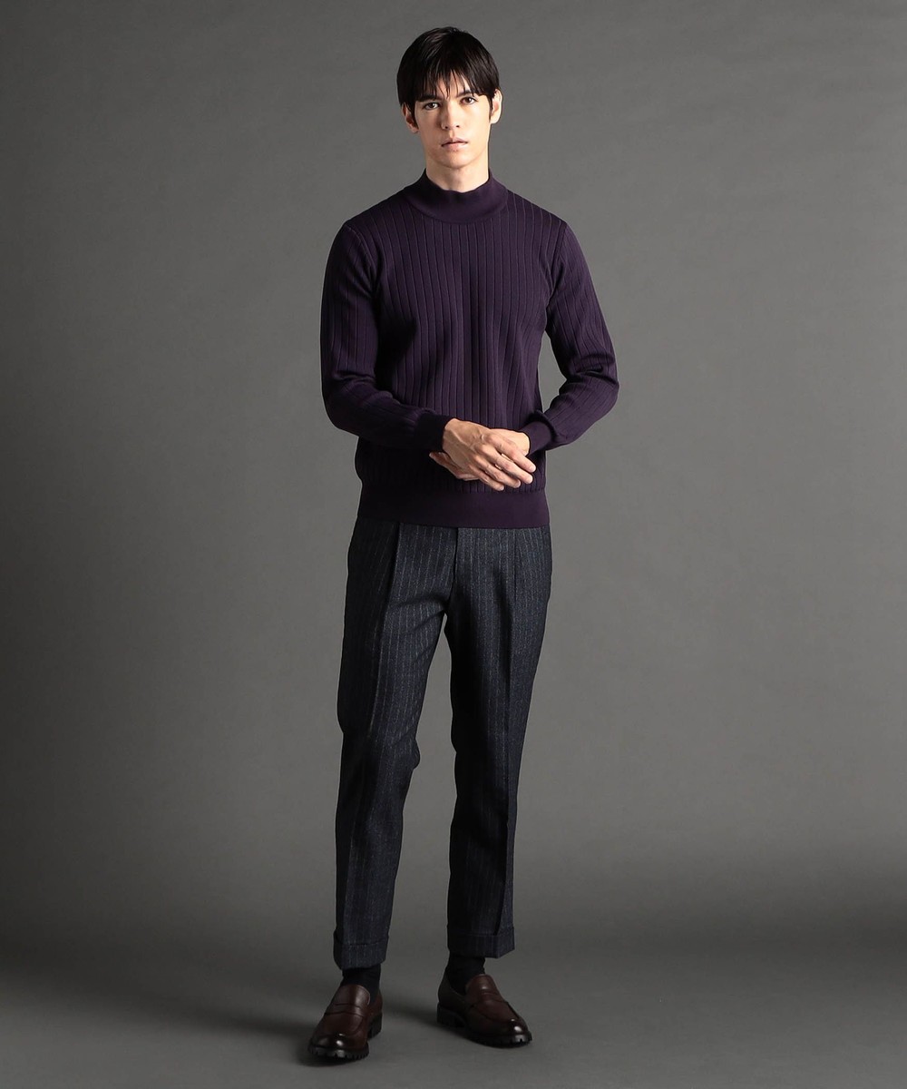 細かいストライプ、程よい高さのモックネックが上品な大人カジュアルを演出。