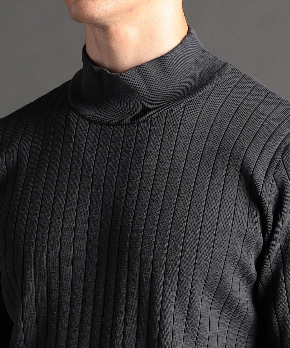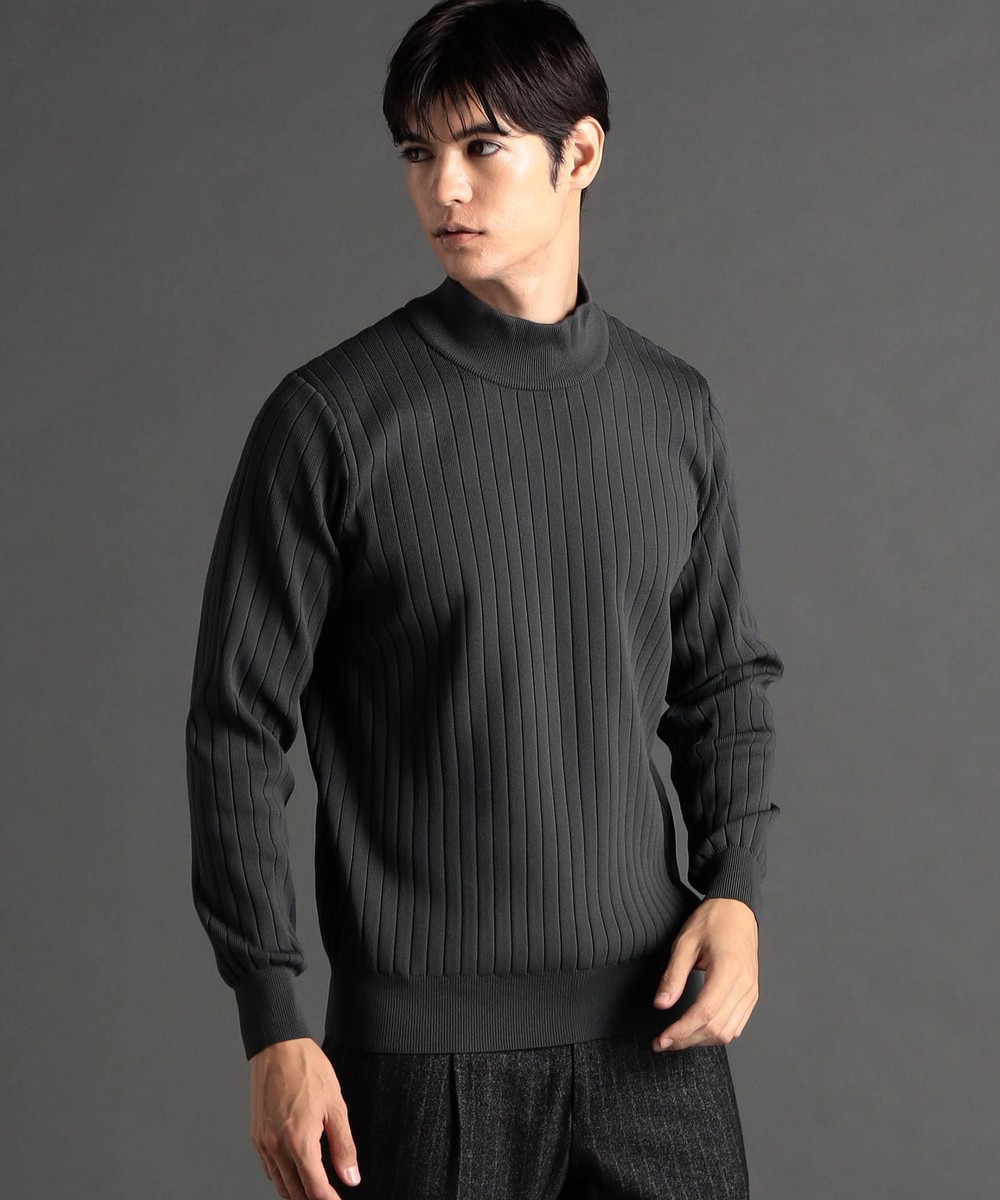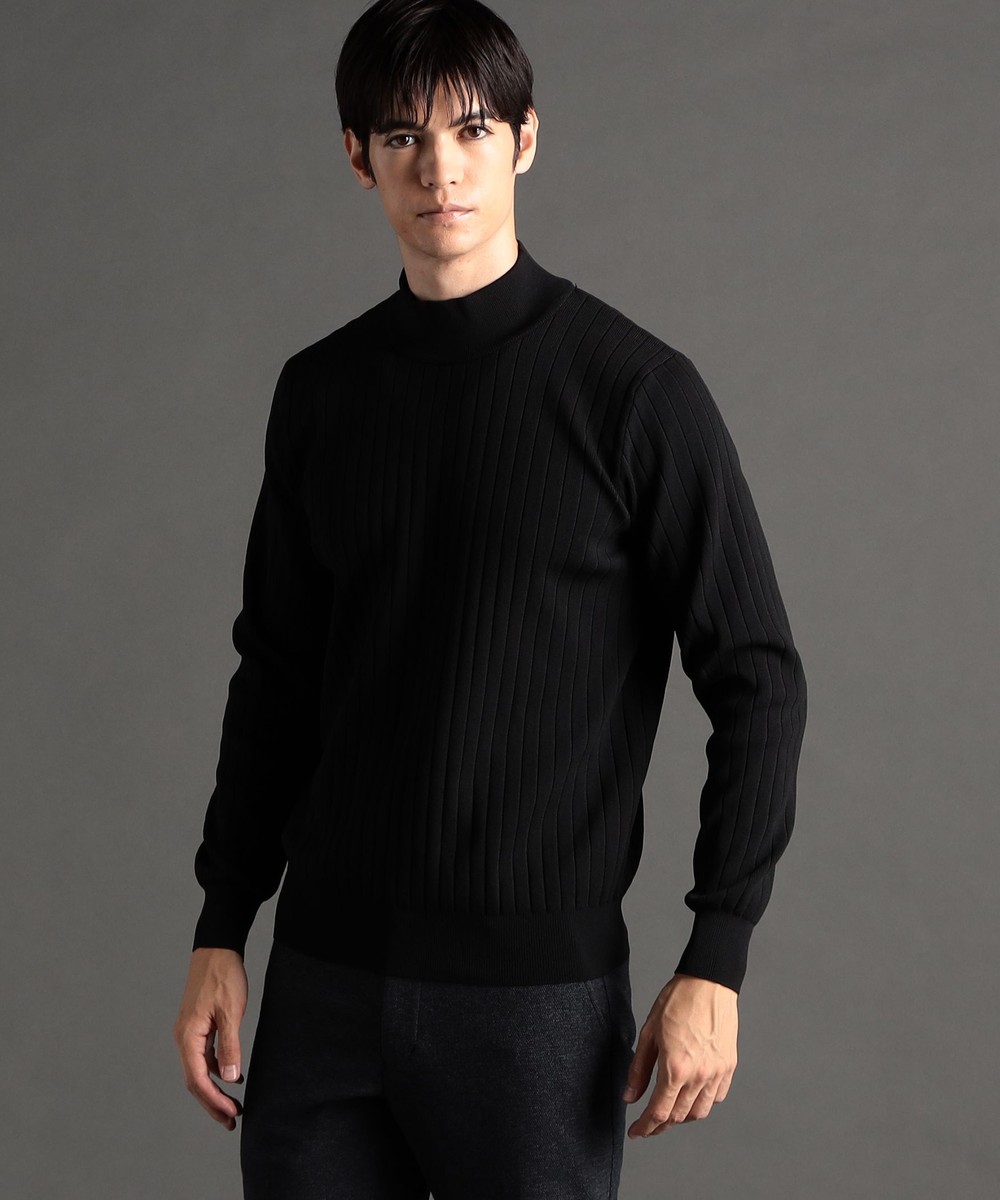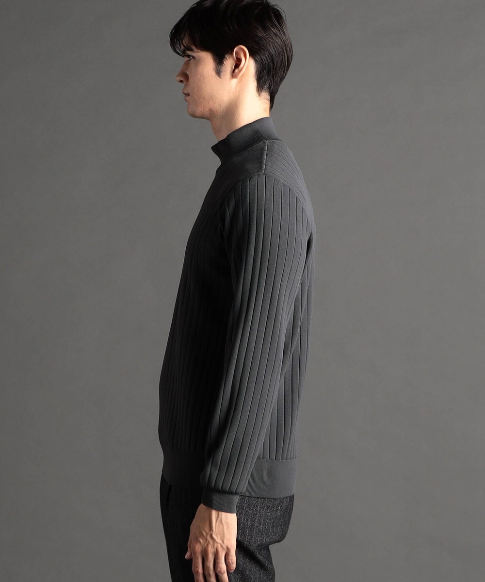 細かいストライプ、程よい高さのモックネックが上品な大人カジュアルを演出。