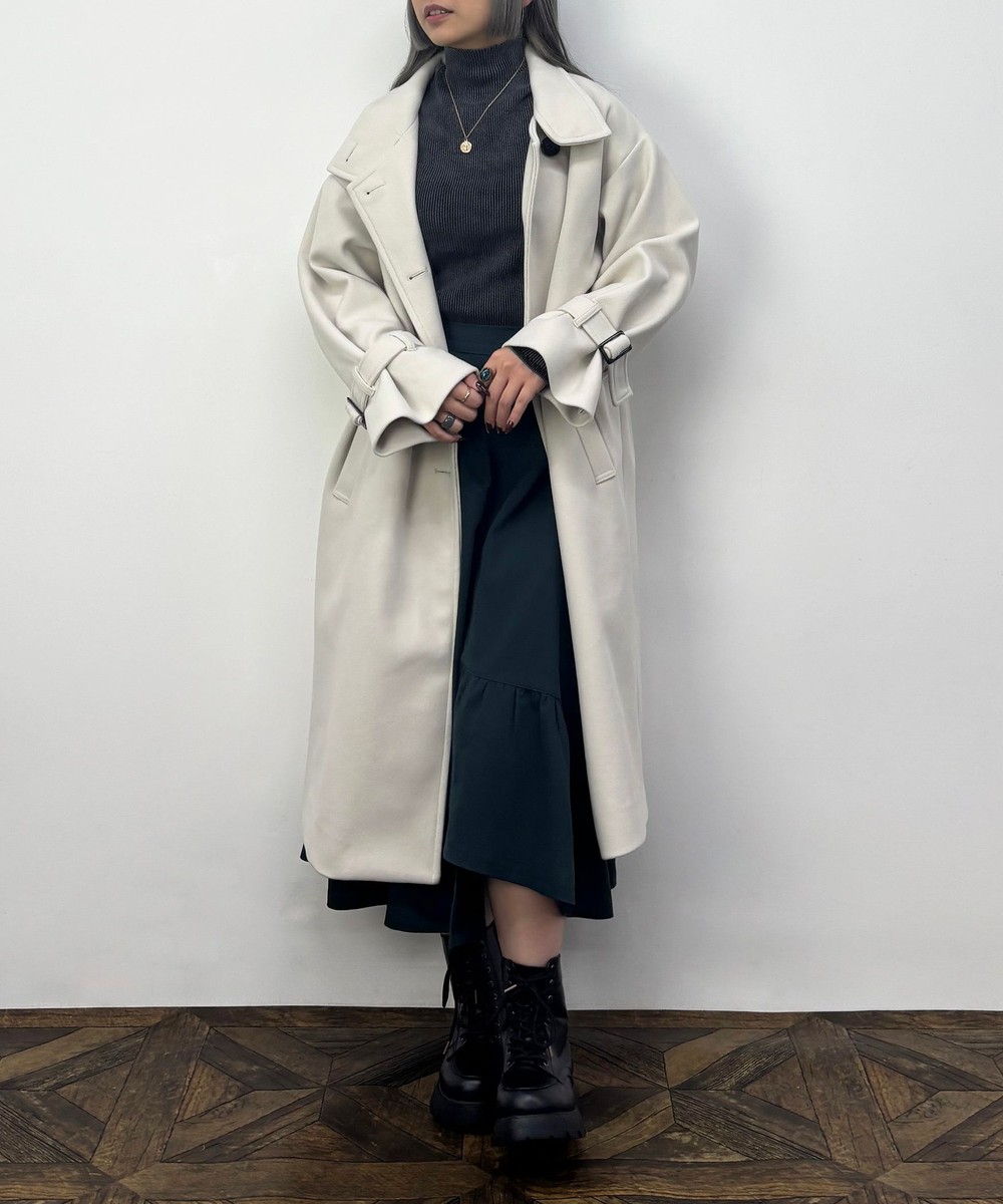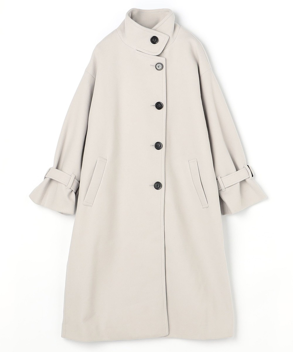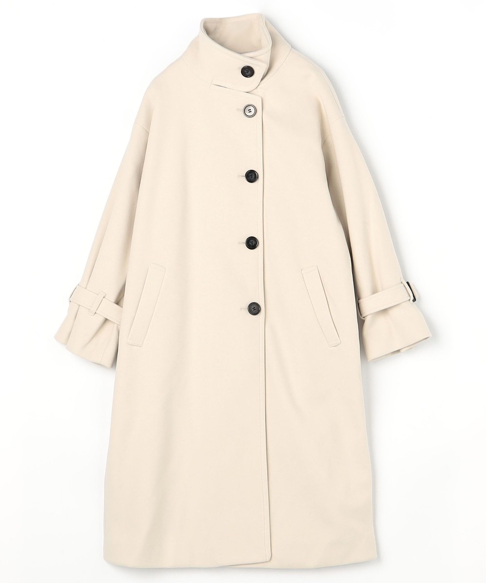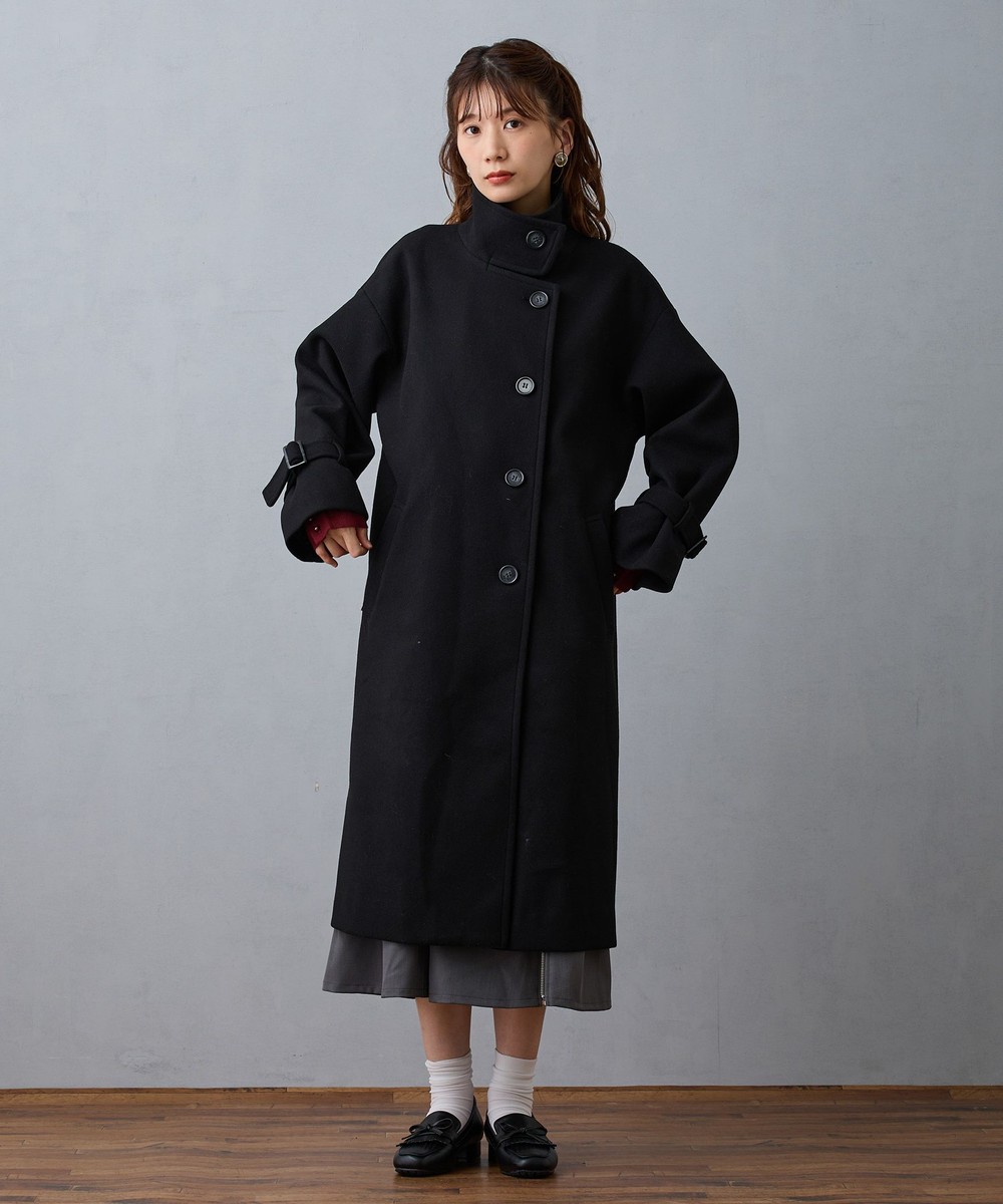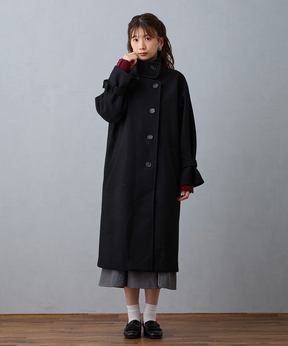 大きめのスタンドカラーがポイントのロングコートは、羽織るだけで一気にこなれ感が出てお洒落な印象に。