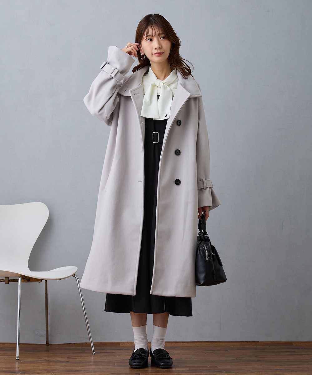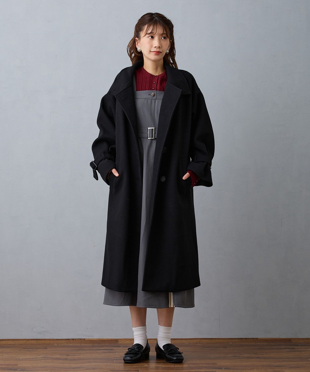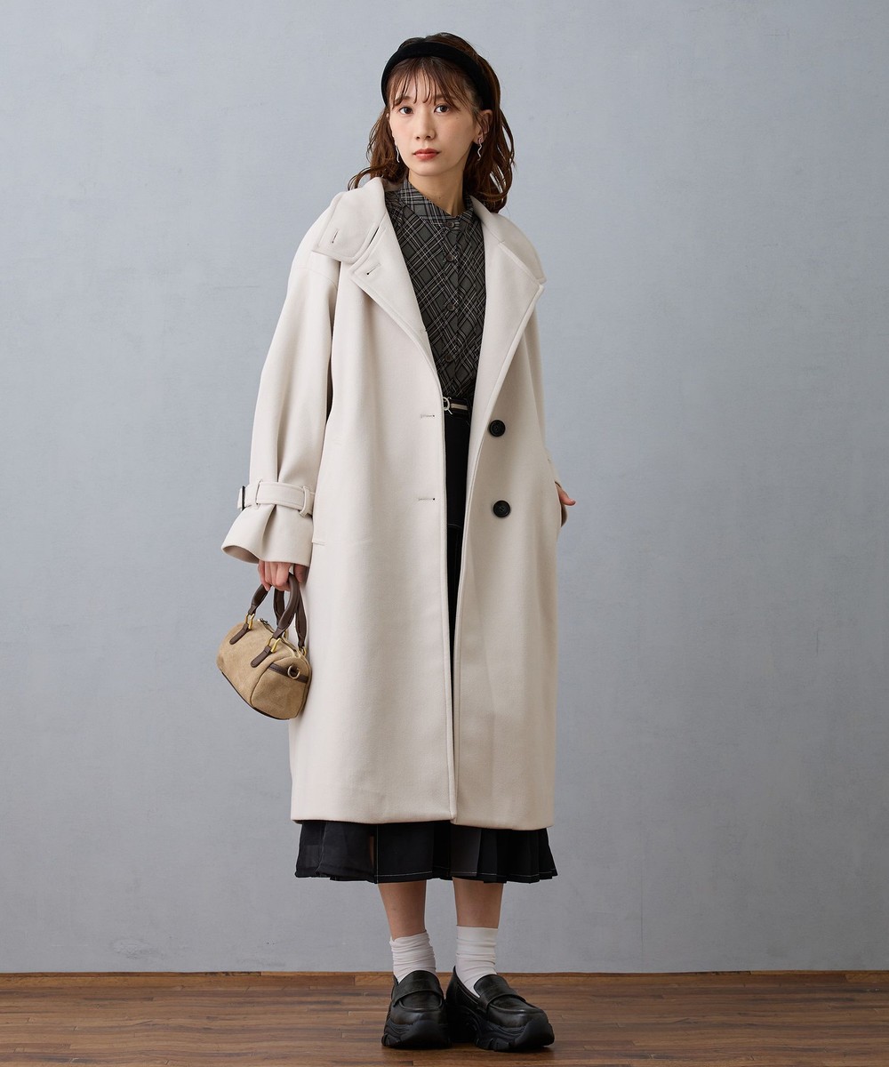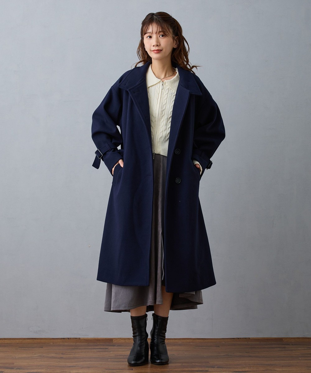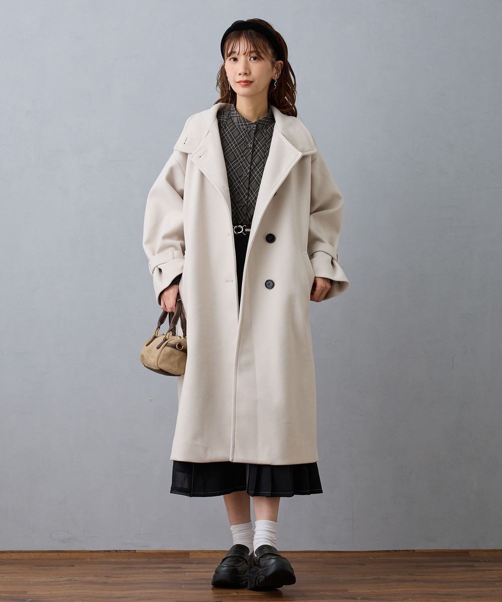 大きめのスタンドカラーがポイントのロングコートは、羽織るだけで一気にこなれ感が出てお洒落な印象に。