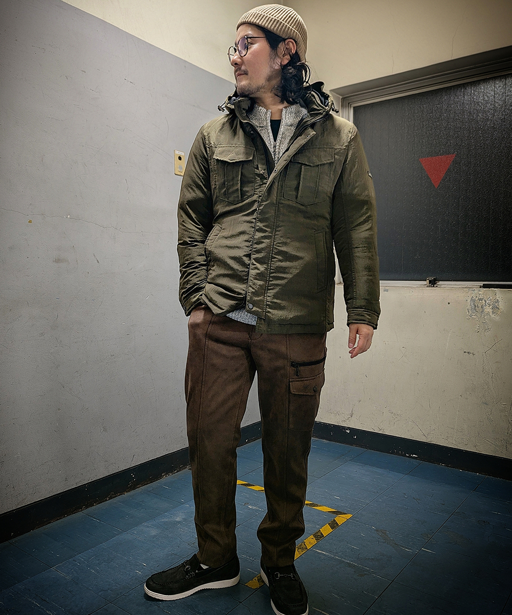 M-65デザインの軽量ダウンブルゾン。薄くて軽い表地、高周波キルトを施した裏地にダウンを入れた3層構造になります。フロントの釦止めをしやすくした持ち出し仕様や、胸のWパッチポケットがデザインポイント。ブラックファスナーやオリジナルドット釦、メタル調ネームをアクセントに、着脱出来るフード仕様など細かいディテールまで拘っています。内ポケットは両身に玉縁ポケットとパッチポケットを設けています。