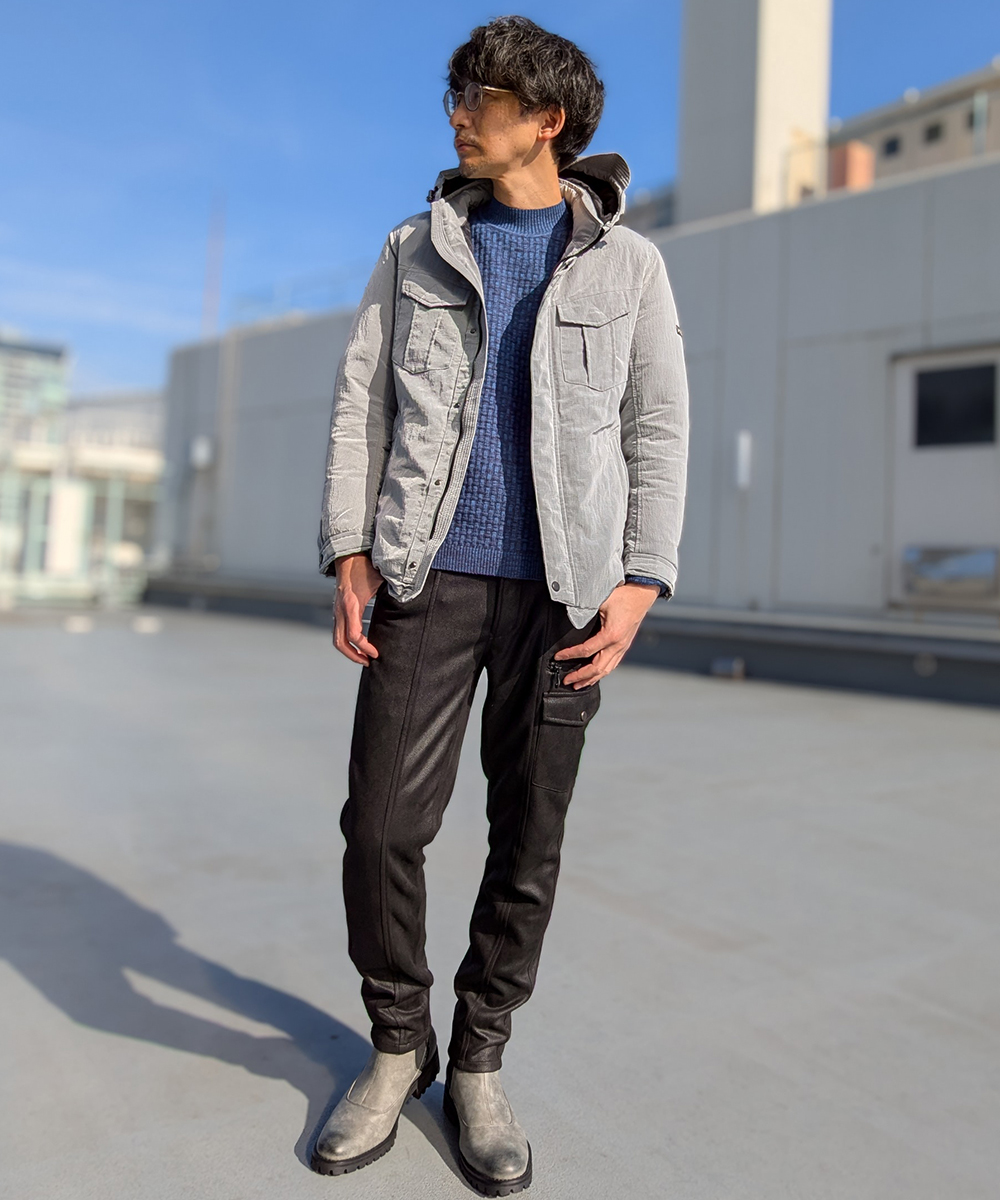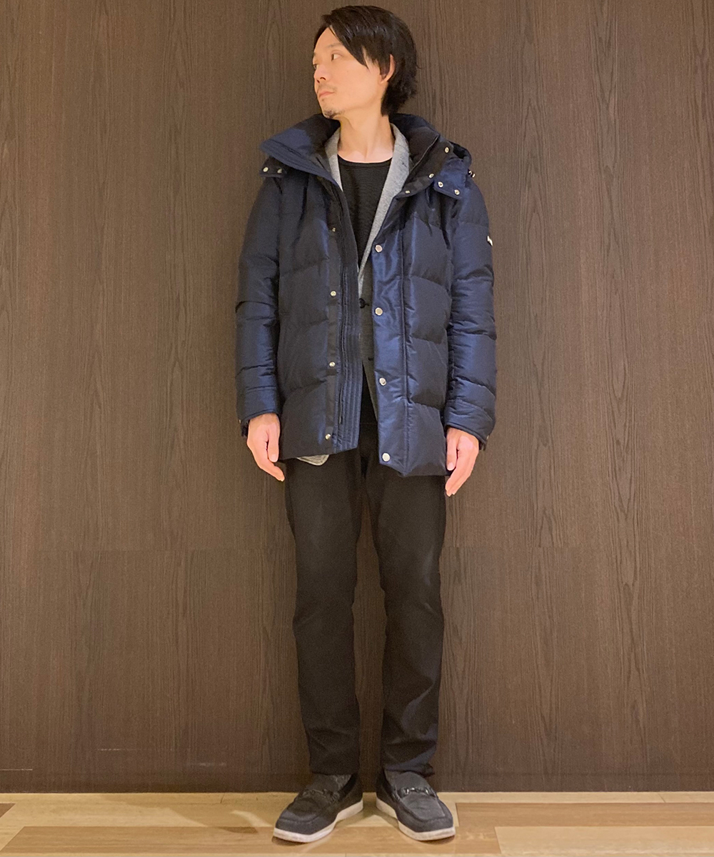 ローゲージのニットも着れるくらいに肩廻りとアームホール廻りを少し大きく設定した、少しゆとりのあるサイズ感です。程良くウエストシェイプさせた綺麗なシルエットに作っていますが、後ろのタブで更にシェイプ感の調整も出来ます。ダウンステッチが入っていない分、内側にダウンのふくらみを感じますので、見た目よりもジャストな印象に感じますのでご注意ください。