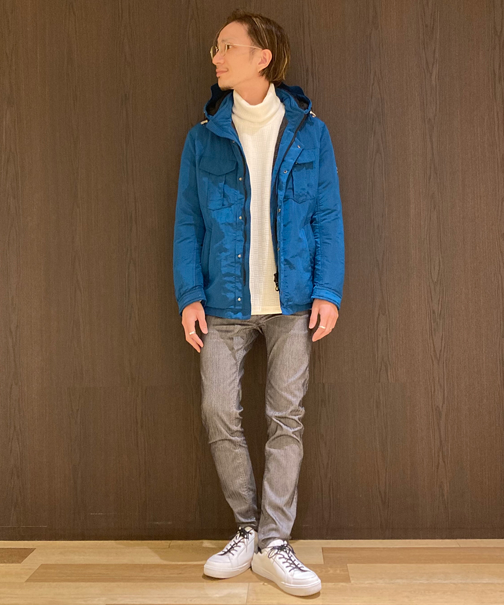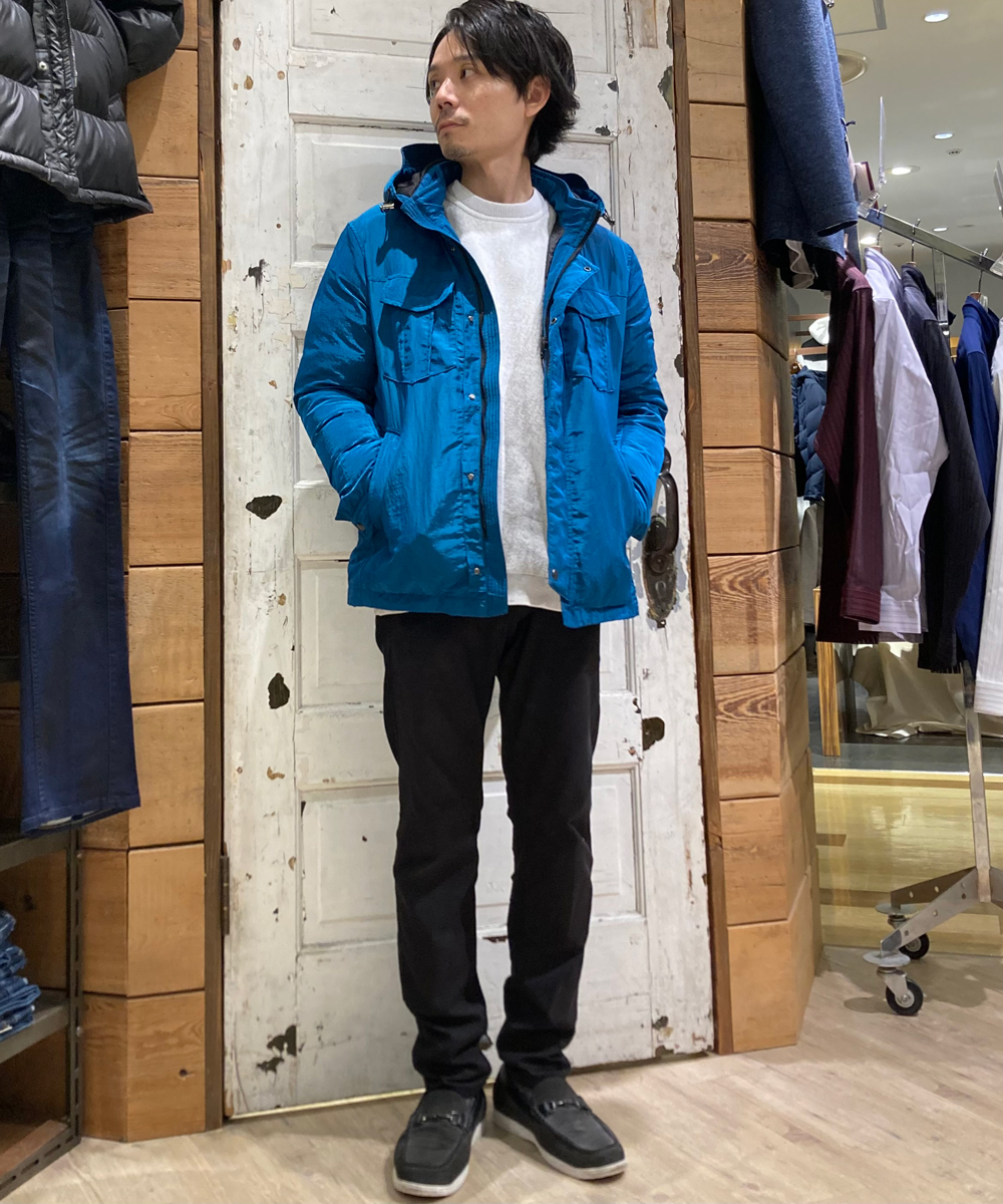 薄手のナイロンリップストップ素材。糸の番手違いによるポコポコしたオウトツ感と陰影感のある光沢感を出し、薄手で軽量だけど強度もある素材になります。中身のダウンには550フィルパワーのホワイトダックダウンを採用、高周波裏地を使用しているので、かさ増し感、ふくらみ感を凄い感じると思います。衿やカフスなどの小パーツにはシートタイプの中わたを採用して型崩れしにくくしています。