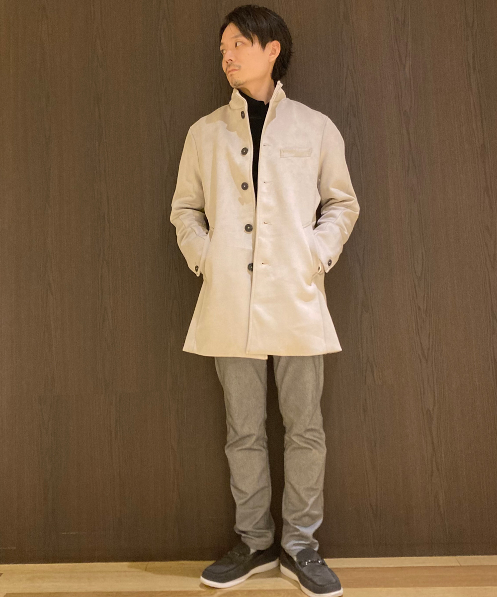 着脱可能なベストライナーを付けたスタンドカラーのコート。衿端にはワイヤーを入れ、その衿部分は折り返してラペルとしても綺麗に収まる設定です。切り替えを入れた前振りのツイスト3枚袖は動きやすくてシルエットも綺麗、袖口は本切羽仕様です。左胸ポケットはフェイクチーフ仕様、腰ポケットは斜めに作り使いやすくしています。上まで釦止めが出来るので防風性も高く、ストレッチ裏地を採用した総裏仕様なので着心地も抜群です。前裏などチラッと見える部分にはジャカード裏地を使い、ちょっとしたアクセントにしています。ベストライナーはファスナーで簡単に着脱可能。キルティング加工を施した保温性の高い機能中わたを採用しています。