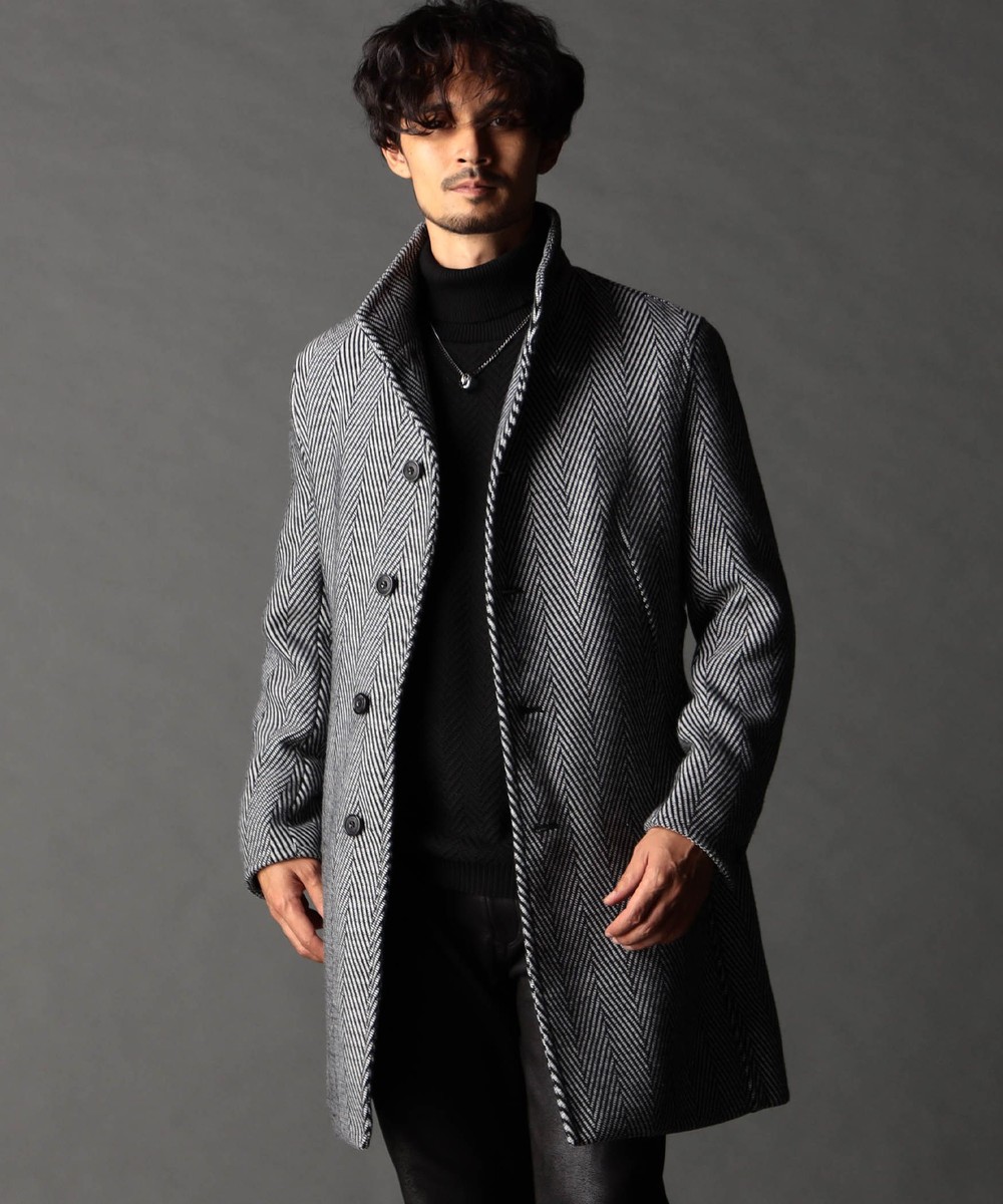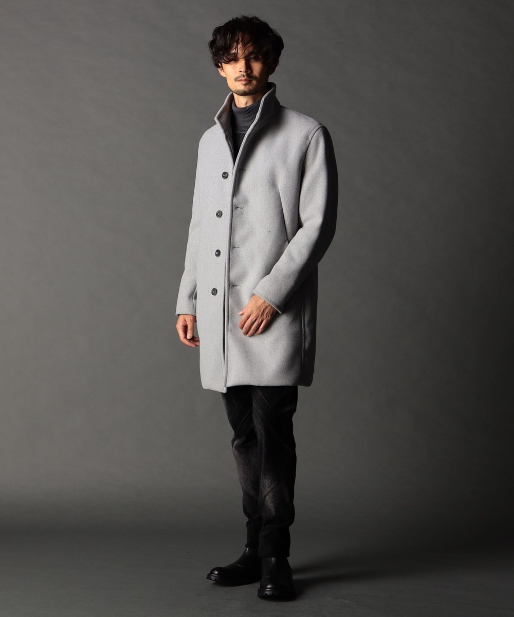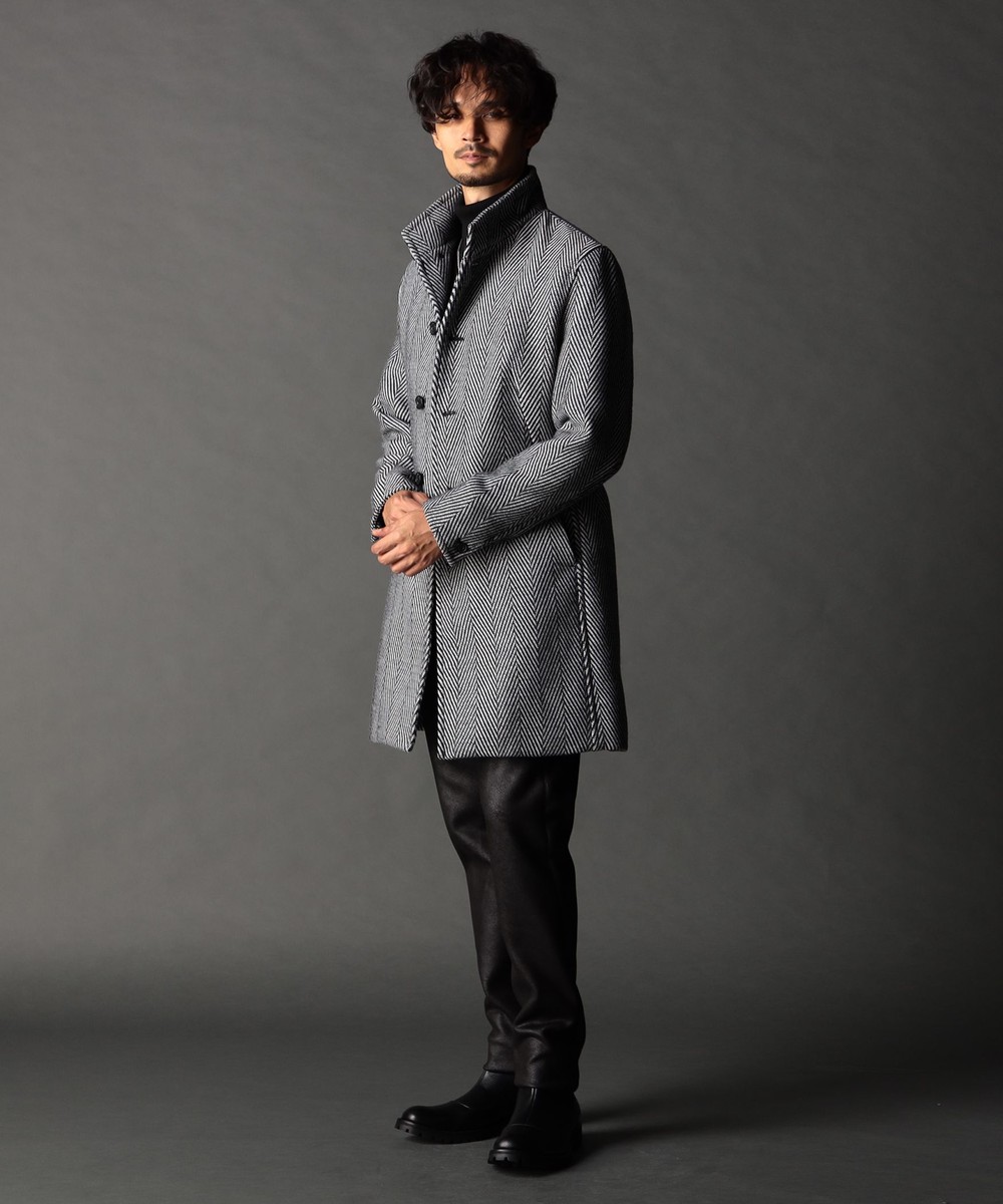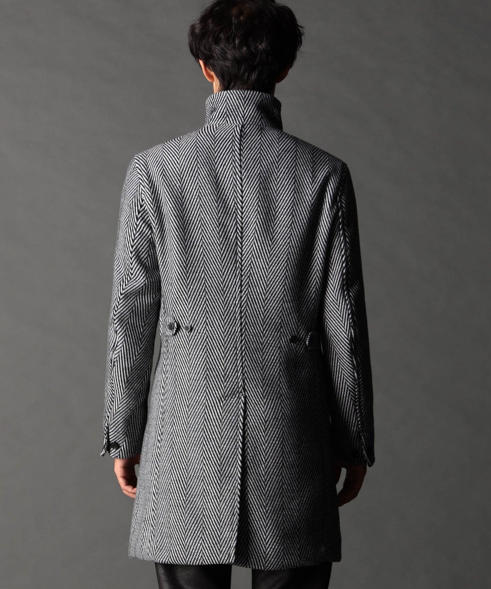 ビジカジ対応も可能なスタンドカラーのコート。ミニマムなデザインとシャープなシルエットなのでスタリングしやすいです。衿端にはワイヤーを入れていますのでVゾーンを綺麗に見せれます。その衿部分は折り返してラペルとしても綺麗に収まる設定です。袖口は本切羽仕様で、身返しを表地にしていますので折り返して遊べます。腰ポケットはダーツを利用したスラッシュポケットで斜めに作っていますので使いやすく、内ポケットは大きめのパッチポケットと、胸辺りに身返しとの切り替えを利用したスラッシュポケットを両身に配置しています。上まで釦止めが出来るので防風性も高く、保温性の高い裏地を採用した総裏仕様なので防寒性も良いです。